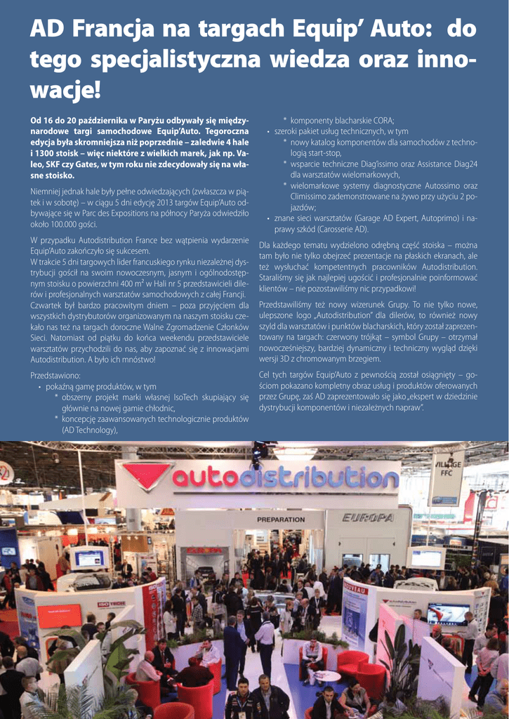 AD Francja na targach Equip’ Auto: do tego specjalistyczna wiedza oraz innowacje! Od 16 do 20 października w Paryżu odbywały się międzynarodowe targi samochodowe Equip’Auto. Tegoroczna edycja była skromniejsza niż poprzednie – zaledwie 4 hale i 1300 stoisk – więc niektóre z wielkich marek, jak np. Valeo, SKF czy Gates, w tym roku nie zdecydowały się na własne stoisko. Niemniej jednak hale były pełne odwiedzających (zwłaszcza w piątek i w sobotę) – w ciągu 5 dni edycję 2013 targów Equip’Auto odbywające się w Parc des Expositions na północy Paryża odwiedziło około 100.000 gości. W przypadku Autodistribution France bez wątpienia wydarzenie Equip’Auto zakończyło się sukcesem. W trakcie 5 dni targowych lider francuskiego rynku niezależnej dystrybucji gościł na swoim nowoczesnym, jasnym i ogólnodostępnym stoisku o powierzchni 400 m² w Hali nr 5 przedstawicieli dilerów i profesjonalnych warsztatów samochodowych z całej Francji. Czwartek był bardzo pracowitym dniem – poza przyjęciem dla wszystkich dystrybutorów organizowanym na naszym stoisku czekało nas też na targach doroczne Walne Zgromadzenie Członków Sieci. Natomiast od piątku do końca weekendu przedstawiciele warsztatów przychodzili do nas, aby zapoznać się z innowacjami Autodistribution. A było ich mnóstwo! Przedstawiono: • pokaźną gamę produktów, w tym * obszerny projekt marki własnej IsoTech skupiający się głównie na nowej gamie chłodnic, * koncepcję zaawansowanych technologicznie produktów (AD Technology), 20 * komponenty blacharskie CORA; • szeroki pakiet usług technicznych, w tym * nowy katalog komponentów dla samochodów z technologią start-stop, * wsparcie techniczne Diag’issimo oraz Assistance Diag24 dla warsztatów wielomarkowych, * wielomarkowe systemy diagnostyczne Autossimo oraz Climissimo zademonstrowane na żywo przy użyciu 2 pojazdów; • znane sieci warsztatów (Garage AD Expert, Autoprimo) i naprawy szkód (Carosserie AD). Dla każdego tematu wydzielono odrębną część stoiska – można tam było nie tylko obejrzeć prezentacje na płaskich ekranach, ale też wysłuchać kompetentnych pracowników Autodistribution. Staraliśmy się jak najlepiej ugościć i profesjonalnie poinformować klientów – nie pozostawiliśmy nic przypadkowi! Przedstawiliśmy też nowy wizerunek Grupy. To nie tylko nowe, ulepszone logo „Autodistribution” dla dilerów, to również nowy szyld dla warsztatów i punktów blacharskich, który został zaprezentowany na targach: czerwony trójkąt – symbol Grupy – otrzymał nowocześniejszy, bardziej dynamiczny i techniczny wygląd dzięki wersji 3D z chromowanym brzegiem. Cel tych targów Equip’Auto z pewnością został osiągnięty – gościom pokazano kompletny obraz usług i produktów oferowanych przez Grupę, zaś AD zaprezentowało się jako „ekspert w dziedzinie dystrybucji komponentów i niezależnych napraw”.