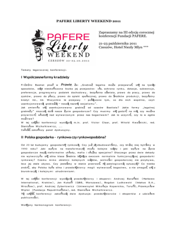 PAFERE LIBERTY WEEKEND 2011 Zapraszamy na III edycję corocznej konferencji Fundacji PAFERE. 21-23 października 2011 Czeszów, Hotel Niezły Młyn *** Te mat y tegoroc z n e j kon fe re n c j i: I Współczesne formy kradzieży Fr éd éric Bastiat pisa ł w Prawie, że: „G rab ie ż legalna mo ż e przeja w i a ć si ę na tysi ąc sposobó w, stąd niesk o ń czo na licz ba jej przeja w ó w : c ła, ochro na rynk u, dotac je, sub we n c j e, preferenc je, progres y w n y podate k docho d o w y , bezp łatna o ś wiata, pra w o do prac y, pra w o do zysk ó w , pra w o do p łacy, pra w o do opiek i spo łecznej, pra w o do środk ó w produ k c j i, bezp łatn y kred y t itd., itd. Wsz y s t k i e te przeja w y – po łączone ty m, co dla nich wspó l n e, czyli usank c j o n o w a n ą grabie żą – nosz ą naz w ę socjaliz m u ”. Jak zmien i ł a się usank c j o n o w a n a grabie ż od czasó w Bastiata? Jakie for m y „legal nej grabie ż y” niszcz ą dzi ś nasze życie gospodarc z e? Czy musi m y si ę godz i ć na ni ą, czy mo żna prz y w r ó c i ć w ł adz ę nad wy t w a r z a n y m przez nas bogact w e m? Jak to ucz y n i ć, czy to w ogóle mo ż li w e? W tej cz ęści kon fe re n c j i w yst ą pi ą m.in. prof. V ic t o r Claar, prof. W i t o l d K w a śnic k i, red. Stanis ł a w M i c h a l k i e w i c z , …. Ca ł o ść zako ń cz y panel dysk us y j n y . II Polska gospodarka – rynkowa czy rynkowopodobna? Od 20 lat buduje m y gospo da r k ę rynk o w ą . Cz y ju ż j ą zbud o w a l i ś m y, czy bli żej niej byli ś m y w 1990 rok u? Jaki wp ł y w na transfo r m a c j ę mia ł y kolejne rz ądy i jaki wp ł y w na życie gospodar c z e maj ą niefor m a l n e uk ł ady, mafia i s łu żby specjal ne? Dlac ze g o przez dw ie dekad y nie wy t w o r z y ł a się silna klasa średnia b ęd ąca ow oc e m nor ma l n i e funk c j o n u j ą cej gospodar k i ryn k o w e j? Cze m u mi m o obietni c kolejn y c h rz ądó w, wol n o ś ci gospo da rc z ej nie prz y b y w a, lecz jej stale uby w a. Czy jeste ś m y w stanie przer w a ć t ę patol o g i c z n ą sytuac j ę? Co trzeba zrobi ć , aby Polska by ł a silna i przedsi ę biorc y mog l i wy t w a r z a ć bogact w o, a nie zmaga ć si ę z biuro k r a c j ą i kolejn y m i utrud n ie n i a m i. W tej cz ęści kon fe re n c j i w yst ą pi ą przedsi ę bior c y i eksperc i: A n d r z e j Bara ński (Herbe w o Internat i o n a l, K ra k ó w), Jan K u ba ń (QBS, Wa rsza w a), Bog da n Lud k o w s k i (Intak us S.A., W r o c ł a w), prof. A n d r z e j Zy bert o w i c z (Uni w ers y tet M i k o ł aja K o p er n i k a, Toru ń), Prze m y s ła w W i p l e r (Fundac ja Repu b l i k a ń ska), red. Stanis ł a w M i c h a l k i e w i c z . Tę część konfere n c j i zako ń cz ą dwie dysk us je: przedsi ę bio rc ó w i ekspertó w z udzia łe m public z n o ś c i. Wst ę pny har m o n o g r a m konferen c j i: Piątek, 21 października Godz. 16:00-22:00 Przy jaz d do Czeszo w a, zak w a ter o w a n i e Godz. 20:00 K o la c ja Godz. 20:45 Pokaz fil m u Godz. 22:00-24:00 D ys k us je Sobota, 22 października Godz. 8:00-9:00 Śniadanie Godz. 9:00-9:20 Ofic ja l ne ot wa rc ie kon fe re n c j i, podz i ę k o w a n i e dla sponsor ó w Godz. 9:30 Cz ęść I Ws p ó ł czes ne for m y kradz ie ż y Godz. 9:30 1. wyst ą pienie (podatk i) Godz. 10:00 2. wyst ą pienie (Inflacja) Godz. 10:30 3. wyst ą pienie (dług publ ic z n y) Godz. 1 1:00-1 1:30 Przer w a kaw o w a Godz. 1 1:30- 12:00 4. w yst ą pien ie (biurok ra c ja) Godz. 12:00-12:30 5. w yst ą pien ie (Spraw ie d l i w o ść spo łeczna i pa ństw o opiek u ńcze) Godz. 12:30-13:00 6 w yst ą pien ie (korupc ja) Godz. 13:00-13:1 5 Przer w a kaw o w a Godz. 13:1 5- 13:45 7. w yst ą pien ie (system bank o w y) Godz. 13:45-14:1 5 8. w yst ą pien ie (monop o le i oligo p o l e) Godz. 14:1 5- 15:1 5 Obiad Godz. 15:1 5- 16:30 D ys k us ja podsu m o w u j ą ca Godz. 16:30-17:00 Przer w a Godz. 17:00-18:00 Panel na temat kry z y s ó w finans o w y c h Godz. 18:00-20:00 Przer w a (mo ż li w o ść pop ł y w a n i a w basenie, skorz y stan ia z sauny, odno w y biol o g i c z n e j, spacer) Godz. 20:00-23:00 Ban k i et Niedziela, 23 października Godz. Godz. Godz. Godz. Godz. Godz. Godz. Godz. Godz. Godz. Godz. Godz. 8:00-9:00 Śniadanie 9:00 Cz ęść II Polska gospodar k a – ryn k o w a czy rynk o w o p o d o b n a? 9:00-9:30 1. w yst ą pien ie 9:30-10:00 2. w yst ą pien ie 10:00-10:30 3. w yst ą pien ie 10:30-1 1:00 przer w a ka w o w a 1 1:00-1 1:30 4. w yst ą pien ie 1 1:30- 12:30 D ys k us ja z udzia ł e m przedsi ę bio rc ó w 12:30-13:00 Przer w a kaw o w a 13:00-14:30 D ys k us ja z udzia ł e m prelegent ó w 14:30 Obiad 15:30 Zak o ń czenie kon fe re n c j i Warunki udziału w konferencji Udz ia ł w konferen c j i jest p łatny. Ca ł ko w i t y koszt udzia ł u w konfere n c j i z zak w ater o w a n i e m na dwa noclegi (z pi ą tku na sobot ę oraz z sobot y na niedz ie l ę), pe łny m wy ż y w i e n i e m, udzia ł e m w bank iec ie oraz korz y stan ie m ze wsz yst k i c h w y g ó d dost ępny c h w Hotel u Niez ł y M ł y n*** a tak ż e we wsz yst k i c h wy da r z e n i ac h w ramac h III edyc ji konferen c j i P A F E R E LI B E R T Y W E E K E N D wy n os i 329,00 PLN przy rejestrac j i do ko ń ca wrze ś nia 201 1 r. Rejestrac ja i wn ies ien ie op ł aty po 30 wrze ś nia 201 1 r. w y n os i 369,00PLN . Ze wz g l ę dó w organi zac y j n y c h, prosi m y o mo ż li w i e jak naj w c z e ś niejsz ą rejestrac j ę. Hotel Niez ł y M ł y n*** oferuje go ś cio m kon feren c j i P A F E R E LI B E R T Y W E E K E N D bezp ł atne korz y stan ie z basenu, jacuz z i, sauny, udost ępnia ro wer y, a tak że oferu je (za dodat k o w ą op ł at ą) masa ż e i zabieg i SP A. Ponie w a ż okoli c e Czeszo w a to najpi ę k niejs za przy r o d n i c z o i histor y c z n i e cz ęść Dol n e g o Śląs