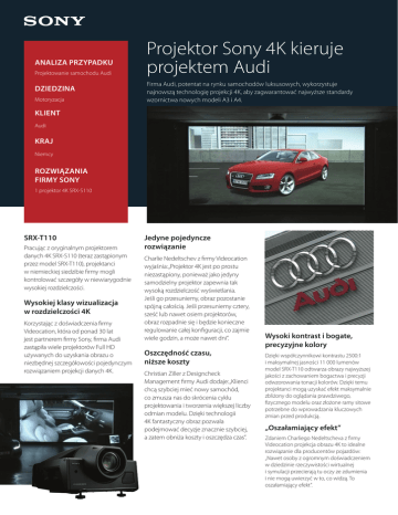 ANALIZA PRZYPADKU Projektowanie samochodu Audi DZIEDZINA Motoryzacja Projektor Sony 4K kieruje projektem Audi Firma Audi, potentat na rynku samochodów luksusowych, wykorzystuje najnowszą technologię projekcji 4K, aby zagwarantować najwyższe standardy wzornictwa nowych modeli A3 i A4. KLIENT Audi KRAJ Niemcy ROZWIĄZANIA FIRMY SONY 1 projektor 4K SRX-S110 SRX-T110 Pracując z oryginalnym projektorem danych 4K SRX-S110 (teraz zastąpionym przez model SRX-T110), projektanci w niemieckiej siedzibie firmy mogli kontrolować szczegóły w niewiarygodnie wysokiej rozdzielczości. Wysokiej klasy wizualizacja w rozdzielczości 4K Korzystając z doświadczenia firmy Videocation, która od ponad 30 lat jest partnerem firmy Sony, firma Audi zastąpiła wiele projektorów Full HD używanych do uzyskania obrazu o niezbędnej szczegółowości pojedynczym rozwiązaniem projekcji danych 4K. Jedyne pojedyncze rozwiązanie Charlie Nedeltschev z firmy Videocation wyjaśnia: „Projektor 4K jest po prostu niezastąpiony, ponieważ jako jedyny samodzielny projektor zapewnia tak wysoką rozdzielczość wyświetlania. Jeśli go przesuniemy, obraz pozostanie spójną całością. Jeśli przesuniemy cztery, sześć lub nawet osiem projektorów, obraz rozpadnie się i będzie konieczne regulowanie całej konfiguracji, co zajmie wiele godzin, a może nawet dni”. Oszczędność czasu, niższe koszty Christian Ziller z Designcheck Management firmy Audi dodaje: „Klienci chcą szybciej mieć nowy samochód, co zmusza nas do skrócenia cyklu projektowania i tworzenia większej liczby odmian modelu. Dzięki technologii 4K fantastyczny obraz pozwala podejmować decyzje znacznie szybciej, a zatem obniża koszty i oszczędza czas”. Wysoki kontrast i bogate, precyzyjne kolory Dzięki współczynnikowi kontrastu 2500:1 i maksymalnej jasności 11 000 lumenów model SRX-T110 odtwarza obrazy najwyższej jakości z zachowaniem bogactwa i precyzji odwzorowania tonacji kolorów. Dzięki temu projektanci mogą uzyskać efekt maksymalnie zbliżony do oglądania prawdziwego, fizycznego modelu oraz złożone ramy sitowe potrzebne do wprowadzania kluczowych zmian przed produkcją. „Oszałamiający efekt” Zdaniem Charliego Nedeltscheva z firmy Videocation projekcja obrazu 4K to idealne rozwiązanie dla producentów pojazdów: „Nawet osoby z ogromnym doświadczeniem w dziedzinie rzeczywistości wirtualnej i symulacji przecierają tu oczy ze zdumienia i nie mogą uwierzyć w to, co widzą. To oszałamiający efekt”.