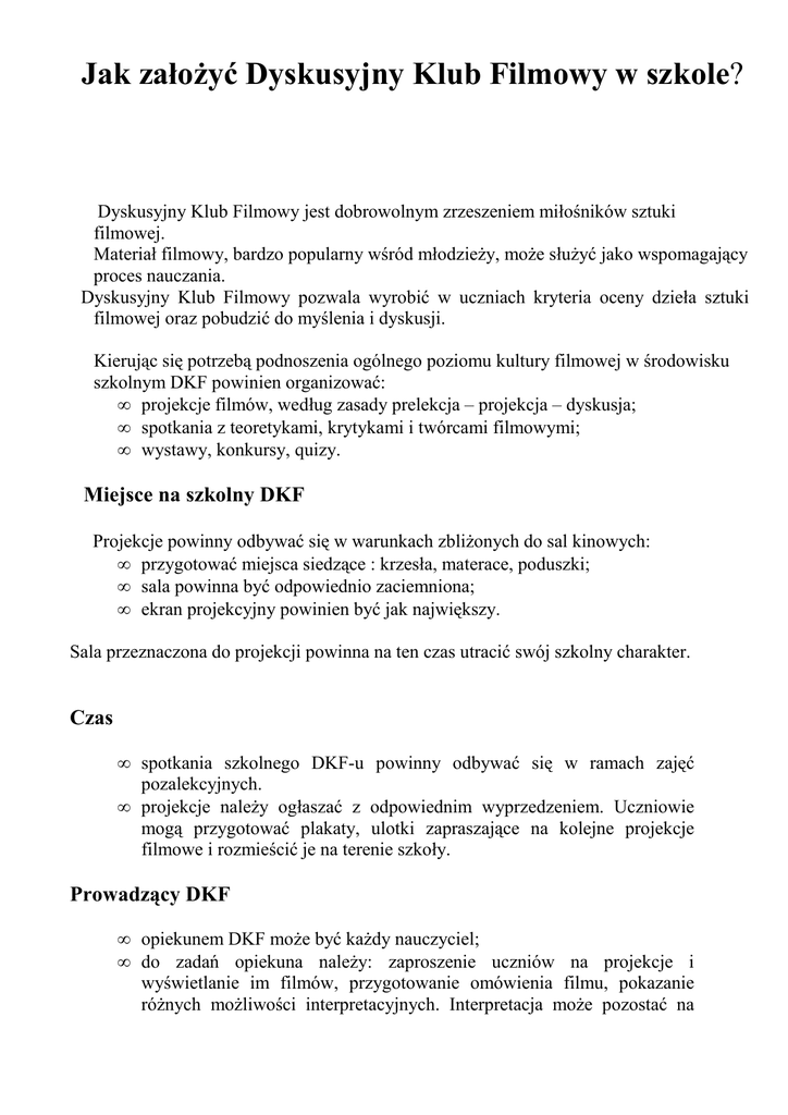 Jak założyć Dyskusyjny Klub Filmowy w szkole? Dyskusyjny Klub Filmowy jest dobrowolnym zrzeszeniem miłośników sztuki filmowej. Materiał filmowy, bardzo popularny wśród młodzieży, może służyć jako wspomagający proces nauczania. Dyskusyjny Klub Filmowy pozwala wyrobić w uczniach kryteria oceny dzieła sztuki filmowej oraz pobudzić do myślenia i dyskusji. Kierując się potrzebą podnoszenia ogólnego poziomu kultury filmowej w środowisku szkolnym DKF powinien organizować: • projekcje filmów, według zasady prelekcja – projekcja – dyskusja; • spotkania z teoretykami, krytykami i twórcami filmowymi; • wystawy, konkursy, quizy. Miejsce na szkolny DKF Projekcje powinny odbywać się w warunkach zbliżonych do sal kinowych: • przygotować miejsca siedzące : krzesła, materace, poduszki; • sala powinna być odpowiednio zaciemniona; • ekran projekcyjny powinien być jak największy. Sala przeznaczona do projekcji powinna na ten czas utracić swój szkolny charakter. Czas • spotkania szkolnego DKF-u powinny odbywać się w ramach zajęć pozalekcyjnych. • projekcje należy ogłaszać z odpowiednim wyprzedzeniem. Uczniowie mogą przygotować plakaty, ulotki zapraszające na kolejne projekcje filmowe i rozmieścić je na terenie szkoły. Prowadzący DKF • opiekunem DKF może być każdy nauczyciel; • do zadań opiekuna należy: zaproszenie uczniów na projekcje i wyświetlanie im filmów, przygotowanie omówienia filmu, pokazanie różnych możliwości interpretacyjnych. Interpretacja może pozostać na poziomie fabuły, kontekstów historycznych i społecznych, analizy psychologicznej głównych bohaterów. Podstawowa Zasada DKF-u • zasada dobrowolności uczestnictwa, uczestniczyć może każdy bez podpisywania listy obecności i stawiania stopni; • uczeń ma prawo wyjść podczas projekcji jeśli film nie spełnia jego oczekiwań. Program DKF-u • pokazy filmowe można ujmować w cykle, tak aby pobudzać uczniów do dyskusji. Mogą one być poświęcone historii filmu, kierunkom i szkołom, gatunkom filmowym, problemom estetycznym, wybitnym indywidualnościom, zjawiskom społecznym, politycznym, historycznym itp.; • można opracować listę tematów , według której będą odbywały się projekcje. Taką listę można przedyskutować z uczniami; • lista powinna być przygotowywana raz przez opiekuna a następnym razem przez uczniów. Przykładowy zarys organizacji pokazu filmowego w ramach DKF-u : • przygotowanie ogłoszeń o terminie projekcji filmu „ Pret-a-porter” Roberta Altmana • (data, godzina, sala) i rozmieszczenie ich na terenie szkoły; • pokaz wykonania makijażu i układania fryzur gwiazd filmowych; • prelekcja opiekuna DKF-u – filmografia Roberta Altmana, kilka informacji dotyczących produkcji filmu „ Pret-a-porter”; • projekcja filmu; • dyskusja – problemy: jaki jest świat mody ukazany okiem kamery reżysera, gra pozorów, dlaczego dyktaturze mody ulega więcej ludzi niż argumentom politycznych haseł i ideologii; portrety psychologiczne kreatorów mody i słynnych modelek; mozaikowa konstrukcja fabuły. Aleksandra Zdaniewicz Zespół Szkół Technicznych nr 2 W Chorzowie
