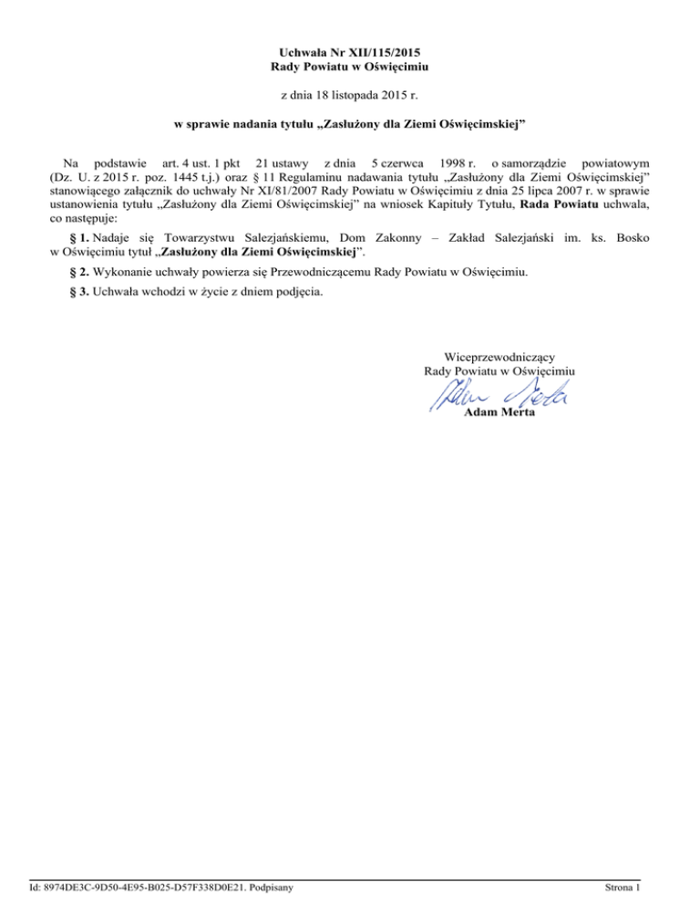 Uchwała Nr XII/115/2015 Rady Powiatu w Oświęcimiu z dnia 18 listopada 2015 r. w sprawie nadania tytułu „Zasłużony dla Ziemi Oświęcimskiej” Na podstawie art. 4 ust. 1 pkt 21 ustawy z dnia 5 czerwca 1998 r. o samorządzie powiatowym (Dz. U. z 2015 r. poz. 1445 t.j.) oraz § 11 Regulaminu nadawania tytułu „Zasłużony dla Ziemi Oświęcimskiej” stanowiącego załącznik do uchwały Nr XI/81/2007 Rady Powiatu w Oświęcimiu z dnia 25 lipca 2007 r. w sprawie ustanowienia tytułu „Zasłużony dla Ziemi Oświęcimskiej” na wniosek Kapituły Tytułu, Rada Powiatu uchwala, co następuje: § 1. Nadaje się Towarzystwu Salezjańskiemu, Dom Zakonny – Zakład Salezjański im. ks. Bosko w Oświęcimiu tytuł „Zasłużony dla Ziemi Oświęcimskiej”. § 2. Wykonanie uchwały powierza się Przewodniczącemu Rady Powiatu w Oświęcimiu. § 3. Uchwała wchodzi w życie z dniem podjęcia. Wiceprzewodniczący Rady Powiatu w Oświęcimiu Adam Merta Id: 8974DE3C-9D50-4E95-B025-D57F338D0E21. Podpisany Strona 1 Uzasadnienie Zgodnie z uchwałą Nr XI/81/2007 Rady Powiatu w Oświęcimiu z dnia 25 lipca 2007 r. w sprawie ustanowienia tytułu „Zasłużony dla Ziemi Oświęcimskiej”, „Kapituła Tytułu” na posiedzeniu w dniu 14 października 2015 r. pozytywnie rozpatrzyła wniosek, przedstawiając poniższe uzasadnienie. Początek działalności Towarzystwa Salezjańskiego na Ziemi Oświęcimskiej datuje się na rok 1898 i wiąże się z założeniem w Oświęcimiu pierwszej na ziemiach Polskich placówki krzewiącej idee wychowawcze ks. Jana Bosko (1815-1888). Przez ponad wiek swej obecności w Oświęcimiu Salezjanie edukują kolejne pokolenia młodzieży kształtując jej postawy moralne, patriotyczne i społeczne. Wielkość salezjańskiego systemu wychowawczego, określanego powszechnie jako zapobiegawczy (prewencyjny) polega w równym stopniu na oryginalności pomysłu, jaki na odkryciu potrzeby miłości wychowawczej jako odpowiedzi na pragnienie każdej osoby, żeby „kochać i być kochanym”. Wychowanie, zdaniem ks. Bosko, to nie tylko egzekwowanie systemu nakazów i zakazów, ale przede wszystkim stała, życzliwa obecność wychowawcy przy wychowanku, która ma uchronić go (zapobiec) przed zajściem na niewłaściwą drogę. Jan Bosko posiadał bogate przymioty naturalne, które dysponowały go do nawiązywania kontaktów osobistych. Odznaczał się znakomitą kulturą humanistyczną, wspieraną wysoką inteligencją i pamięcią. Kierunek jego pracy uściślał się dzięki przebywaniu wśród młodzieży, czy to czasie studiów, czy już po święceniach kapłańskich, a zwłaszcza w okresie zakładania oratoriów jako centrów wychowawczych. Oratoria te miały pełnić dla młodych ludzi rolę domu, w którym mogli zamieszkać, szkoły, w której uczyli się zawodu, boiska, na którym spędzali wolny czas oraz kościoła, w którym się modlili. W tym sensie stały się one instytucjami zupełnie nowatorskimi, a co najważniejsze – odpowiadającymi na aktualne potrzeby młodzieży, dając jej do ręki zawód, a zarazem otwierając na Boga i wartości wyższe. Ks. Bosko już za życia stał się człowiekiem sławnym, utrzymując dobre relacje zarówno z władzami kościelnymi jak i państwowymi, co w kontekście panujących wtedy we Włoszech nastrojów antyklerykalnych było swoistym wyjątkiem. Szybko zgromadził wokół siebie grupę współpracowników, zarażonych jego pasją i charyzmatem. Wśród nich byli także Polacy, pochodzący zwłaszcza z terenów Galicji i Śląska. Punktem kulminacyjnym działalność wychowawczej ks. Bosko stało się założenie przez niego Towarzystwa Salezjeńskiego (1859), czyli zgromadzenia zakonnego, którego zadaniem jest troska o wychowanie młodych ludzi, zwłaszcza tych, których można określić mianem zaniedbanych czy szczególnie potrzebujących. W roku 1974 powstała żeńska gałąź zgromadzenia – Córka Maryi Wspomożycielki, czyli siostry salezjanki. Dzięki salezjanom, kontynuującym misję swojego założyciela, zapobiegawczy system wychowawczy Jana Bosko rozprzestrzenił się na cały świat. Obecnie ok. 16 tys. salezjanów pracuje niemal w 130 krajach, prowadząc różnego typu placówki edukacyjne: oratoria, centra młodzieżowe, szkoły, internaty, warsztaty, domy rekolekcyjne, ośrodki sportowe oraz świetlice parafialne. Wszystkie one, oparte na systemie prewencyjnym, stawiają sobie za cel zintegrowanie w sobie funkcji czterech instytucji mających wpływ na pełny rozwój młodego człowieka: domu, szkoły, kościoła oraz boiska. Początki obecności salezjanów w Oświęcimiu związane są z osobą ks. Andrzeja Knycza, proboszcza w pobliskiej Polance Wielkiej. Kiedy ks. Knycz poważnie zachorował, zwrócił się listownie do ks. Bosko, którego sława dotarła już do Polski, z prośbą o modlitwę w intencji wyzdrowienia. Ks. Bosko własnoręcznie odpisał choremu, zapewniając go o modlitwie oraz prosząc, by ten pamiętał równocześnie o Zgromadzeniu Salezjańskim. Id: 8974DE3C-9D50-4E95-B025-D57F338D0E21. Podpisany Strona 1 Po wyzdrowieniu ks. Knycz został mianowany przez kardynała Jana Puzynę proboszczem w Oświęcimiu, gdzie dał się poznać jako gorliwy duszpasterz, zatroskany o poziom moralny i status materialny parafian. Szczególnie ubolewał nad profanacją dawnego klasztoru dominikańskiego, który po kasacie przeszedł w ręce społeczności żydowskiej i był odtąd używany jako magazyn. Ks. Knycz postanowił wykupić zaniedbany zabytek i przekazać go zgromadzeniu zakonnemu. Ze zrozumiałych względów wybór padł na salezjanów, którzy zostali zaproszeni do zorganizowania tam zakładu wychowawczego. Formalności przebiegły dość sprawnie, tak że już w roku 1898 przybył do Oświęcimia ks. Franciszek Trawiński, mianowany pierwszym dyrektorem tutejszej placówki. Przy wsparciu wiernych i miejscowego duchowieństwa diecezjalnego przystąpił do odbudowy ruin kościoła