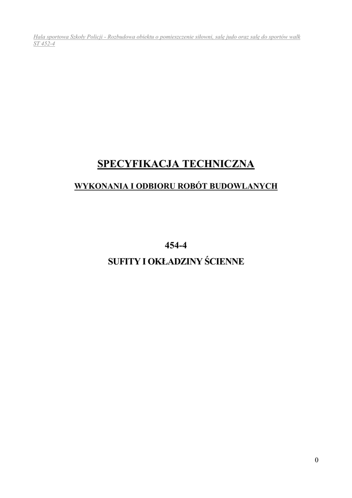 Hala sportowa Szkoły Policji - Rozbudowa obiektu o pomieszczenie siłowni, salę judo oraz salę do sportów walk ST 452-4 SPECYFIKACJA TECHNICZNA WYKONANIA I ODBIORU ROBÓT BUDOWLANYCH 454-4 SUFITY I OKŁADZINY ŚCIENNE 0 Hala sportowa Szkoły Policji - Rozbudowa obiektu o pomieszczenie siłowni, salę judo oraz salę do sportów walk ST 452-4 SPIS TREŚCI 1. WSTĘP............................................................................................................................................ 2 1.1. Przedmiot SST .......................................................................................................................... 2 1.2. Zakres stosowania ..................................................................................................................... 2 1.3. Określenia podstawowe ............................................................................................................ 2 1.4. Zakres robót objętych SST........................................................................................................ 2 1.5. Ogólne wymagania dotyczące robót ......................................................................................... 2 2. MATERIAŁY ................................................................................................................................. 2 2.1. Wymagania ogólne ................................................................................................................... 2 2.2. Materiały potrzebne do wykonania robót ................................................................................. 3 3. SPRZĘT .......................................................................................................................................... 6 3.1. Wymagania ogólne ................................................................................................................... 6 3.2. Sprzęt do wykonywania robót................................................................................................... 6 4. TRANSPORT ................................................................................................................................. 6 4.1. Wymagania ogólne ................................................................................................................... 6 4.2. Transport materiałów ................................................................................................................ 6 4.3. Przechowywanie i składowanie materiałów ............................................................................. 6 5. WYKONANIE ROBÓT ................................................................................................................ 7 5.1. Wymagania ogólne ................................................................................................................... 7 5.2. Warunki przystąpienia do robót ................................................................................................ 7 5.3. Montaż okładzin z płyt na ścianach na ruszcie ........................................................................ 7 5.4. Tyczenie rozmieszczenia płyt ................................................................................................... 8 5.5. Montaż sufitów podwieszonych z płyt gipsowo-kartonowych ................................................. 8 5.6. Szpachlowanie spoin ................................................................................................................. 9 6. KONTROLA JAKOŚCI ROBÓT .............................................................................................. 11 6.1. Wymagania ogólne ................................................................................................................. 11 6.2. Badania w czasie wykonywania robót .................................................................................... 11 7. OBMIAR ROBÓT ....................................................................................................................... 11 8. ODBIÓR ROBÓT ........................................................................................................................ 11 8.1. Ogólne zasady odbioru robót. ................................................................................................. 11 8.2. Odbiór podłoży ....................................................................................................................... 11 8.3. Zgodność z dokumentacją ....................................................................................................... 11 8.4. Wymagania przy odbiorze ...................................................................................................... 11 9. PODSTAWA PŁATNOŚCI ........................................................................................................ 12 10. PRZEPISY ZWIĄZANE ........................................................................................................... 12 1 Hala sportowa Szkoły Policji - Rozbudowa obiektu o pomieszczenie siłowni, salę judo oraz salę do sportów walk ST 452-4 1. WSTĘP 1.1. Przedmiot SST Przedmiotem niniejszej specyfikacji technicznej (ST) są wymagania dotyczące wykonania i odbioru sufitów i okładzin z płyt gipsowo-kartonowych w związku z rozbudową hali sportowej Szkoły Policji o pomieszczenie siłowni, salę judo oraz salę do sportów walk . Klasyfikacja wg Wspólnego Słownika Zamówień (CPV) Grupa Klasa Kategoria 45400000-1 Opis Roboty wykończeniowe budowlanych. 45410000-4 w zakresie obiektów Tynkowanie. 1.2. Zakres stosowania Szczegółowa specyfikacja techniczna jest stosowana jako dokument przetargowy i kontraktowy przy zlecaniu i realizacji robót wymienionych w pkt. 1.1. 1.3. Określenia podstawowe Określenia i nazewnictwo użyte w niniejszej specyfikacji technicznej ST są zgodne z obowiązującymi podanymi w normach PN i przepisach Prawa budowl