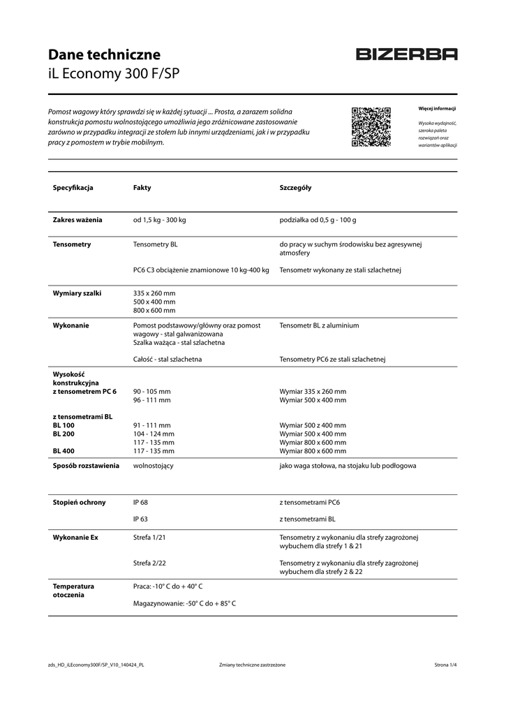 Dane techniczne iL Economy 300 F/SP Pomost wagowy który sprawdzi się w każdej sytuacji ... Prosta, a zarazem solidna konstrukcja pomostu wolnostojącego umożliwia jego zróżnicowane zastosowanie zarówno w przypadku integracji ze stołem lub innymi urządzeniami, jak i w przypadku pracy z pomostem w trybie mobilnym. Więcej informacji Wysoka wydajność, szeroka paleta rozwiązań oraz wariantów aplikacji Specyfikacja Fakty Szczegóły Zakres ważenia od 1,5 kg - 300 kg podziałka od 0,5 g - 100 g Tensometry Tensometry BL do pracy w suchym środowisku bez agresywnej atmosfery PC6 C3 obciążenie znamionowe 10 kg-400 kg Tensometr wykonany ze stali szlachetnej Wymiary szalki 335 x 260 mm 500 x 400 mm 800 x 600 mm Wykonanie Pomost podstawowy/główny oraz pomost wagowy - stal galwanizowana Szalka ważąca - stal szlachetna Tensometr BL z aluminium Całość - stal szlachetna Tensometry PC6 ze stali szlachetnej 90 - 105 mm 96 - 111 mm Wymiar 335 x 260 mm Wymiar 500 x 400 mm BL 400 91 - 111 mm 104 - 124 mm 117 - 135 mm 117 - 135 mm Wymiar 500 z 400 mm Wymiar 500 x 400 mm Wymiar 800 x 600 mm Wymiar 800 x 600 mm Sposób rozstawienia wolnostojący jako waga stołowa, na stojaku lub podłogowa Stopień ochrony IP 68 z tensometrami PC6 IP 63 z tensometrami BL Strefa 1/21 Tensometry z wykonaniu dla strefy zagrożonej wybuchem dla strefy 1 & 21 Strefa 2/22 Tensometry z wykonaniu dla strefy zagrożonej wybuchem dla strefy 2 & 22 Wysokość konstrukcyjna z tensometrem PC 6 z tensometrami BL BL 100 BL 200 Wykonanie Ex Temperatura otoczenia Praca: -10° C do + 40° C Magazynowanie: -50° C do + 85° C zds_HD_iLEconomy300F/SP_V10_140424_PL Zmiany techniczne zastrzeżone Strona 1/4 Opcje Fakty Szczegóły Kompensacja obciążenia wstępnego elektroniczna Należy podać w zamówieniu masę dla kompensacji obciążenia wstępnego Statyw Wykonanie ze stali szlachetnej dla terminali eS10-T, BT, ST oraz iS50 Do przymocowania z pomostem wagowym 335 x 260, 500 x 400 mm oraz 800 x 600 mm, Wysokość z przyrządem pomiarowym ok.: 580 - 590 mm Skrzynka podłączeniowa KA-1 przy długości przewodu pomiarowego > 3 metry Przenośnik rolkowy nienapędzany, zamontowany na szalce ważącej; „Nieprzewidziany dla strefy zagrożonej wybuchem”, „Nieprzewidziany do pracy w środowisku wilgotnym” Ramy: profil Alu-U Rolki: tworzywo sztuczne (niebieski), Łożysko: podłoże z tworzywa sztucznego z kulkami ze stali szlachetnej Osie oraz poprzecznice: stal szlachetna Dla wielkości szalki: 335 x 260 mm Ładunek: 30 kg Zakres ważenia: 3,6,15 kg Ramy: Alu-U-Profil Rolki: tworzywo sztuczne (niebieski) Łożysko: podłoże z tworzywa sztucznego z kulkami ze stali szlachetnej Osie oraz poprzecznice: stal szlachetna Dla wielkości szalki: 500 x 400 mm Ładunek: 60 kg Zakres ważenia: 30,60 kg Ramy: Alu-U-Profil Rolki: tworzywo sztuczne (niebieski) Łożysko: podłoże z tworzywa sztucznego z kulkami ze stali szlachetnej Osie oraz poprzecznice: stal szlachetna Dla wielkości szalki: 800 x 600 mm Ładunek: 60 kg Zakres ważenia: 60 kg Ramy: Alu-U-Profil Rolki: stal niestopowa Łożysko: wkład łożyska z blachy stalowej niestopowa, z jednorzędowym łożyskiem kulkowym Osie oraz poprzecznice: stal niestopowa Dla wielkości szalki: 500 x 400 mm Ładunek: 150 kg Zakres ważenia: 30,60,150 kg Ramy: kąt, stal niestopowa Rolki: stal niestopowa Łożysko: wkład łożyska z blachy stalowej niestopowa, z jednorzędowym łożyskiem kulkowym Osie: stal szlachetna 12 mm Dla wielkości szalki: 800 x 600 mm Ładunek: 300 kg Zakres ważenia: 30,60,150 kg Przenośnik rolkowy nienapędzany, zamontowany na szalce ważącej; „Przewidziany dla strefy zagrożonej wybuchem” „Nieprzewidziany do pracy w środowisku wilgotnym” zds_HD_iLEconomy300F/SP_V10_140424_PL Ilość rolek: 8 Wymiary ramy: 338 x 252 mm Podział rolek: 44 mm Wysokość bieżni rolkowej: 77 mm Ilość rolek: 10 Wymiary ramy: 490 x 397 mm Podział rolek: 50 mm Wysokość bieżni rolkowej: 75 mm Ilość rolek: 11 Wymiary ramy: 790 x 586 mm Podział rolek: 75 mm Wysokość bieżni rolkowej: 75 mm Ilość rolek: 10 Wymiary ramy: 490 x 395 mm Podział rolek: 50 mm Wysokość bieżni rolkowej: 75 mm Ilość rolek: 8 Wymiary ramy: 790 x 595 mm Podział rolek: 100 mm Wysokość bieżni rolkowej: 59 mm Zmiany techniczne zastrzeżone Strona 2/4 Opcje Fakty Szczegóły Stojak Dla pomostu wagowego 335 x 260 mm, Materiał stal cynkowana ogniowo Wysokość krawędź górna stojak = 716 - 743 mm Dla pomostu 500 x 400 mm, Materiał: stal cynkowana ogniowo Materiał: stal szlachetna Wysokość krawędź górna stojak = 716 - 743 mm Dla pomostu 800 x 600 mm, Materiał: stal cynkowana ogniowo Materiał: stal szlachetna Wysokość krawędź górna stojak = 725 - 743 mm Stojak jezdny do zasilania sieciowego Materiał: stal cynkowana ogniowo Materiał: stal szlachetna Stojak jezdny do zasilania akumulatorem Materiał: Stal cynkowana ogniowo Materiał: Stal szlachetna Stojak jezdny do zasilania sieciowego Strefa Ex - 1&2 Materiał: Stal cynkowana ogniowo Materiał: Stal szlachetna Stojak jezdny do zasilania akumulatorem Strefa Ex - 1&2 Materiał: Stal cynkowana ogniowo Materiał: Stal szlachetna Mocowanie do pulpitu do terminala es10-T Dla wymiarów 335 x 260 mm 500 x 400 mmm oraz 800 x 600 mm Masy zalewowe do skrzynki podłączeniowej Mechanizm jezdny dla pomostu wagowego 500 x 400 mm Dane techniczne Zakres ważenia Podziałka legalizowana Wymiary Tensometr max. obciążenie Wykonanie Stal szlachetna Stal galwanizowana Ex Symbole: IP 63 IP 68 zds_HD_iLEconomy300F/SP_V10_140424_PL Single Point Strefa 1/21 Strefa 1/22 waga podłogowa Zmiany techniczne zastrzeżone waga stołowa waga mobilna Strona 3/4 iL Economy 300 F/SP, Wymiary: 335 x 260 mm iL Economy 300 F/SP, Wymiary: 500 x 400 mm iL Economy 300 F/SP, Wymiary: 800 x 600 mm iL Economy ze statywem oraz terminalem iS 50 Bizerba Polska Sp. z o.o. ul. Lucyny Herc 28 20 - 328 Lublin Polska T +48 81 531 86 80 F +48 81 531 86 81 [email prote