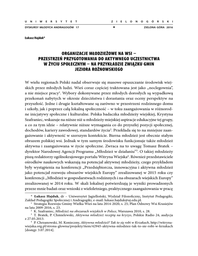 U N I W E R S Y T E T DYSKURSY MŁODYCH ANDRAGOGÓW 17 Z I • E L O N O G Ó R S K I Zielona Góra 2016 Łukasz Hajduk* Organizacje młodzieżowe na wsi – przestrzeń przygotowania do aktywnego uczestnictwa w życiu społecznym – na przykładzie Związku Gmin Jeziora Rożnowskiego W wielu regionach Polski nadal obserwuje się masowe opuszczanie środowisk wiejskich przez młodych ludzi. Wieś coraz częściej traktowana jest jako „noclegownia”, a nie miejsce pracy1. Wybory dokonywane przez młodych dorosłych są wypadkową przekonań nabytych w okresie dzieciństwa i dorastania oraz oceny perspektyw na przyszłość. Jedne i drugie kształtowane są zarówno w przestrzeni rodzinnego domu i szkoły, jak i poprzez całą lokalną społeczność – w toku zaangażowania w różnorodne inicjatywy społeczne i kulturalne. Polska badaczka młodzieży wiejskiej, Krystyna Szafraniec, wskazuje na niższe niż u młodzieży miejskiej aspiracje edukacyjne tej grupy, a co za tym idzie – relatywnie niższe wymagania co do przyszłej pozycji społecznej, dochodów, kariery zawodowej, standardów życia2. Przekłada się to na mniejsze zaangażowanie i aktywność w szerszym kontekście. Bierna młodzież jest obecnie stałym obrazem polskiej wsi. Jednak w tym samym środowisku funkcjonuje także młodzież aktywna i zaangażowana w życie społeczne. Zwraca na to uwagę Tomasz Bratek – dyrektor Narodowej Agencji Programu „Młodzież w działaniu”3. O takiej młodzieży piszą redaktorzy ogólnokrajowego portalu Witryna Wiejska4. Również przedstawiciele ośrodków naukowych wskazują na potencjał aktywnej młodzieży, czego przykładem były wystąpienia na konferencji „Przedsiębiorcza, innowacyjna i aktywna młodzież jako potencjał rozwoju obszarów wiejskich Europy” zrealizowanej w 2015 roku czy konferencji „Młodzież w gospodarstwach rodzinnych i na obszarach wiejskich Europy” zrealizowanej w 2014 roku. W skali lokalnej potwierdzają je wyniki prowadzonych przeze mnie badań oraz wnioski z wieloletniego, praktycznego zaangażowania w pracę * Łukasz Hajduk, dr – Uniwersytet Jagielloński, Wydział Filozoficzny, Instytut Pedagogiki, Zakład Pedagogiki Społecznej i Andragogiki, e-mail: [email protected]. 1 Strategia Rozwoju Gminy Wielka Wieś na lata 2014-2020, s. 25; Plan Odnowy Wsi Krasiejów na lata 2009-2016, s. 23. 2 K. Szafraniec, Młodzież na obszarach wiejskich w Polsce, Warszawa 2010, s. 28. 3 T. Bratek, P. Chmielewski, Aktywna młodzież receptą na kryzys, Polskie Radio 24, audycja z 27.05.2013. 4 P. Chrzanowski, M. Konieczny, Aktywna młodzież? Tak to się robi w Krzakach, http://witrynawiejska.org.pl/strona-glowna/projekty/item/42945-aktywna-mlodziez-tak-to-sie-robi-w-krzakach [dostęp: 3.07.2014]. 248 Łukasz Hajduk z młodzieżą. Ta aktywna część młodzieży wiejskiej to przede wszystkim członkowie różnorodnych ruchów i organizacji. Ta sama wieś, opuszczana przez wielu młodych, jest dla ich aktywnych rówieśników przestrzenią realizacji pasji i planów życiowych. Jak to się dzieje, że w odniesieniu do tego samego miejsca młodzi dorośli podejmują tak różne decyzje? Jednym z powodów pozostawania na wsi i aktywnego włączania się w życie społeczności wiejskiej jest wczesne zaangażowanie w działalność organizacji młodzieżowych lub włączanie się w inicjatywy organizacji działających na rzecz młodzieży. Dorośli, którzy w przeszłości czynnie uczestniczyli w jakiejś organizacji, są aktywniejsi w życiu publicznym, a tym samym emocjonalnie związani z lokalną społecznością, łatwiej dostrzegają też potencjał danego miejsca. Zagadnienia te coraz częściej stanowią przedmiot zainteresowania andragogiki. Celem artykułu jest refleksja nad tym, w jaki sposób wiejskie organizacje młodzieżowe przygotowują młodych ludzi do aktywnego uczestnictwa w życiu społecznym. W tym kontekście przedstawiłem „mapę” organizacji młodzieżowych oraz organizacji działających na rzecz młodych ludzi na wsi. Na wstępie, po zdefiniowaniu podstawowych pojęć i charakterystyce badań, opisałem Związek Gmin Jeziora Rożnowskiego (ZGJR) – obszar, na którym realizowałem badania, do których odnoszę się w artykule, jako przykład przestrzeni aktywności wiejskiej. Zwróciłem też uwagę na sposób identyfikowania organizacji młodzieżowych i związane z tym trudności. Druga część artykułu zawiera opis tych podmiotów oraz zwraca uwagę na to, jak przygotowują one młodzież do dorosłości. W podsumowaniu wskazałem na zmienne sprzyjające aktywnemu uczestnictwu w życiu społecznym. Założenia metodologiczne Kategoria młodość jest różnie definiowana; na potrzeby analiz opisanych w artykule identyfikuję ją z grupami edukacyjnymi: młodzież gimnazjalna 13-15 lat; młodzież szkoły ponadgimnazjalnej 16-18 lat; młodzież studencka (lub już aktywna zawodowo) 19-24 lata. Taka kategoryzacja jest powszechnie spotykana. Różnorodne definicje młodzieży na gruncie nauk społecznych i humanistycznych mają jedną część wspólną: rozumienie młodości jako okresu przejściowego między dzieciństwem a dorosłością. W naukach społecznych przyjęto, że okres młodzieńczy trwa od zakończenia dzieciństwa do uzyskania dojrzałości społecznej. Istnieją pewne trudności z uściśleniem tego okresu. Uznaje się więc, że czas rozpoczęcia młodzieńczego etapu życia wyznacza dojrzewanie płciowe, a za oznakę wyjścia z grupy młodzieży przyjmuje się założenie rodziny albo podjęcie pracy zawodowej5. Encyklopedia socjologii, t. 2, red. A. Kojder, Warszawa 1999, s. 253. 5 Organizacje młodzieżowe na wsi… 249 Ważną kategorią pojęciową jest organizacja młodzieżowa, przez Wincentego Okonia rozumiana jako „celowe zrzeszenie młodzieży powołane do życia przez nią samą lub przez innych”6. Tymi „innymi” mogą być dorośli, jednak młodzież nadal pozostaje głównym trz