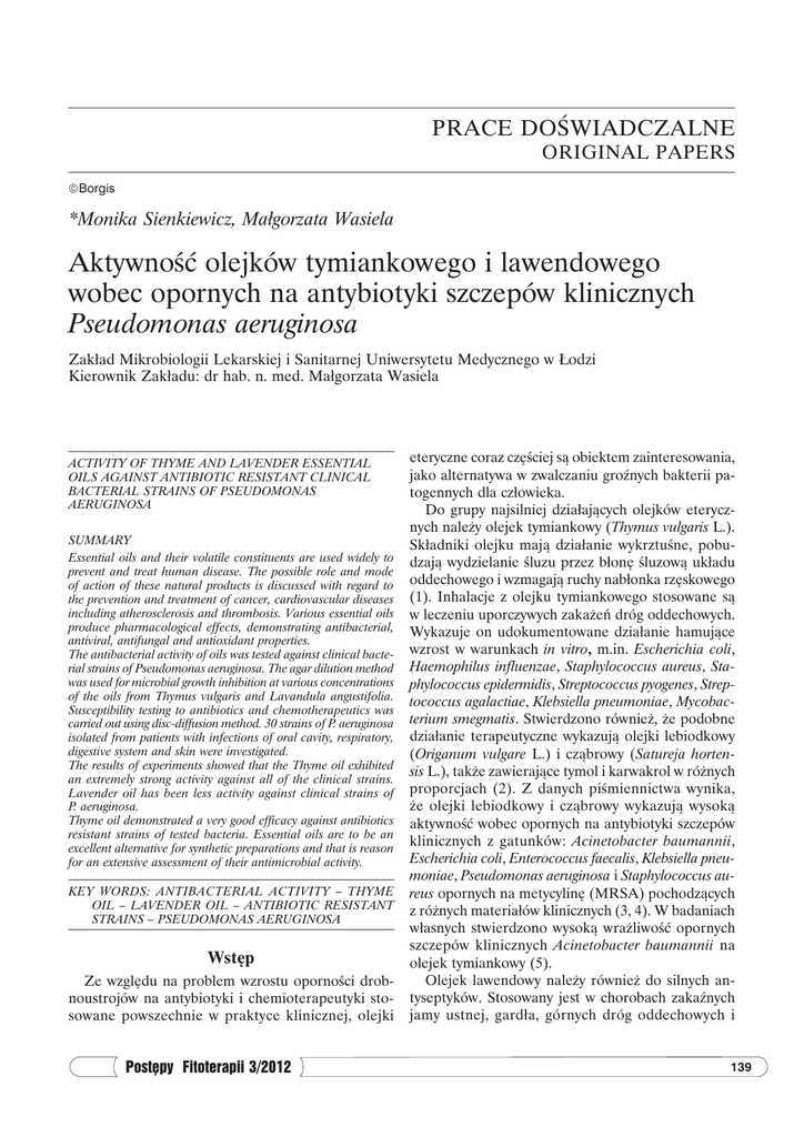 Prace doświadczalne original papers Borgis *Monika Sienkiewicz, Małgorzata Wasiela Aktywność olejków tymiankowego i lawendowego wobec opornych na antybiotyki szczepów klinicznych Pseudomonas aeruginosa Zakład Mikrobiologii Lekarskiej i Sanitarnej Uniwersytetu Medycznego w Łodzi Kierownik Zakładu: dr hab. n. med. Małgorzata Wasiela ACTIVITY OF THYME AND LAVENDER ESSENTIAL OILS AGAINST ANTIBIOTIC RESISTANT CLINICAL BACTERIAL STRAINS OF PSEUDOMONAS AERUGINOSA SUMMARY Essential oils and their volatile constituents are used widely to prevent and treat human disease. The possible role and mode of action of these natural products is discussed with regard to the prevention and treatment of cancer, cardiovascular diseases including atherosclerosis and thrombosis. Various essential oils produce pharmacological effects, demonstrating antibacterial, antiviral, antifungal and antioxidant properties. The antibacterial activity of oils was tested against clinical bacterial strains of Pseudomonas aeruginosa. The agar dilution method was used for microbial growth inhibition at various concentrations of the oils from Thymus vulgaris and Lavandula angustifolia. Susceptibility testing to antibiotics and chemotherapeutics was carried out using disc-diffusion method. 30 strains of P. aeruginosa isolated from patients with infections of oral cavity, respiratory, digestive system and skin were investigated. The results of experiments showed that the Thyme oil exhibited an extremely strong activity against all of the clinical strains. Lavender oil has been less activity against clinical strains of P. aeruginosa. Thyme oil demonstrated a very good efficacy against antibiotics resistant strains of tested bacteria. Essential oils are to be an excellent alternative for synthetic preparations and that is reason for an extensive assessment of their antimicrobial activity. KEY WORDS: ANTIBACTERIAL ACTIVITY – THYME OIL – LAVENDER OIL – ANTIBIOTIC RESISTANT STRAINS – PSEUDOMONAS AERUGINOSA Wstęp Ze względu na problem wzrostu oporności drobnoustrojów na antybiotyki i chemioterapeutyki stosowane powszechnie w praktyce klinicznej, olejki Postępy Fitoterapii 3/2012 eteryczne coraz częściej są obiektem zainteresowania, jako alternatywa w zwalczaniu groźnych bakterii patogennych dla człowieka. Do grupy najsilniej działających olejków eterycznych należy olejek tymiankowy (Thymus vulgaris L.). Składniki olejku mają działanie wykrztuśne, pobudzają wydzielanie śluzu przez błonę śluzową układu oddechowego i wzmagają ruchy nabłonka rzęskowego (1). Inhalacje z olejku tymiankowego stosowane są w leczeniu uporczywych zakażeń dróg oddechowych. Wykazuje on udokumentowane działanie hamujące wzrost w warunkach in vitro, m.in. Escherichia coli, Haemophilus influenzae, Staphylococcus aureus, Staphylococcus epidermidis, Streptococcus pyogenes, Streptococcus agalactiae, Klebsiella pneumoniae, Mycobacterium smegmatis. Stwierdzono również, że podobne działanie terapeutyczne wykazują olejki lebiodkowy (Origanum vulgare L.) i cząbrowy (Satureja hortensis L.), także zawierające tymol i karwakrol w różnych proporcjach (2). Z danych piśmiennictwa wynika, że olejki lebiodkowy i cząbrowy wykazują wysoką aktywność wobec opornych na antybiotyki szczepów klinicznych z gatunków: Acinetobacter baumannii, Escherichia coli, Enterococcus faecalis, Klebsiella pneumoniae, Pseudomonas aeruginosa i Staphylococcus aureus opornych na metycylinę (MRSA) pochodzących z różnych materiałów klinicznych (3, 4). W badaniach własnych stwierdzono wysoką wrażliwość opornych szczepów klinicznych Acinetobacter baumannii na olejek tymiankowy (5). Olejek lawendowy należy również do silnych antyseptyków. Stosowany jest w chorobach zakaźnych jamy ustnej, gardła, górnych dróg oddechowych i 139 Monika Sienkiewicz, Małgorzata Wasiela płuc, a także w dermatologii do leczenia trudno gojących się ran, owrzodzeń i oparzeń. Głównym składnikiem olejku są linalol i octan linalilu (6). Olejek lawendowy (Lavandula angustifolia Mill.) wykazuje silne właściwości bakteriobójcze wobec Staphylococcus aureus MRSA, a także bakterii z rodzaju Enterococcus sp. opornych na wankomycynę (VRE) (7). Zgodnie z piśmiennictwem olejek ten okazał się pomocny w zwalczaniu zakażeń układu oddechowego wywołanych przez oporne na erytromycynę, amoksycylinę i cefalotynę szczepy Haemophilus influenzae (8). Z kolei olejek pozyskany z Lavandula heterophylla Avonview wykazuje działanie hamujące wzrost: Streptococcus pyogenes, Enterobacter aerogenes, Staphylococcus aureus MRSA, Pseudomonas aeruginosa, Citrobacter freundii, Proteus vulgaris, Escherichia coli VRE, Shigella sonnei i Propionibacterium acnes (7, 9). Bakterie z rodzaju Pseudomonas wraz z innymi rodzajami, takimi jak Burkholderia, Stenotrophomonas, Acinetobacter, Flavobacterium i Alcaligenes, należą do niefermentujących Gram-ujemnych pałeczek biorących znaczący udział w zakażeniach szpitalnych i zaliczane są do tzw. alert patogenów. Ogromną rolę w rozprzestrzenianiu się tych bakterii w środowisku szpitalnym odgrywają sprzęt i aparatura (wenflony, cewniki urologiczne, dreny, nebulizatory, nawilżacze), a także przeprowadzane zabiegi, takie jak kolonostomia, intubacja, tracheostomia, dializa. Niebezpieczeństwo zakażenia niosą z sobą również zanieczyszczone płyny infuzyjne, krople do stosowania w okulistyce, a także woda pitna i produkty żywnościowe. Pałeczki Gramujemne niefermentujące wywołują zakażenia dróg moczowych, zapalenie płuc, nosogardzieli, zapalenie opon mózgowo-rdzeniowych po zabiegach neurochirurgicznych, zakażenia narządu wzroku. Drobnoustroje z rodzaju Pseudomonas sp. wytwarzają β-laktamazy o poszerzonym spektrum, kodowane przez geny chromosomalne. Wyposażone są w szereg mechanizmów oporności na antybiotyki β-laktamowe, w tym również oporne są na tzw. penicyliny pseudomonasowe (ureidopenic