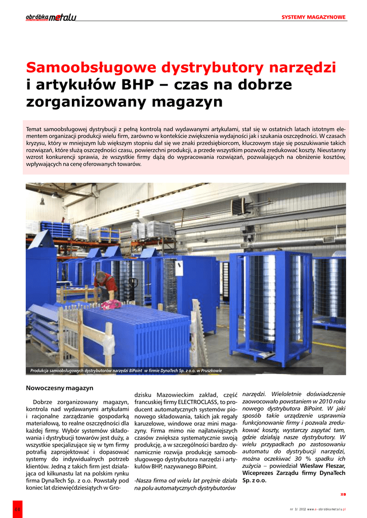 S Y S T E M Y M A G A Z Y N O W E Samoobsługowe dystrybutory narzędzi i artykułów BHP – czas na dobrze zorganizowany magazyn T e m a t s a m o o b s ł u g o w e j d y s t r y b u c j i z p e ł n ą k o n t r o l ą n a d w y d a w a n y m i a r t y k u ł a m i , s t a ł s i ę w o s t a t n i c h l a t a c h i s t o t n y m e l e m e n t e m o r g a n i z a c j i p r o d u k c j i w i e l u f i r m , z a r ó w n o w k o n t e k ś c i e z w i ę k s z e n i a w y d a j n o ś c i j a k i s z u k a n i a o s z c z ę d n o ś c i . W c z a s a c h k r y z y s u , k t ó r y w m n i e j s z y m l u b w i ę k s z y m s t o p n i u d a ł s i ę w e z n a k i p r z e d s i ę b i o r c o m , k l u c z o w y m s t a j e s i ę p o s z u k i w a n i e t a k i c h r o z w i ą z a ń , k t ó r e s ł u ż ą o s z c z ę d n o ś c i c z a s u , p o w i e r z c h n i p r o d u k c j i , a p r z e d e w s z y s t k i m p o z w o l ą z r e d u k o w a ć k o s z t y . N i e u s t a n n y w z r o s t k o n k u r e n c j i s p r a w i a , ż e w s z y s t k i e f i r m y d ą ż ą d o w y p r a c o w a n i a r o z w i ą z a ń , p o z w a l a j ą c y c h n a o b n i ż e n i e k o s z t ó w , w p ł y w a j ą c y c h n a c e n ę o f e r o w a n y c h t o w a r ó w . P r o d u k c j a s a m o o b s ł u g o w y c h d y s t r y b u t o r ó w n a r z ę d z i B i P o i n t w f i r m i e D y n a T e c h S p . z o . o . w P r u s z k o w i e N o w o c z e s n y m a g a z y n n a r z ę d z i . W i e l o l e t n i e d o ś w i a d c z e n i e d z i s k u M a z o w i e c k i m z a k ł a d , c z ę ś ć z a o w o c o w a ł o p o w s t a n i e m w 2 0 1 0 r o k u D o b r z e z o r g a n i z o w a n y m a g a z y n , f r a n c u s k i e j f i r m y E L E C T R O C L A S S , t o p r o n o w e g o d y s t r y b u t o r a B i P o i n t . W j a k i k o n t r o l a n a d w y d a w a n y m i a r t y k u ł a m id u c e n t a u t o m a t y c z n y c h s y s t e m ó w p i o s p o s ó b t a k i e u r z ą d z e n i e u s p r a w n i a i r a c j o n a l n e z a r z ą d z a n i e g o s p o d a r k ą n o w e g o s k ł a d o w a n i a , t a k i c h j a k r e g a ł y f u n k c j o n o w a n i e f i r m y i p o z w a l a z r e d u m a t e r i a ł o w ą , t o r e a l n e o s z c z ę d n o ś c i d l a k a r u z e l o w e , w i n d o w e o r a z m i n i m a g a k o w a ć k o s z t y , w y s t a r c z y z a p y t a ć t a m , k a ż d e j f i r m y . W y b ó r s y s t e m ó w s k ł a d o z y n y . F i r m a m i m o n i e n a j ł a t w i e j s z y c h g d z i e d z i a ł a j ą n a s z e d y s t r y b u t o r y . W w a n i a i d y s t r y b u c j i t o w a r ó w j e s t d u ż y , a c z a s ó w z w i ę k s z a s y s t e m a t y c z n i e s w o j ą w i e l u p r z y p a d k a c h p o z a s t o s o w a n i u w s z y s t k i e s p e c j a l i z u j ą c e s i ę w t y m f i r m y p r o d u k c j ę , a w s z c z e g ó l n o ś c i b a r d z o d y a u t o m a t u d o d y s t r y b u c j in a r z ę d z i , p o t r a f i ą z a p r o j e k t o w a ć i d o p a s o w a ć n a m i c z n i e r o z w i j a p r o d u k c j ę s a m o o b m o ż n a o c z e k i w a ć 3 0 % s p a d k u i c h s y s t e m y d o i n d y w i d u a l n y c h p o t r z e b s ł u g o w e g o d y s t r y b u t o r a n a r z ę d z i i a r t y z u ż y c i a – p o w i e d z i a ł W i e s ł a w F l e s z a r , k l i e n t ó w . J e d n ą z t a k i c h f i r m j e s t d z i a ł a k u ł ó w B H P , n a z y w a n e g o B i P o i n t . W i c e p r e z e s Z a r z ą d u f i r m y D y n a T e c h j ą c a o d k i l k u n a s t u l a t n a p o l s k i m r y n k u S p . z o . o . f i r m a D y n a T e c h S p . z o . o . P o w s t a ł y p o d N a s z a f i r m a o d w i e l u l a t p r ę ż n i e d z i a ł a k o n i e c l a t d z i e w i ę ć d z i e s i ą t y c h w G r o - n a p o l u a u t o m a t y c z n y c h d y s t r y b u t o r ó w 44 nr 3/2012 www.e-obrobkametalu.pl SYSTEMY MAGAZYNOWE J a k t o d z i a ł a I d e n t y f i k a c j a u ż y t k o w n i k a P o b i e r a n i e a r t y k u ł ó w K o r z y s t a n i e z r a p o r t ó w n i e m a u t o m a t y c z n e j s z a f y w y d a j ą c e j n t e r f e j s u ż y t k o w n i k a , z k t ó r y m m a d o A u t o m a t y c z n y d y s t r y b u t o r n a r z ę d z ii z d o p r a c o w a n y m o p r o g r a m o w a n i e m c z y n i e n i a w i ę k s z o ś ć p r a c o w n i k ó w p o b i e ia r t y k u ł ó w B H P s t a n o w iw y m i e r n e z a r z ą d z a j ą c y m . B i P o i n t s t a n o w i i d e a l n e r a j ą c y c h a r t y k u ł . U ż y t k o w n i k l o g u j e s i ę i o p ł a c a l n e r o z w i ą z a n i e d o k o n t r o l o w a r o z w i ą z a n i e w m i e j s c a c h z o g r a n i c z o n ą z a p o m o c ą k a r t y , s k a n e r a l i n i ip a p i l a r n e g o w y d a w a n i a s z e r o k i e g o a s o r t y m e n p o w i e r z c h n i ą , g d z i e c z y n n i k i e m k l u c z o n y c h l u b e k r a n u d o t y k o w e g o , w p i s u j ą c t u a r t y k u ł ó w o m a ł e j i d u ż e j r o t a c j i . R o z w y m j e s t z a r z ą d z a n i e d u ż ą i l o ś c i ą r ó ż s w ó j n u m e r o r a z h a s ł o , p o c z y m w y b i e r a w i ą z u j e p r o b l e m y p o w i ą z a n e z z a r z ą n y c h a r t y k u ł ó w , n p . n a r z ę d z i r ę c z n y c h p e r a c j ę , k t ó r ą c h c e w y k o n a ć ( p o b r a n i e , d z a n i e m o r a z w y d a w a n i e m n a r z ę d z io c z y s k r a w a j ą c y c h . N a s z d y s t r y b u t o r c h a z w r o t , u z u p e ł n i e n i e … ) . N a k o ń c u u ż y t s k r a w a j ą c y c h , n a r z ę d z i r ę c z n y c h , m a t e r a k t e r y z u j e s i ę w y s o k i m w s p ó ł c z y n n i k o w n i k w p i s u j e n u m e r a r t y k u ł u o r a z ż ą r i a ł ó w e k s p l o a t a c y j n y c h o r a z a r t y k u