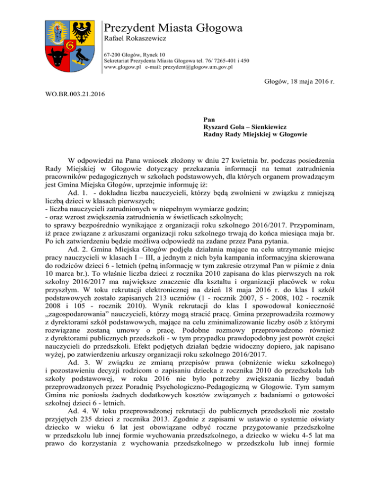 Prezydent Miasta Głogowa Rafael Rokaszewicz 67-200 Głogów, Rynek 10 Sekretariat Prezydenta Miasta Głogowa tel. 76/ 7265-401 i 450 www.glogow.pl e-mail: [email protected] Głogów, 18 maja 2016 r. WO.BR.003.21.2016 Pan Ryszard Gola – Sienkiewicz Radny Rady Miejskiej w Głogowie W odpowiedzi na Pana wniosek złożony w dniu 27 kwietnia br. podczas posiedzenia Rady Miejskiej w Głogowie dotyczący przekazania informacji na temat zatrudnienia pracowników pedagogicznych w szkołach podstawowych, dla których organem prowadzącym jest Gmina Miejska Głogów, uprzejmie informuję iż: Ad. 1. - dokładna liczba nauczycieli, którzy będą zwolnieni w związku z mniejszą liczbą dzieci w klasach pierwszych; - liczba nauczycieli zatrudnionych w niepełnym wymiarze godzin; - oraz wzrost zwiększenia zatrudnienia w świetlicach szkolnych; to sprawy bezpośrednio wynikające z organizacji roku szkolnego 2016/2017. Przypominam, iż prace związane z arkuszami organizacji roku szkolnego trwają do końca miesiąca maja br. Po ich zatwierdzeniu będzie możliwa odpowiedź na zadane przez Pana pytania. Ad. 2. Gmina Miejska Głogów podjęła działania mające na celu utrzymanie miejsc pracy nauczycieli w klasach I – III, a jednym z nich była kampania informacyjna skierowana do rodziców dzieci 6 - letnich (pełną informację w tym zakresie otrzymał Pan w piśmie z dnia 10 marca br.). To właśnie liczba dzieci z rocznika 2010 zapisana do klas pierwszych na rok szkolny 2016/2017 ma największe znaczenie dla kształtu i organizacji placówek w roku przyszłym. W toku rekrutacji elektronicznej na dzień 18 maja 2016 r. do klas I szkół podstawowych zostało zapisanych 213 uczniów (1 - rocznik 2007, 5 - 2008, 102 - rocznik 2008 i 105 - rocznik 2010). Wynik rekrutacji do klas I spowodował konieczność „zagospodarowania” nauczycieli, którzy mogą stracić pracę. Gmina przeprowadziła rozmowy z dyrektorami szkół podstawowych, mające na celu zminimalizowanie liczby osób z którymi rozwiązane zostaną umowy o pracę. Podobne rozmowy przeprowadzono również z dyrektorami publicznych przedszkoli - w tym przypadku prawdopodobny jest powrót części nauczycieli do przedszkoli. Efekt podjętych działań będzie widoczny dopiero, jak napisano wyżej, po zatwierdzeniu arkuszy organizacji roku szkolnego 2016/2017. Ad. 3. W związku ze zmianą przepisów prawa (obniżenie wieku szkolnego) i pozostawieniu decyzji rodzicom o zapisaniu dziecka z rocznika 2010 do przedszkola lub szkoły podstawowej, w roku 2016 nie było potrzeby zwiększania liczby badań przeprowadzonych przez Poradnię Psychologiczno-Pedagogiczną w Głogowie. Tym samym Gmina nie poniosła żadnych dodatkowych kosztów związanych z badaniami o gotowości szkolnej dzieci 6 - letnich. Ad. 4. W toku przeprowadzonej rekrutacji do publicznych przedszkoli nie zostało przyjętych 235 dzieci z rocznika 2013. Zgodnie z zapisami w ustawie o systemie oświaty dziecko w wieku 6 lat jest obowiązane odbyć roczne przygotowanie przedszkolne w przedszkolu lub innej formie wychowania przedszkolnego, a dziecko w wieku 4-5 lat ma prawo do korzystania z wychowania przedszkolnego w przedszkolu lub innej formie wychowania przedszkolnego. W pierwszej kolejności zabezpieczono miejsca dla dzieci 6 letnich (obowiązek) oraz 4 i 5 - letnich (prawo). Na pozostałe miejsca przyjęto dzieci z rocznika 2013. Informuję, iż aktualnie na podstawie art. 20 zc ustawy z dnia 7 września 1991 r. o systemie oświaty (Dz.U.2015.2156 ze zm.) trwa procedura odwoławcza, która składa się z następujących po sobie etapów: - pomiędzy 26 kwietnia a 4 maja br. rodzic kandydata nieprzyjętego do przedszkola publicznego, mógł wystąpić do komisji rekrutacyjnej (zorganizowanej w przedszkolu pierwszego wyboru) z wnioskiem o sporządzenie uzasadnienia odmowy przyjęcia kandydata do danego przedszkola publicznego; - uzasadnienie sporządzane było w terminie 5 dni od dnia wystąpienia przez rodzica kandydata z w/w wnioskiem. Uzasadnienie zawiera przyczyny odmowy przyjęcia, w tym najniższą liczbę punktów, która uprawniała do przyjęcia oraz liczbę punktów, którą kandydat uzyskał w postępowaniu rekrutacyjnym. Rodzic mógł odebrać uzasadnienie w/w terminie w placówce pierwszego wyboru; - rodzic kandydata mógł wnieść do dyrektora publicznego przedszkola odwołanie od rozstrzygnięcia komisji rekrutacyjnej, w terminie 7 dni od dnia otrzymania uzasadnienia; - dyrektor przedszkola publicznego rozpatrywał odwołanie od rozstrzygnięcia komisji rekrutacyjnej w terminie 7 dni od dnia otrzymania odwołania. Na rozstrzygnięcie dyrektora danego przedszkola publicznego służy skarga do sądu administracyjnego. Na dzień 4 maja br. zostało złożonych 105 wniosków o sporządzenie uzasadnienia odmowy przyjęcia kandydata do danego przedszkola publicznego. Komisje rekrutacyjne zorganizowane przy poszczególnych przedszkolach publicznych wydały taką samą liczbę uzasadnień. Do dnia 16 maja do Dyrektorów publicznych przedszkoli wpłynęły 82 odwołania. W chwili obecnej trwają prace nad wskazaniem w przedszkolach publicznych miejsc dla dzieci, których rodzice uruchomili procedurę odwoławczą. Liczba dzieci przyjętych z odwołań, będzie znana do końca bieżącego miesiąca. Z poważaniem Otrzymują: 1. Adresat 2. a/a Sprawę prowadzi: Przemysław Powroźnik, tel. 76/ 7265-491