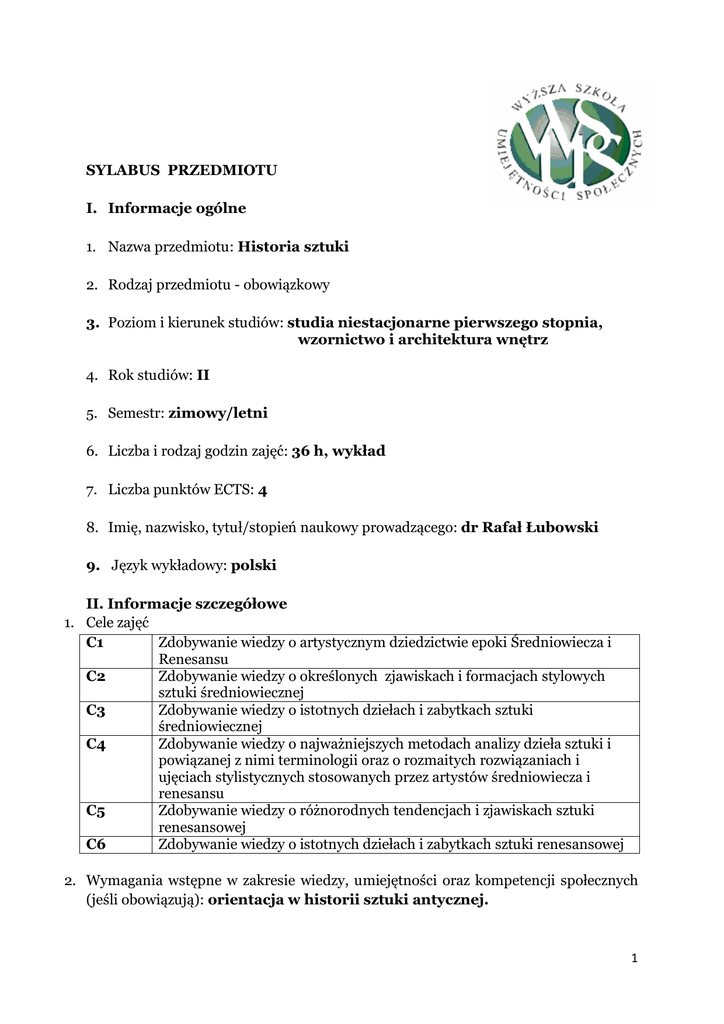 SYLABUS PRZEDMIOTU I. Informacje ogólne 1. Nazwa przedmiotu: Historia sztuki 2. Rodzaj przedmiotu - obowiązkowy 3. Poziom i kierunek studiów: studia niestacjonarne pierwszego stopnia, wzornictwo i architektura wnętrz 4. Rok studiów: II 5. Semestr: zimowy/letni 6. Liczba i rodzaj godzin zajęć: 36 h, wykład 7. Liczba punktów ECTS: 4 8. Imię, nazwisko, tytuł/stopień naukowy prowadzącego: dr Rafał Łubowski 9. Język wykładowy: polski II. Informacje szczegółowe 1. Cele zajęć C1 Zdobywanie wiedzy o artystycznym dziedzictwie epoki Średniowiecza i Renesansu C2 Zdobywanie wiedzy o określonych zjawiskach i formacjach stylowych sztuki średniowiecznej C3 Zdobywanie wiedzy o istotnych dziełach i zabytkach sztuki średniowiecznej C4 Zdobywanie wiedzy o najważniejszych metodach analizy dzieła sztuki i powiązanej z nimi terminologii oraz o rozmaitych rozwiązaniach i ujęciach stylistycznych stosowanych przez artystów średniowiecza i renesansu C5 Zdobywanie wiedzy o różnorodnych tendencjach i zjawiskach sztuki renesansowej C6 Zdobywanie wiedzy o istotnych dziełach i zabytkach sztuki renesansowej 2. Wymagania wstępne w zakresie wiedzy, umiejętności oraz kompetencji społecznych (jeśli obowiązują): orientacja w historii sztuki antycznej. 1 3. Efekty kształcenia w zakresie wiedzy, umiejętności oraz kompetencji społecznych Efekty kształcenia w odniesieniu do wiedzy Symbol Opis efektów kształcenia efektu kształcenia Zna ramy chronologiczne oraz wyodrębnia najważniejsze EK1 zjawiska i formacje stylowe epoki średniowiecza i renesansu. Charakteryzuje w ujęciu problemowym tendencje i zjawiska EK2 sztuki średniowiecznej i renesansowej Zna najważniejsze dzieła w/w epok, ich treść oraz podjęte w nich EK3 rozwiązania formalne. Zna rozmaite ujęcia stylistyczne charakterystyczne odpowiednio EK4 dla sztuki średniowiecznej i renesansowej Zna konteksty historyczno-kulturowe wpływające na rozwój EK5 sztuki w epoce średniowiecza i renesansu Efekty kształcenia w odniesieniu do umiejętności Symbol Opis efektów kształcenia efektu kształcenia Potrafi adekwatnie posługiwać się pojęciami związanymi z EK6 formalną i treściową analizą dzieła sztuki. Potrafi dokonywać charakterystyki porównawczej opozycyjnych EK7 zjawisk artystycznych Posiada umiejętność analizy zjawisk artystycznych epoki EK8 średniowiecza i renesansu Potrafi zdekonstruować najważniejsze stereotypy i klisze EK9 poznawcze dotyczące pojmowania osiągnięć epoki średniowiecza i renesansu Potrafi samodzielnie odszukiwać informacje dotyczące sztuki EK10 renesansu i średniowiecza. Efekty kształcenia w odniesieniu do kompetencji społecznych Symbol efektu kształcenia EK11 4. Treści programowe Symbol treści programowych Opis efektów kształcenia Jest wrażliwy na wartości artystyczne dzieł sztuki, docenia ich znaczenie oraz pragnie je poznawać. Opis treści programowych Odniesienie do efektów kształcenia dla przedmiotu (symbol efektów) 2 TP1 Ogólna charakterystyka sztuki i kultury średniowiecza TP2 Sztuka bizantyjska i wczesnochrześcijańska TP3 Ikona w sztuce bizantyjskiej TP4 Romanizm i gotyk w sztuce – ogólna charakterystyka zjawisk TP5 Charakterystyka porównawcza architektury romańskiej i gotyckiej TP6 Symbolika świątyni chrześcijańskiej epoki średniowiecza TP7 Charakterystyka porównawcza rzeźby romańskiej i gotyckiej TP8 Malarstwo i rzeźba włoskiego protorenesansu TP9 Malarstwo niderlandzkie I połowy XV wieku EK1, EK5, EK8, EK9, EK11 EK2, Ek3, EK6, EK11 EK2, Ek3, EK6, EK11 EK1, EK2, Ek3, EK6, EK1o EK1, EK2, Ek3, EK6, EK1o, Ek7, Ek8 EK5, EK6, EK3 TP10 Ogólna charakterystyka sztuki doby nowożytnej TP11 Malarstwo Masaccia i jego wpływ na sztukę włoską i połowy xv wieku EK1, EK2, Ek3, EK6, EK1o, Ek7, Ek8 EK2, EK3, EK4, EK6 EK2, EK3, EK4, EK6 EK1, EK5, EK8, EK9, EK11 EK2, EK3, EK4, EK6 TP12 Od rzeźby doby quattrocenta do twórczości Michała Anioła EK2, EK3, EK4, EK6 TP13 Malarstwo II połowy wieku XV wieku we Włoszech EK2, EK3, EK4, EK6 TP 14 Wybrane zagadnienia dotyczące malarstwa Europy „północnej” XV i XVI wieku TP15 Ku malarskiej doskonałości: Leonardo da Vinci, Pietro Perugino, Rafael Santi , EK2, EK3, EK4, EK6, EK8 EK2, EK3, EK4, EK6 TP16 Osiągnięcia włoskiej architektury doby renesansu TP17 Sztuka manieryzmu: cechy, przedstawiciele, dzieła TP18 Poszukiwania kolorystyczne malarzy szkoły weneckiej w epoce renesansu (2 wykłady) EK2, EK3, EK4, EK6 EK2, EK3, EK4, EK6 EK2, EK3, EK4, EK6 5. Literatura podstawowa: „Sztuka Świata”, tomy: 3, 4, 5, 6 (do wglądu wybr. rozdziały i reprodukcje), Warszawa 1998-2012; Michael Levey, „Od Giotta do Cézanne’a. Zarys historii malarstwa”, Arkady, Warszawa 1972; Wilfried Koch, „Style w architekturze” (do wglądu wybrane zagadnienia), Warszawa 1996 3 Umberto Eco, „Sztuka i piękno w średniowieczu”, Wydawnictwo Znak, Kraków 2006; Władysław Tatarkiewicz, „Historia estetyki”, tom 3 Warszawa 1967 (kserokopie wybranych rozdziałów dostarcza studentom wykładowca) oraz dostępne w bibliotece albumy poświęcone twórczości konkretnych artystów oraz pozycje dotyczące określonych zagadnień problemowych. dodatkowa: John Baldock, Symbolika chrześcijańska, Dom Wydawniczy Rebis, Poznań 1994; Leonid Uspienski, Teologia ikony, W drodze, Poznań 1993; Henri Stern, Sztuka bizantyjska, Wydawnictwa Artystyczne i Filmowe, Warszawa 1970; Świechowski Zygmunt, Nowak Lesław, Gumińska Bronisława, Sztuka romańska, Wydawnictwa Artystyczne i Filmowe, Warszawa 1976; Willibard Sauerländer, Rzeźba średniowieczna, PWN, Warszawa 1978; Władysław Tatarkiewicz, Dzieje sześciu pojęć, Wydawnictwo PWN, 1988; Paul Jahnson, Krótka historia renesansu, Wydawnictwo Dolnośląskie, Wrocław, 2004; Jan Białostocki (red.), Teoretycy, pisarze i artyści o sztuce 1500-1600, PWN, Warszawa 1985; Jean Delumeau, Cywilizacja Odrodzenia, PIW, Warszawa 1987; Maria Rzepińska, Malarstwo Cinque