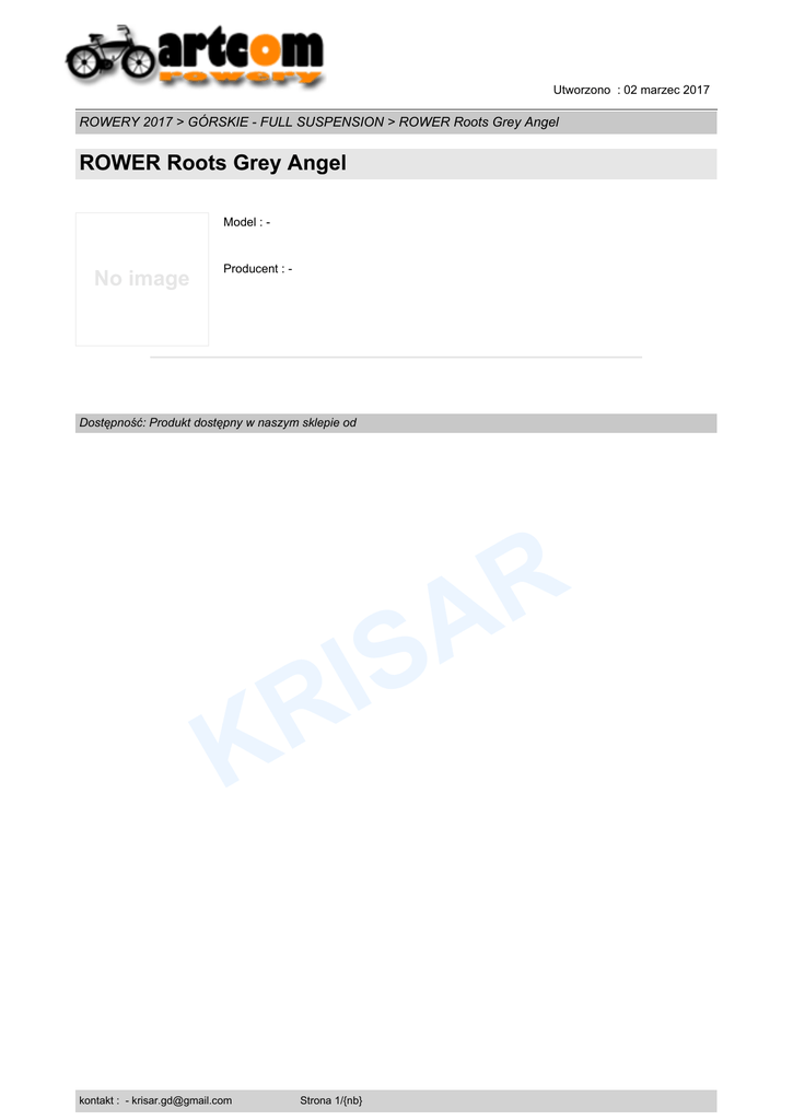 Utworzono : 02 marzec 2017 ROWERY 2017 > GÓRSKIE - FULL SUSPENSION > ROWER Roots Grey Angel ROWER Roots Grey Angel Model : - No image Producent : - Dostępność: Produkt dostępny w naszym sklepie od R A K kontakt : - [email protected] S I R Strona 1/{nb}