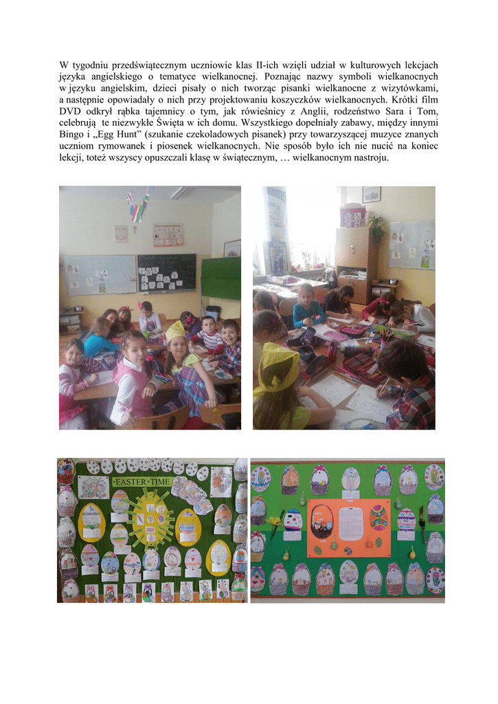W tygodniu przedświątecznym uczniowie klas II-ich wzięli udział w kulturowych lekcjach języka angielskiego o tematyce wielkanocnej. Poznając nazwy symboli wielkanocnych w języku angielskim, dzieci pisały o nich tworząc pisanki wielkanocne z wizytówkami, a następnie opowiadały o nich przy projektowaniu koszyczków wielkanocnych. Krótki film DVD odkrył rąbka tajemnicy o tym, jak rówieśnicy z Anglii, rodzeństwo Sara i Tom, celebrują te niezwykłe Święta w ich domu. Wszystkiego dopełniały zabawy, między innymi Bingo i „Egg Hunt” (szukanie czekoladowych pisanek) przy towarzyszącej muzyce znanych uczniom rymowanek i piosenek wielkanocnych. Nie sposób było ich nie nucić na koniec lekcji, toteż wszyscy opuszczali klasę w świątecznym, … wielkanocnym nastroju.
