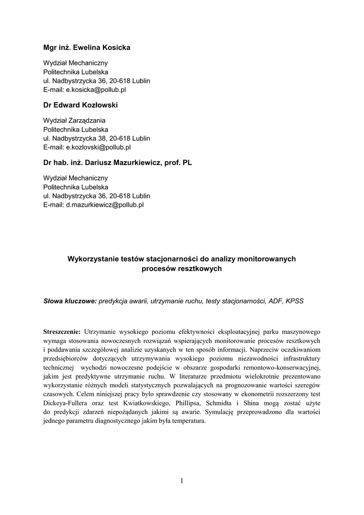 Mgr inż. Ewelina Kosicka Wydział Mechaniczny Politechnika Lubelska ul. Nadbystrzycka 36, 20-618 Lublin E-mail: [email protected] Dr Edward Kozłowski Wydział Zarządzania Politechnika Lubelska ul. Nadbystrzycka 38, 20-618 Lublin E-mail: [email protected] Dr hab. inż. Dariusz Mazurkiewicz, prof. PL Wydział Mechaniczny Politechnika Lubelska ul. Nadbystrzycka 36, 20-618 Lublin E-mail: [email protected] Wykorzystanie testów stacjonarności do analizy monitorowanych procesów resztkowych Słowa kluczowe: predykcja awarii, utrzymanie ruchu, testy stacjonarności, ADF, KPSS Streszczenie: Utrzymanie wysokiego poziomu efektywności eksploatacyjnej parku maszynowego wymaga stosowania nowoczesnych rozwiązań wspierających monitorowanie procesów resztkowych i poddawania szczegółowej analizie uzyskanych w ten sposób informacji. Naprzeciw oczekiwaniom przedsiębiorców dotyczących utrzymywania wysokiego poziomu niezawodności infrastruktury technicznej wychodzi nowoczesne podejście w obszarze gospodarki remontowo-konserwacyjnej, jakim jest predyktywne utrzymanie ruchu. W literaturze przedmiotu wielokrotnie prezentowano wykorzystanie różnych modeli statystycznych pozwalających na prognozowanie wartości szeregów czasowych. Celem niniejszej pracy było sprawdzenie czy stosowany w ekonometrii rozszerzony test Dickeya-Fullera oraz test Kwiatkowskiego, Phillipsa, Schmidta i Shina mogą zostać użyte do predykcji zdarzeń niepożądanych jakimi są awarie. Symulację przeprowadzono dla wartości jednego parametru diagnostycznego jakim była temperatura. 1 1. Wstęp Dotrzymywanie zobowiązań wobec kontrahentów jest jednym z czynników wpływających na poziom efektywności eksploatacyjnej w przedsiębiorstwie. Zatem jednym ze strategicznych zadań firm jest punktualna dostawa produktów w określonej ilości i jakości. Zastosowanie nowoczesnych technologii wytwarzania oraz wysoki poziom skomplikowania procesów produkcyjnych pozwala na precyzyjną realizację zleconych zadań, ale także stanowi problem związany z utrzymaniem niezawodności wyposażenia produkcyjnego. Z tego powodu wzrasta znaczenie działań wspomagających prace działu utrzymania ruchu (UR) (wyposażenie produkcyjne musi być stale sprawne eksploatacyjnie poprzez kontrolę nad stanem technicznym maszyn i urządzeń). Jak definiuje Legutko [1] , eksploatacja jest ogółem zjawisk, procesów, zdarzeń, jakie zachodzą w czasie istnienia urządzenia od chwili jego wyprodukowania do chwili jego kasacji. Pojęcie efektywności w odniesieniu do UR rozumiane jest jako właściwość ludzi bądź też obiektów technicznych, która opisuje spełnianie przez nich wymagań w różnym kontekście (m.in. niezawodnościowym, ekonomicznym czy jakościowym). Efektywność eksploatacyjna jest ilorazem efektów uzyskanych w ustalonym przedziale czasu trwania określonego stanu obiektu eksploatacji do nakładów poniesionych na uzyskanie tych efektów. Wzrost efektywności eksploatacyjnej maszyn poprzez przewidywanie awarii i przywracanie pełnej sprawności systemu produkcyjnego pozwala na terminową realizację zamówień, co z kolei przekłada się na efekty finansowe przedsiębiorstw. Jest to istotne zwłaszcza w warunkach ostrej konkurencji, gdzie ciągłe doskonalenie systemów wytwarzania, rozwój stosowanych technologii oraz automatyzacja produkcji stanowi klucz do sukcesu przedsiębiorstwa. Wzrost zainteresowania rozwijającą się współcześnie strategią predyktywnego utrzymania ruchu oraz pojawiający się w przedsiębiorstwach problem niewykorzystanych zbiorów danych pochodzących z systemów monitorujących pracę parku maszynowego stał się dla autorów podstawą do podjęcia działań zmierzających ku weryfikacji skuteczności przewidywania awarii przy wykorzystaniu testów stacjonarności. W przypadku wykrycia niepokojących objawów dodatkowo wyznaczono resztkowy czas pracy urządzeń. Sezonowe zmiany warunków otoczenia mogą negatywnie wpływać na wartości obserwowanych parametrów stanu, a tym samym na skuteczność prognoz opracowanych przy wykorzystaniu testów stacjonarności. W takim wypadku należy przedstawić założenia badanych sygnałów (w jaki sposób zmiana warunków otoczenia wpływa na wartości wektora obserwacji). Prowadzona symulacja zakłada utrzymanie stałych warunków temperaturowych otoczenia, stąd nie uwzględniono jej oddziaływania na niestacjonarność . 2. Wpływ działań podejmowanych w obszarze UR na efektywność eksploatacyjną Obserwacje prowadzone w obszarze utrzymania ruchu pokazują, że w większości przedsiębiorstw dominuje podejście polegające na prowadzeniu napraw maszyn i urządzeń dopiero po awariach, w wyniku czego czas przeznaczony na prace reakcyjne przewyższa czas poświęcony na prace planowane. Skutkuje to obniżeniem poziomu efektywności 2 eksploatacyjnej. Ponadto zły stan infrastruktury technicznej ma wpływ na redukcję produktywności, generując przy tym dodatkowe straty. Działania podejmowane w ramach poprawy efektywności funkcjonowania przedsiębiorstw powinny zatem uwzględniać między innymi eliminację marnotrawstwa w postaci nieefektywnej pracy maszyn i pracowników utrzymania ruchu. Wskaźniki umieszczone w normie EN15341 [29], które pozwalają na określenie efektywności SUR, mogą stanowi pomoc w weryfikacji skuteczności realizowanych usprawnień [23]. Jednym z najbardziej popularnych wskaźników stosowanych w tym celu jest OEE (ang. Overall Equipment Effectiveness) [1,20,19]. Rozważania prowadzone nad poprawą funkcjonowania działu gospodarką remontowo-konserwacyjną wskazują dodatkowo na powiązania poziomu efektywności eksploatacyjnej z doborem właściwej jego struktury [20,23]. Działania podejmowane na poziomie utrzymania ruchu mają na celu: - zachowanie określonej jakości wyrobów/usług, - maksymalne wydłużenie okresu użytkowania wyposażenia produkcyjnego, - zapewnienie warunków pozwalających na bezpieczną