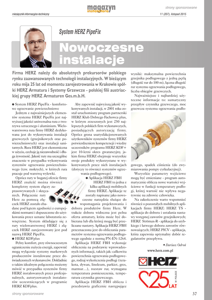 strony sponsorowane miesięcznik informacyjno-techniczny 11 (207), listopad 2015 System HERZ PipeFix Nowoczesne instalacje Firma HERZ należy do absolutnych prekursorów polskiego rynku zaawansowanych technologii instalacyjnych. W bieżącym roku mija 25 lat od momentu zarejestrowania w Krakowie spółki HERZ Armatura i Systemy Grzewcze - polskiej filii austriackiej grupy HERZ Armaturen Ges.m.b.H. l System HERZ PipeFix - komfortowe ogrzewanie powierzchniowe Jednym z najważniejszych elementów systemu HERZ PipeFix jest najwyższej jakości uniwersalna rura z tworzywa sztucznego i aluminium. Wielowarstwowa rura firmy HERZ dedykowana jest do wykonywania instalacji grzewczych (grzejnikowych oraz powierzchniowych) oraz instalacji sanitarnych. Rura HERZ jest ekonomiczna w użyciu, cechuje ją niezawodność i długa żywotność. Jakość rury ma szczególne znaczenie w przypadku wykonywania systemów ogrzewania powierzchniowego (tzw. mokrych), w których rura pracuje pod warstwą wylewki. Oprócz rury w bogatej ofercie firmy HERZ znaleźć można również kompletny system złączy zaprasowywanych i skręcanych. Połączenie rury Herz za pomocą złączek HERZ zostało zbadane pod kątem zgodności z europejskimi normami i dopuszczone do użytkowania przez uznane laboratoria zewnętrzne. System składający się z rury wielowarstwowej HERZ i złączek HERZ zarejestrowany jest pod nazwą HERZ PipeFix. l HERZ KDFplus Pełny komfort, przy równoczesnym ograniczeniu zużycia energii, zapewnić mogą wyłącznie systemy markowych producentów instalowane przez doświadczonych wykonawców. Dokładnie o takim idealnym połączeniu możemy mówić w przypadku systemów firmy HERZ instalowanych przez profesjonalnych, autoryzowanych instalatorów uczestniczących w programie HERZ KDFplus. strony sponsorowane Aby zapewnić najwyższą jakość wykonywanych instalacji, w 2001 roku został uruchomiony program partnerski HERZ Klub Dobrego Fachowca plus, w którym zrzeszonych jest 250 najlepszych polskich firm wykonawczych, posiadających autoryzację firmy. Oprócz grona usatysfakcjonowanych użytkowników systemów firmy HERZ potwierdzeniem kompetencji i wiedzy uczestników programu HERZ KDF+ jest 10-letni okres gwarancyjny, jakim firma HERZ obejmuje wszystkie swoje produkty wykorzystane w wykonywanych przez nich instalacjach (dotyczy to również systemów ogrzewania podłogowego). l Aplikacja HERZ FBH HERZ FBH to jedna z kilku aplikacji mobilnych firmy HERZ. Aplikacje te zostały napisane jako nowoczesne narzędzia służące do wspomagania projektowania i doboru produktów firmy Herz. W trakcie doboru widoczna jest pełna oferta armatury, która może być dobierana lub dla której mogą być przeliczane nastawy. Aplikacja HERZ FBH przeznaczona jest do obliczania parametrów systemu ogrzewania podłogowego zgodnie z normą PN-EN-1264. Aplikacja HERZ FBH wykonuje obliczenia na podstawie wprowadzonych informacji, takich jak: całkowita powierzchnia ogrzewania podłogowego, rodzaj wykończenia podłogi (terakota, dywan, linoleum, parkiet, gres, marmur…), rozstaw rur, wymagana temperatura pomieszczenia, temperatura czynnika grzewczego. Aplikacja HERZ FBH oblicza i przedstawia graficznie następujące wyniki: maksymalna powierzchnia grzejnika podłogowego z jedną pętlą (długość rur do 100 m), łączna długość rur systemu ogrzewania podłogowego, liczba obiegów grzewczych. Najważniejsze i najbardziej użyteczne informacje to: sumaryczny przepływ czynnika grzewczego, moc grzewcza systemu ogrzewania podło- gowego, spadek ciśnienia (do zwymiarowania pompy cyrkulacyjnej). Wszystkie parametry wejściowe mogą być zmieniane - program automatycznie oblicza nowe wartości wyjściowe w funkcji temperatury podłogi, której wartość nie wpływa negatywnie na zdrowie człowieka. Na zakończenie warto wspomnieć również o pozostałych mobilnych aplikacjach firmy HERZ: HERZ TS aplikacja do doboru i ustalania nastawy wstępnej zaworów grzejnikowych; HERZ Strömax-R - aplikacja do szybkiego i łatwego doboru zaworów równoważących; HERZ PICV - aplikacja, która zapewnia optymalny dobór regulatorów przepływu. l Dariusz Odroń www.herz.com.pl 37
