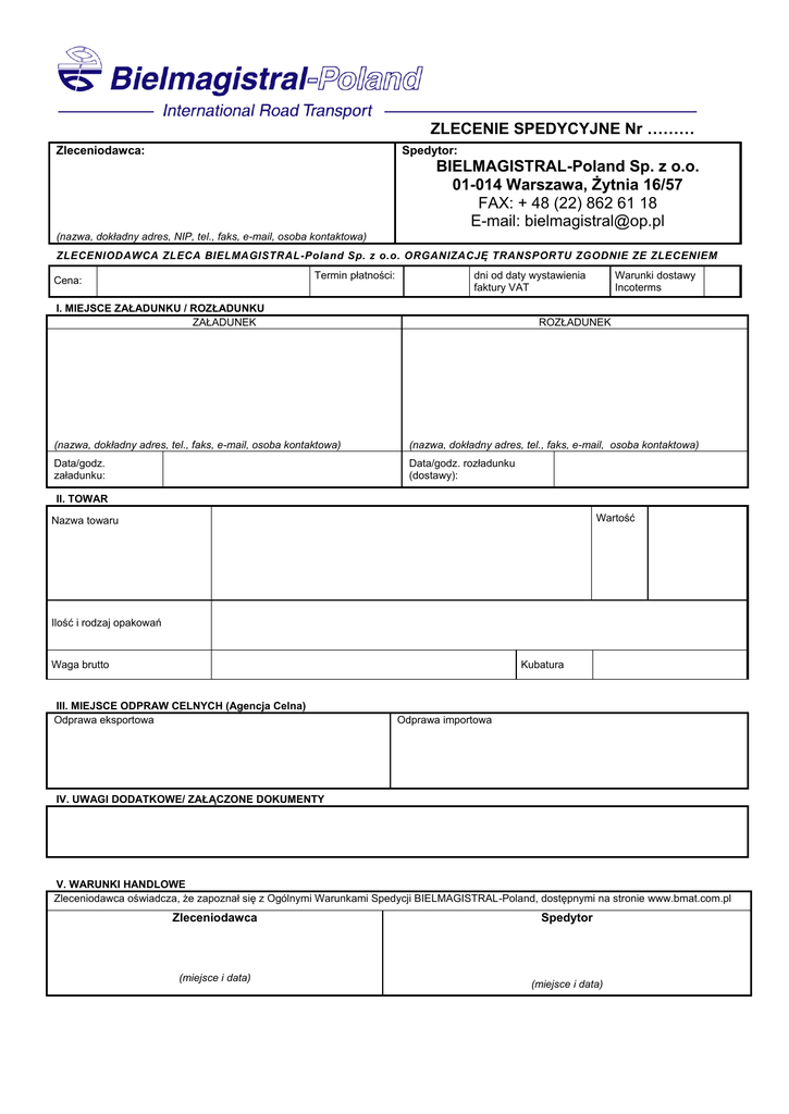 ZLECENIE SPEDYCYJNE Nr ……… BIELMAGISTRAL