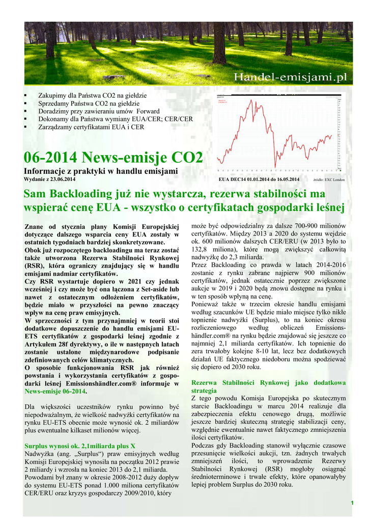 Zakupimy dla Państwa CO2 na giełdzie Sprzedamy Państwa CO2 na giełdzie Doradzimy przy zawieraniu umów Forward Dokonamy dla Państwa wymiany EUA/CER; CER/CER Zarządzamy certyfikatami EUA i CER 06-2014 News-emisje CO2 Informacje z praktyki w handlu emisjami Wydanie z 23.06.2014 EUA DEC14 01.01.2014 do 16.05.2014 źródło: EXC London Sam Backloading już nie wystarcza, rezerwa stabilności ma wspierać cenę EUA - wszystko o certyfikatach gospodarki leśnej Znane od stycznia plany Komisji Europejskiej dotyczące dalszego wsparcia ceny EUA zostały w ostatnich tygodniach bardziej skonkretyzowane. Obok już rozpoczętego backloadingu ma teraz zostać także utworzona Rezerwa Stabilności Rynkowej (RSR), która ograniczy znajdujący się w handlu emisjami nadmiar certyfikatów. Czy RSR wystartuje dopiero w 2021 czy jednak wcześniej i czy może być ona łączona z Set-aside lub nawet z ostatecznym odłożeniem certyfikatów, będzie miało w przyszłości na pewno znaczący wpływ na cenę praw emisyjnych. W sprzeczności z tym przynajmniej w teorii stoi dodatkowe dopuszczenie do handlu emisjami EUETS certyfikatów z gospodarki leśnej zgodnie z Artykułem 28f dyrektywy, o ile w następnych latach zostanie ustalone międzynarodowe podpisanie zdefiniowanych celów klimatycznych. O sposobie funkcjonowania RSR jak również powstania i wykorzystania certyfikatów z gospodarki leśnej Emissionshändler.com® informuje w News-emisje 06-2014. Dla większości uczestników rynku powinno być niepodważalnym, że wielkość nadwyżki certyfikatów na rynku EU-ETS obecnie może wynosić ok. 2 miliardów plus ewentualne kilkaset milionów więcej. Surplus wynosi ok. 2,1miliarda plus X Nadwyżka (ang. „Surplus“) praw emisyjnych według Komisji Europejskiej wynosiła na początku 2012 prawie 2 miliardy i wzrosła na koniec 2013 do 2,1 miliarda. Powodami był znany w okresie 2008-2012 duży dopływ do systemu EU-ETS ponad 1.000 miliona certyfikatów CER/ERU oraz kryzys gospodarczy 2009/2010, który może być odpowiedzialny za dalsze 700-900 milionów certyfikatów. Między 2013 a 2020 do systemu wejdzie ok. 600 milionów dalszych CER/ERU (w 2013 było to 132,8 miliona), które mogą zwiększyć całkowitą nadwyżkę do 2,3 miliarda. Przez Backloading co prawda w latach 2014-2016 zostanie z rynku zabrane najpierw 900 milionów certyfikatów, jednak ostatecznie poprzez zwiększone aukcje w 2019 i 2020 będą znowu dostępne na rynku i w ten sposób wpłyną na cenę. Ponieważ także w trzecim okresie handlu emisjami według szacunków UE będzie miało miejsce tylko nikłe topnienie nadwyżki (Surplus), to na koniec okresu rozliczeniowego według obliczeń Emissionshändler.com® na rynku będzie znajdować się jeszcze co najmniej 2,1 miliarda certyfikatów. Ich topnienie do zera trwałoby kolejne 8-10 lat, lecz bez dodatkowych działań UE faktycznego niedoboru można spodziewać się dopiero od 2030 roku. Rezerwa Stabilności Rynkowej jako dodatkowa strategia Z tego powodu Komisja Europejska po skutecznym starcie Backloadingu w marcu 2014 realizuje dla zabezpieczenia efektu cenowego drugą, możliwie jeszcze bardziej skuteczną strategię stabilizacji ceny, względnie ewentualnie nawet faktycznego zmniejszenia ilości certyfikatów. Podczas gdy Backloading stanowił wyłącznie czasowe przesunięcie wielkości aukcji, tzn. żadnych trwałych zmniejszeń ilości, to wprowadzenie Rezerwy Stabilności Rynkowej (RSR) mogłoby osiągnąć średnioterminowe i trwałe efekty, które opanowałyby lepiej problem Surplus do 2030 roku. 1 Jak pisze Komisja Europejska na swojej specjalnej stronie internetowej http://ec.europa.eu/clima/policies/ets/reform/index_en.htm, dwoma głównymi celami wprowadzenia RSR byłoby: a) Zmniejszenie (najpierw) powstałego Surplus po starcie RSR b) Zwiększenie zdolności oporu systemu EU-ETS przeciwko wahaniom cen Cel a), zmniejszenie Surplus było także celem Backloadingu. Przy RSR zostanie to zapewne także osiągnięte i funkcja ta (poniżej opisana dokładniej) jest bardzo podobna do Backloadingu. Według określonych zasad z rynku będą także zabrane wielkości aukcyjne, które jednak – w odróżnieniu do Backloadingu – nie będą w określonym wcześniej momencie wprowadzane znowu do systemu, lecz tylko przy określonych warunkach. Jest to o tyle istotna zmiana do Backloadingu, ponieważ te warunki ponownego wprowadzenia certyfikatów z rezerwy mogą nastąpić bardzo późno lub teoretycznie wcale. Cel b), czy zwiększenie zdolności oporu systemu EUETS przeciwko wahaniom cen, będzie funkcjonował w praktyce, dopiero się zobaczy. W każdym wypadku wydaje się być zrozumiałym, że z powodu typowych strategii hedgingowych sektora energetycznego wspomagany jest regularny fizyczny popyt, który zazwyczaj jest 2-3 na lata z góry zabezpieczony i w ten sposób wzmacnia stabilność ceny. Podsumowując można z góry powiedzieć, że strategia RSR jest próbą „zarządzania“ nadwyżką 400-833 milionów certyfikatów a po przekroczeniu wielkości 833 milionów zapakowaniem odpowiedniej nadwyżki do „skrzyni“ i otwarcie jej znowu w lepszych czasach (względnie trzymanie jej zamkniętej!) Terminarz i sposób funkcjonowania RSR Propozycja Komisji Europejskiej dla RSR Rezerwy Stabilności Rynkowej (ang. Market Stability Reserve, MSR) przewiduje, że ma ona zostać uchwalona najpóźniej w 2015 roku i powinna znaleźć zastosowanie od 2021. Wczesna zapowiedź jest ze strony Komisji Europejskiej warta starań, aby ta jeszcze w trzecim okresie rozliczeniowym wpłynęła psychologicznie na rynki. Szczególnie dlatego, że w roku 2017 znowu zostaną wprowadzone pełne aukcje a wstrzymane 900 milionów EUA zostanie od 2019 znowu wprowadzone na rynek, co mogłoby spowodować spadek cen. Dla zastosowania RSR musiano najpierw zdefiniować nowe pojęcie: jest to „AiC“ (Allowances in Circulation). W ten sposób zdefiniowano „cyrkulującą” nadwyżkę, czyli 