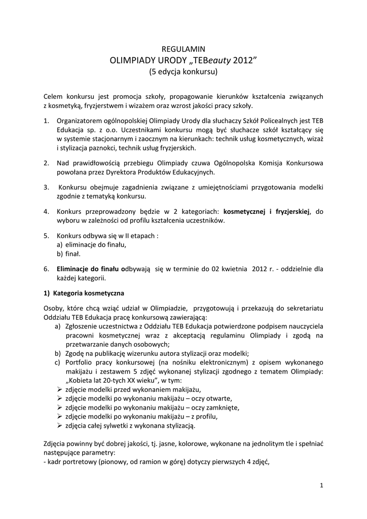 REGULAMIN OLIMPIADY URODY „TEBeauty 2012” (5 edycja konkursu) Celem konkursu jest promocja szkoły, propagowanie kierunków kształcenia związanych z kosmetyką, fryzjerstwem i wizażem oraz wzrost jakości pracy szkoły. 1. Organizatorem ogólnopolskiej Olimpiady Urody dla słuchaczy Szkół Policealnych jest TEB Edukacja sp. z o.o. Uczestnikami konkursu mogą być słuchacze szkół kształcący się w systemie stacjonarnym i zaocznym na kierunkach: technik usług kosmetycznych, wizaż i stylizacja paznokci, technik usług fryzjerskich. 2. Nad prawidłowością przebiegu Olimpiady czuwa Ogólnopolska Komisja Konkursowa powołana przez Dyrektora Produktów Edukacyjnych. 3. Konkursu obejmuje zagadnienia związane z umiejętnościami przygotowania modelki zgodnie z tematyką konkursu. 4. Konkurs przeprowadzony będzie w 2 kategoriach: kosmetycznej i fryzjerskiej, do wyboru w zależności od profilu kształcenia uczestników. 5. Konkurs odbywa się w II etapach : a) eliminacje do finału, b) finał. 6. Eliminacje do finału odbywają się w terminie do 02 kwietnia 2012 r. - oddzielnie dla każdej kategorii. 1) Kategoria kosmetyczna Osoby, które chcą wziąć udział w Olimpiadzie, przygotowują i przekazują do sekretariatu Oddziału TEB Edukacja pracę konkursową zawierającą: a) Zgłoszenie uczestnictwa z Oddziału TEB Edukacja potwierdzone podpisem nauczyciela pracowni kosmetycznej wraz z akceptacją regulaminu Olimpiady i zgodą na przetwarzanie danych osobowych; b) Zgodę na publikację wizerunku autora stylizacji oraz modelki; c) Portfolio pracy konkursowej (na nośniku elektronicznym) z opisem wykonanego makijażu i zestawem 5 zdjęć wykonanej stylizacji zgodnego z tematem Olimpiady: „Kobieta lat 20-tych XX wieku”, w tym: zdjęcie modelki przed wykonaniem makijażu, zdjęcie modelki po wykonaniu makijażu – oczy otwarte, zdjęcie modelki po wykonaniu makijażu – oczy zamknięte, zdjęcie modelki po wykonaniu makijażu – z profilu, zdjęcia całej sylwetki z wykonana stylizacją. Zdjęcia powinny być dobrej jakości, tj. jasne, kolorowe, wykonane na jednolitym tle i spełniać następujące parametry: - kadr portretowy (pionowy, od ramion w górę) dotyczy pierwszych 4 zdjęć, 1 - min. szerokość: 1500 px, - min. wysokość: 1500 px, - max. objętość jednego pliku: 2 MB, - format pliku: JPG. Przesłane zdjęcia nie mogą być poddane obróbce w programach graficznych typu Photo Shop itp. Modelki na zdjęciach nie mogą mieć wykonanego makijażu permanentnego. Charakter makijażu powinien być dopełnieniem stylizacji i być dostosowany do typu urody modelki. Dozwolone jest użycie ozdób. Oddziały otrzymane od słuchaczy prace konkursowe przesyłają do dnia 02 kwietnia 2012 na adres mailowy: [email protected] Nadesłane prace będą oceniane przez Ogólnopolską Komisję Konkursową wg kryteriów opisanych pkt 7 niniejszego regulaminu. Prace konkursowe nie spełniające podanych powyższych wymogów nie podlegają ocenie. Nadesłane materiały nie będą zwracane. II. Kategoria fryzjerska Osoby, które chcą wziąć udział w Olimpiadzie, przygotowują i przekazują do sekretariatu Oddziału TEB Edukacja pracę konkursową zawierającą: a) Wydrukowane zgłoszenie uczestnictwa z oddziału TEB Edukacja potwierdzone podpisem nauczyciela pracowni fryzjerskiej wraz z akceptacją regulaminu Olimpiady i zgodą na przetwarzanie danych osobowych; b) Zgodę na publikację wizerunku autora stylizacji oraz modelki; c) Portfolio pracy konkursowej (na nośniku elektronicznym) z opisem wykonanej fryzury i zestawem 5 zdjęć wykonanej stylizacji zgodnego z tematem Olimpiady: „„Kobieta lat 20-tych XX wieku”,w tym: zdjęcie modelki przed wykonaniem fryzury zdjęcie modelki po wykonaniu fryzury – z przodu zdjęcie modelki po wykonaniu fryzury – z tyłu zdjęcie modelki po wykonaniu fryzury – z profilu zdjęcie całej sylwetki z wykonana stylizacją fryzury Zdjęcia powinny być dobrej jakości, tj. jasne, kolorowe, wykonane na jednolitym tle i spełniać następujące parametry: - kadr portretowy (pionowy, od ramion w górę) dotyczy pierwszych 4 zdjęć, - min. szerokość: 1500 px - min. wysokość: 1500 px - max. objętość jednego pliku: 2 MB - format pliku: JPG. Przesłane zdjęcia nie mogą być poddane obróbce w programach graficznych typu Photo Shop itp. Charakter fryzury powinien być dopełnieniem stylizacji i być dostosowany do typu urody 2 modelki. Dozwolone jest użycie ozdób. Oddziały otrzymane od słuchaczy prace konkursowe przesyłają do dnia 02 kwietnia 2012 na adres mailowy: [email protected] Nadesłane prace będą oceniane przez Ogólnopolską Komisję Konkursową wg kryteriów opisanych pkt 7 niniejszego regulaminu. Prace konkursowe nie spełniające podanych powyższych wymogów nie podlegają ocenie. Nadesłane materiały nie będą zwracane. 7. Kryteria oceny Zarówno w etapie eliminacyjnym, jak i w finale obowiązywać będą jednakowe kryteria oceny w zależności od kategorii. a) Kategoria kosmetyczna Kryterium Liczba punktów Technika wykonania makijażu (technika pracy, czystość wykonania) 10 Zgodność stylizacji fryzury z tematem przewodnim 5 Twórcze podejście do tematu (oryginalność, pomysłowość, kreatywność) 5 Fryzura i stylizacja 5 Ogólne wrażenie (harmonia kompozycji, walory estetyczne i stylistyczne 5 dopasowane do modelki). b) Kategoria fryzjerska Kryterium Liczba punktów Technika wykonania fryzury (technika pracy, czystość wykonania) 10 Zgodność stylizacji fryzury z tematem przewodnim 5 Twórcze podejście do tematu (oryginalność, pomysłowość, kreatywność) 5 Makijaż i stylizacja 5 Ogólne wrażenie (harmonia kompozycji, walory estetyczne i stylistyczne 5 dopasowane do modelki). 8. Finał Olimpiady Do finału Ogólnopolskiej Olimpiady TEBeauty 2012 zostanie zaproszonych po 10 osób w każdej kategorii, z czego: - 9 osób w każdej kategorii wyłoni jury na podstawie nadesłanych materiałów; - 