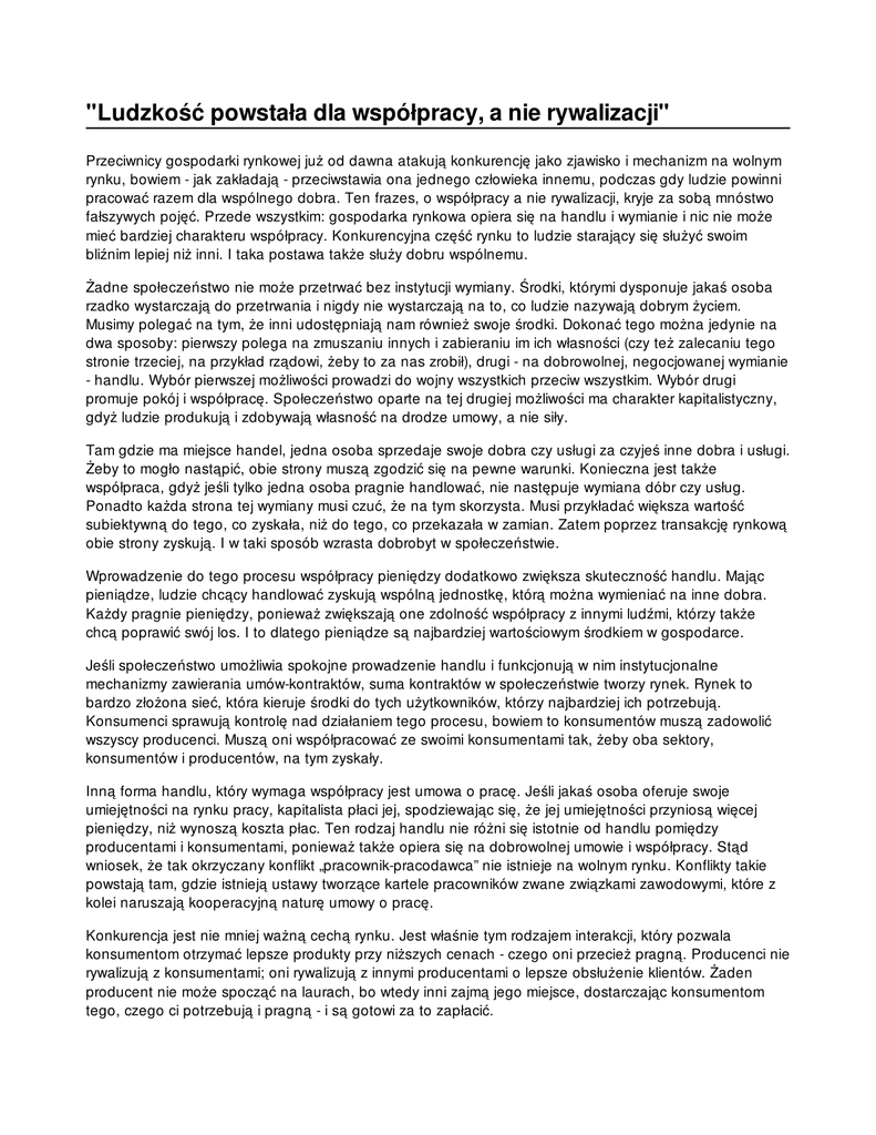 "Ludzkość powstała dla współpracy, a nie rywalizacji" Przeciwnicy gospodarki rynkowej już od dawna atakują konkurencję jako zjawisko i mechanizm na wolnym rynku, bowiem - jak zakładają - przeciwstawia ona jednego człowieka innemu, podczas gdy ludzie powinni pracować razem dla wspólnego dobra. Ten frazes, o współpracy a nie rywalizacji, kryje za sobą mnóstwo fałszywych pojęć. Przede wszystkim: gospodarka rynkowa opiera się na handlu i wymianie i nic nie może mieć bardziej charakteru współpracy. Konkurencyjna część rynku to ludzie starający się służyć swoim bliźnim lepiej niż inni. I taka postawa także służy dobru wspólnemu. Żadne społeczeństwo nie może przetrwać bez instytucji wymiany. Środki, którymi dysponuje jakaś osoba rzadko wystarczają do przetrwania i nigdy nie wystarczają na to, co ludzie nazywają dobrym życiem. Musimy polegać na tym, że inni udostępniają nam również swoje środki. Dokonać tego można jedynie na dwa sposoby: pierwszy polega na zmuszaniu innych i zabieraniu im ich własności (czy też zalecaniu tego stronie trzeciej, na przykład rządowi, żeby to za nas zrobił), drugi - na dobrowolnej, negocjowanej wymianie - handlu. Wybór pierwszej możliwości prowadzi do wojny wszystkich przeciw wszystkim. Wybór drugi promuje pokój i współpracę. Społeczeństwo oparte na tej drugiej możliwości ma charakter kapitalistyczny, gdyż ludzie produkują i zdobywają własność na drodze umowy, a nie siły. Tam gdzie ma miejsce handel, jedna osoba sprzedaje swoje dobra czy usługi za czyjeś inne dobra i usługi. Żeby to mogło nastąpić, obie strony muszą zgodzić się na pewne warunki. Konieczna jest także współpraca, gdyż jeśli tylko jedna osoba pragnie handlować, nie następuje wymiana dóbr czy usług. Ponadto każda strona tej wymiany musi czuć, że na tym skorzysta. Musi przykładać większa wartość subiektywną do tego, co zyskała, niż do tego, co przekazała w zamian. Zatem poprzez transakcję rynkową obie strony zyskują. I w taki sposób wzrasta dobrobyt w społeczeństwie. Wprowadzenie do tego procesu współpracy pieniędzy dodatkowo zwiększa skuteczność handlu. Mając pieniądze, ludzie chcący handlować zyskują wspólną jednostkę, którą można wymieniać na inne dobra. Każdy pragnie pieniędzy, ponieważ zwiększają one zdolność współpracy z innymi ludźmi, którzy także chcą poprawić swój los. I to dlatego pieniądze są najbardziej wartościowym środkiem w gospodarce. Jeśli społeczeństwo umożliwia spokojne prowadzenie handlu i funkcjonują w nim instytucjonalne mechanizmy zawierania umów-kontraktów, suma kontraktów w społeczeństwie tworzy rynek. Rynek to bardzo złożona sieć, która kieruje środki do tych użytkowników, którzy najbardziej ich potrzebują. Konsumenci sprawują kontrolę nad działaniem tego procesu, bowiem to konsumentów muszą zadowolić wszyscy producenci. Muszą oni współpracować ze swoimi konsumentami tak, żeby oba sektory, konsumentów i producentów, na tym zyskały. Inną forma handlu, który wymaga współpracy jest umowa o pracę. Jeśli jakaś osoba oferuje swoje umiejętności na rynku pracy, kapitalista płaci jej, spodziewając się, że jej umiejętności przyniosą więcej pieniędzy, niż wynoszą koszta płac. Ten rodzaj handlu nie różni się istotnie od handlu pomiędzy producentami i konsumentami, ponieważ także opiera się na dobrowolnej umowie i współpracy. Stąd wniosek, że tak okrzyczany konflikt „pracownik-pracodawca” nie istnieje na wolnym rynku. Konflikty takie powstają tam, gdzie istnieją ustawy tworzące kartele pracowników zwane związkami zawodowymi, które z kolei naruszają kooperacyjną naturę umowy o pracę. Konkurencja jest nie mniej ważną cechą rynku. Jest właśnie tym rodzajem interakcji, który pozwala konsumentom otrzymać lepsze produkty przy niższych cenach - czego oni przecież pragną. Producenci nie rywalizują z konsumentami; oni rywalizują z innymi producentami o lepsze obsłużenie klientów. Żaden producent nie może spocząć na laurach, bo wtedy inni zajmą jego miejsce, dostarczając konsumentom tego, czego ci potrzebują i pragną - i są gotowi za to zapłacić. Interwencjoniści często narzekają, że ci czy tamci producenci uzyskują nadmierne zyski; ale to właśnie istnienie konkurencji sprawia, że taka sytuacja nie może trwać na dłuższą metę. Wzrost zysku to sygnał dla innych producentów, że oni także powinni się włączyć w produkcję tego, co ten zwiększony zysk przynosi. Pojawienie się nowych producentów oznacza większą podaż, niższe ceny oraz zmniejszone zyski dla pierwotnego producenta. Właścicieli firm prywatnych często uważa się za pionierów konkurencji, jednak założenie to nie zawsze jest poprawne. Zbyt często ludzie zaangażowani w biznesie pragną użyć możliwości rządu do ograniczenia konkurencji. Naleganie na polityków, by ci nałożyli np. kontyngent na import oznacza, że protegowani biznesmeni krajowi nie muszą się martwić, iż zagraniczni biznesmeni będą produkowali lepsze produkty i sprzedawali je u nas. Biznes toleruje także regulacje rządowe, które go ograniczają, byle ich dolegliwość była mniejsza od tej powodowanej przez konkurencję. Jeśli producentom, konsumentom i pracownikom daje się swobodę wymiany, otrzymujemy równowagę sił współpracy i konkurencji powodującą, że każdemu członkowi społeczeństwa powodzi się na dłuższą metę, coraz lepiej. System interwencjonizmu - czy też tzw. gospodarki mieszanej - upośledza zdolność zarówno współpracy jak i konkurencji. Prowadzi to do marnotrawstwa i braku efektywności, a w konsekwencji niższego poziomu życia. Człowiek został stworzony do współpracy i rywalizacji i tylko system wolnej przedsiębiorczości sprawia, że oba te sposoby działania są jednocześnie możliwe. Llewellyn H. Rockwell, Jr. wolnosciowe_czy