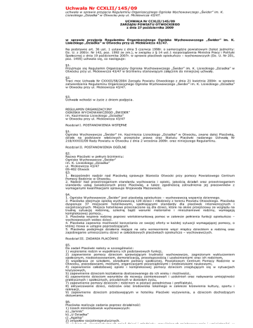 Uchwała Nr CCXLII/145/09 uchwała w sprawie przyjęcia Regulaminu Organizacyjnego Ogniska Wychowawczego „Świder” im. K. Lisieckiego „Dziadka” w Otwocku przy ul. Mickiewicza 43/47. UCHWAŁA Nr CCXLII/145/09 ZARZĄDU POWIATU OTWOCKIEGO z dnia 27 października 2009 w sprawie przyjęcia Regulaminu Organizacyjnego Ogniska Wychowawczego „Świder” im. K. Lisieckiego „Dziadka” w Otwocku przy ul. Mickiewicza 43/47. Na podstawie art. 36 ust. 1 ustawy z dnia 5 czerwca 1998r. o samorządzie powiatowym (tekst jednolity: Dz. U. z 2001r. Nr 142, poz. 1592 ze zm.), w związku z § 14 ust.1 rozporządzenia Ministra Pracy i Polityki Społecznej z dnia 19 października 2007r. w sprawie placówek opiekuńczo – wychowawczych (Dz. U. Nr 201, poz. 1455) uchwala się, co następuje: §1. Przyjmuje się Regulamin Organizacyjny Ogniska Wychowawczego „Świder” im. K. Lisieckiego „Dziadka” w Otwocku przy ul. Mickiewicza 43/47 w brzmieniu stanowiącym załącznik do niniejszej uchwały. §2. Traci moc Uchwała Nr CXXXII/58/2004 Zarządu Powiatu Otwockiego z dnia 21 kwietnia 2004r. w sprawie zatwierdzenia Regulaminu Organizacyjnego Ogniska Wychowawczego „Świder” im. K. Lisieckiego „Dziadka” w Otwocku przy ul. Mickiewicza 43/47. §3. Uchwała wchodzi w życie z dniem podjęcia. REGULAMIN ORGANIZACYJNY OGNISKA WYCHOWAWCZEGO „ŚWIDER” im. Kazimierza Lisieckiego „Dziadka” w Otwocku przy ul. Mickiewicza 43/47 Rozdział I. POSTANOWIENIA WSTĘPNE §1. Ognisko Wychowawcze „Świder” im. Kazimierza Lisieckiego „Dziadka” w Otwocku, zwane dalej Placówką, działa na podstawie właściwych przepisów prawa oraz Statutu Placówki nadanego Uchwałą Nr 218/XXXIII/09 Rady Powiatu w Otwocku z dnia 2 września 2009r. oraz niniejszego Regulaminu. Rozdział II. POSTANOWIENIA OGÓLNE §2. Nazwa Placówki w pełnym brzmieniu: Ognisko Wychowawcze „Świder” im. K. Lisieckiego „Dziadka” ul. Mickiewicza 43/47 05-402 Otwock §3. 1. Bezpośredni nadzór nad Placówką sprawuje Starosta Otwocki przy pomocy Powiatowego Centrum Pomocy Rodzinie w Otwocku. 2. Nadzór nad przestrzeganiem standardu wychowania i opieki, jakością działań oraz przestrzeganiem standardu usług świadczonych przez Placówkę, a także zgodnością zatrudnienia jej pracowników z wymaganymi kwalifikacjami sprawuje Wojewoda Mazowiecki. §4. 1. Ognisko Wychowawcze „Świder” jest placówką opiekuńczo – wychowawczą wsparcia dziennego. 2. Placówka obejmuje opieką wychowawczą 120 dzieci i młodzieży z terenu Powiatu Otwockiego. Placówka dysponuje 37 miejscami hotelikowymi, spełniającymi standardy dla placówek interwencyjnych i socjalizacyjnych. Miejsca hotelikowe przeznaczone są dla dzieci, które na okres przejściowy ze względu na trudną sytuację rodzinną, szkolną bądź warunki materialne i mieszkaniowe rodziny, wymagają kompleksowej pomocy.. 3. Placówka wspiera rodzinę poprzez wielokierunkową pomoc w zakresie pełnienia funkcji opiekuńczo – wychowawczych wobec dzieci. 4. Placówka zapewnia możliwość korzystania ze swojej oferty w każdej sytuacji wymagającej pomocy, o której mowa w ustępie poprzedzającym. 5. Placówka podejmuje działania mające na celu wzmocnienie więzi między dzieckiem a rodziną oraz zapobieganie umieszczaniu dzieci w całodobowych placówkach opiekuńczo – wychowawczych. Rozdział III. ZADANIA PLACÓWKI §5. Do zadań Placówki należy w szczególności: 1) wspieranie rodzin w wypełnianiu ich podstawowych funkcji, 2) zapewnienie pomocy dzieciom sprawiającym trudności wychowawcze, zagrożonym wykluczeniem społecznym, niedostosowaniem, demoralizacją, przestępczością i uzależnieniami oraz ich rodzinom, 3) współpraca ze szkołami, ośrodkami pomocy społecznej, Powiatowym Centrum Pomocy Rodzinie w Otwocku, pracodawcami, mediami, organizacjami pozarządowymi i środowiskami naukowymi, 4) zapewnienie całodobowej opieki i kompleksowej pomocy dzieciom znajdującym się w sytuacjach kryzysowych, 5) zapewnienie dzieciom kształcenia dostosowanego do ich wieku i możliwości, 6) zapewnienie dzieciom warunków do rozwoju zainteresowań i uzdolnień oraz nabywania umiejętności praktycznych i społecznych, przydatnych w dorosłym życiu, 7) zapewnienie pomocy dzieciom i rodzinom w postaci poradnictwa i profilaktyki, 8) aktywizowanie dzieci, rodziców oraz środowiska lokalnego w zakresie krzewienia kultury, sportu i rekreacji, 9) zapewnienie dzieciom przebywającym w hoteliku Placówki wyżywienia, a dzieciom dochodzącym dożywiania. §6. Placówka realizuje zadania poprzez działalność: 1) trzech miniśrodowisk wychowawczych: a) „Jamnik” b) „U Dziadka” c) „Agatka” 2) zespołów socjoterapeutycznych. 3) ulubionych, specjalistycznych zajęć dzieci i młodzieży, rozwijających zainteresowania i umiejętności, w 3) ulubionych, specjalistycznych zajęć dzieci i młodzieży, rozwijających zainteresowania i umiejętności, w tym także zawodowych. 4) organizację świąt i uroczystości oraz imprez i wydarzeń wychowawczych dla swych wychowanków, środowiska lokalnego i zaproszonych gości. 5) organizację wypoczynku letniego i zimowego dla dzieci i młodzieży. 6) organizację wczasów terapeutycznych z pedagogiem dla rodzin zagrożonych wykluczeniem społecznym i marginalizacją. §7. Placówka stwarza warunki do: 1) fizycznego, psychicznego i poznawczego rozwoju dziecka, 2) poszanowania podmiotowości dziecka, wysłuchiwania jego zdania i w miarę możliwości uwzględniania jego wniosków we wszystkich dotyczących go sprawach oraz informowania dziecka o podejmowanych wobec niego działaniach, 3) zapewnienia poczucia bezpieczeństwa, 4) dbałości o poszanowanie i podtrzymywanie związków emocjonalnych dziecka z rodzicami, rodzeństwem i innymi osobami, zarówno spoza Placówki, jak i przebywających i zatrudnionych w Placówce, 5) uczenia nawiązywania więzi uczuciowych oraz związków interpersonalnych, 6) poszanowania potrzeb