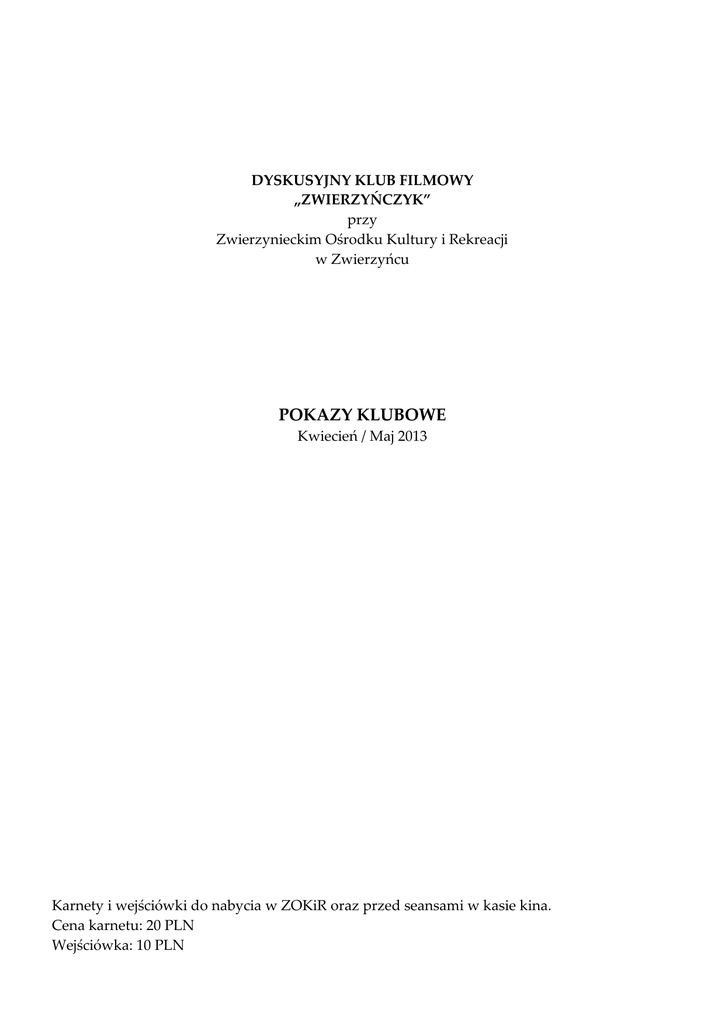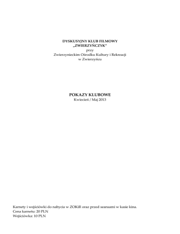 DYSKUSYJNY KLUB FILMOWY „ZWIERZYŃCZYK” przy Zwierzynieckim Ośrodku Kultury i Rekreacji w Zwierzyńcu POKAZY KLUBOWE Kwiecień / Maj 2013 Karnety i wejściówki do nabycia w ZOKiR oraz przed seansami w kasie kina. Cena karnetu: 20 PLN Wejściówka: 10 PLN 25.04.2013 czwartek g. 18.00 SUPERMARKET reż. Maciej Żak, Polska 2012 (84 min) w.: Marian Dziędziel, Mikołaj Roznerski, Wojciech Zieliński Thriller, który zaczyna się niczym film obyczajowy. Ostatni dzień roku, tłumy ludzi w supermarkecie i wyzwanie dla ochrony. Ochroniarze chcą się wykazać, udowodnić przełożonym, że są górą w walce ze złodziejami. Debiutujący w tym zawodzie pracownik ochrony, namierza klienta, który między półkami zjadł batonika. Ten banalny incydent uruchomi wkrótce lawinę absurdalnych zdarzeń… 2.05.2013 czwartek g. 18.00 WHISKY DLA ANIOŁÓW reż. Ken Loach, Anglia/Francja/Belgia/Włochy 2012 (112 min) w.: Paul Brannigan, John Henshaw, William Ruane Nagroda Jury na MFF w Cannes’ 2012 Młody wandal, Robbie, dostaje od sędziego szansę na pozostanie na wolności. Zamiast odsiadywać wyrok za napaść w więzieniu, chłopak ma odkupić swoją winę pracami społecznymi. Co z tego jednak, kiedy w grupie wykonującej użyteczne prace na rzecz społeczeństwa, spotyka podobnych sobie wyrzutków. Wkrótce w ich głowach pojawi się pomysł niezwykłego „skoku stulecia”. Bynajmniej nie na bank, a na gorzelnię, gdzie znajduje się unikalna i wyjątkowo cenna dla koneserów whisky… 9.05.2013 czwartek g. 18.00 MIŁOŚĆ reż. Michael Haneke, Austria/Francja/Niemcy 2012 (127 min) w.: Jean-Louis Trintignant, Emmanuelle Riva, Isabelle Huppert Złota Palma na MFF w Cannes’ 2012, Europejskie Nagrody Filmowe’ 2012 za najlepszy film, reżyserię, rolę kobiecą i męską; Cezary’ 2013 za najlepszy film, reżyserię, scenariusz, rolę kobiecą i męską; Złoty Glob’ 2013 za najlepszy film zagraniczny; Oscar’ 2013 za najlepszy film zagraniczny Najgłośniejszy i najczęściej nagradzany film ubiegłego roku. Wzruszająca opowieść o schyłku życia pary starych ludzi. Pogodzonych z upływem czasu i wszystkimi ciemnymi stronami starości. I niezmiennie pielęgnującymi swoją miłość, do samego końca. Kiedy Anne ulega atakowi, który ją unieruchamia, ich dotychczasowy model życia przestaje istnieć. Ich miłość zostaje poddana najcięższej próbie… . 16.05.2013 czwartek g. 18.00 BEJBI BLUES reż. Katarzyna Rosłaniec, Polska 2012 (98 min) w.: Magdalena Berus, Nikodem Rozbicki, Danuta Stenka Siedemnastoletnia Natalia ma dziecko ze swoim rówieśnikiem i generalnie wydaje się zadowolona z życia. Sytuacja zaczyna się komplikować, gdy jej matka wyjeżdża za granicę, a Natalia nie ma innego wyjścia niż przejść przyspieszony kurs dorosłości. Jej chłopak wprowadza się do niej i wspólnie próbują stworzyć coś na wzór rodziny. To nie może się udać, skoro Natalia mentalnie sama jest jeszcze dzieckiem i stawiając na samodzielność z miejsca wpada w tarapaty… 23.05.2013 czwartek g. 18.00 RAJ: MIŁOŚĆ reż. Ulrich Seidl, Austria/Niemcy/Francja 2012 (120 min) w.: Margarete Tiesel, Peter Kazungu, Inge Maux Pierwsza część trylogii pod wspólnym tytułem „Raj”. Całość traktuje o marzeniach, złudzeniach i desperackich próbach poszukiwania szczęścia w konsumpcyjnym społeczeństwie dobrobytu. W pierwszej części, nieatrakcyjna kobieta po 50. decyduje się na wyprawę dla amatorów seksturystyki. Na afrykańskiej plaży Teresa i inne spragnione erotycznych wrażeń Europejki, mogą kupić sobie chwile przyjemności. Wszak wszystko jest na sprzedaż…