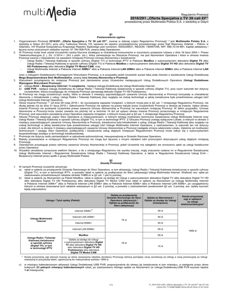 Regulamin Promocji 2016/291 „Oferta Specjalna z TV 39 cali EF” prowadzonej przez Multimedia Polska S.A. z siedzibą w Gdyni §1 Postanowienia ogólne Organizatorem Promocji 2016/291 „Oferta Specjalna z TV 39 cali EF”, zwanej w dalszej części Regulaminu Promocją¹, ² jest Multimedia Polska S.A. z siedzibą w Gdyni (81-341), przy ulicy Tadeusza Wendy 7/9, wpisana do rejestru przedsiębiorców prowadzonego przez Sąd Rejonowy Gdańsk – Północ w Gdańsku, VIII Wydział Gospodarczy Krajowego Rejestru Sądowego pod numerem: 0000238931, REGON: 190007345, NIP: 586-10-44-881, kapitał zakładowy i łączna suma uiszczonych wkładów wynosi: 91 764 808 PLN, zwana dalej Operatorem. 2. W Promocji może brać udział (Uczestnik) osoba fizyczna działająca w charakterze konsumenta w rozumieniu przepisów Ustawy z dnia 16 lipca 2004 r. Prawo Telekomunikacyjne (t. j. Dz. U.2014 r. 243 z późn. zm.), która zamieszkuje na Obszarze Promocji, nie jest Abonentem Operatora i która w okresie trwania Promocji zawrze z Operatorem na zasadach niniejszej Promocji Umowę Abonencką o świadczenie: Usługi Radia i Telewizji Kablowej w sposób cyfrowy (Digital TV) w technologii IPTV w Pakiecie MaxBox z wykorzystaniem dekodera Digital TV albo Usługi Radia i Telewizji Kablowej w sposób cyfrowy (Digital TV) w Pakiecie MaxBox z wykorzystaniem dekodera Digital TV HD albo dekodera Digital TV HD Podstawowy albo dekodera Digital TV Moduł CAM, oraz Usługi Multimedia Internet w Pakiecie Internet 30Mb+4 albo w Pakiecie Internet LAN 20Mb+ albo w Pakiecie Internet 60Mb+ albo w Pakiecie Internet LAN 60Mb+, wraz z Usługami Dodatkowymi Wymaganymi Warunkami Promocji, a w przypadku jeżeli Uczestnik wyrazi taką wolę również o świadczenie Usługi Dodatkowej Mega Bezprzewodowa Sieć Multimedialna, zwaną dalej Umową Abonencką w Promocji. 3. Warunkiem przystąpienia do niniejszej Promocji jest zamówienie przez Uczestnika następujących Usług Dodatkowych Operatora (Usługi Dodatkowe Wymagane Warunkami Promocji): a) Usługa Emil – Bezpieczny Internet / 3 urządzenia - będąca Usługą Dodatkową do Usługi Multimedia Internet; b) USB PVR - będąca Usługą Dodatkową do Usługi Radia i Telewizji Kablowej świadczonej w sposób cyfrowy (Digital TV), przy czym warunek ten dotyczy Uczestników, którzy przystępując do niniejszej Promocji zamawiają dekoder Digital TV HD Podstawowy. 4. W Promocji nie mogą uczestniczyć osoby, które w okresie 3 miesięcy poprzedzających zawarcie Umowy Abonenckiej w Promocji korzystały w charakterze Abonenta z którejkolwiek z usług: Usługi Radia i Telewizji Kablowej (bez względu na rodzaj technologii w jakiej świadczona była przedmiotowa usługa) lub/i Usługi Multimedia Internet Operatora. 5) 5. Okres trwania Promocji : od dnia 09 maja 2016 r. do wyczerpania zapasów Urządzeń, o których mowa jest w §3 ust. 1 niniejszego Regulaminu Promocji, nie dłużej jednak niż do dnia 31 lipca 2016 r. Zakończenie Promocji nie wpływa na prawa nabyte przez Uczestników Promocji w okresie jej trwania. Upływ okresu trwania Promocji nie pozbawia Uczestnika prawa zawarcia Umowy Abonenckiej w Promocji na warunkach niniejszej Promocji. W takim przypadku, Umowa Abonencka w Promocji może zostać zawarta nie później niż w terminie 14 dni od upływu okresu trwania Promocji oznaczonego w niniejszym Regulaminie Promocji, pod warunkiem posiadania przez Operatora zapasów Urządzeń, o których mowa jest w §3 ust. 1 niniejszego Regulaminu Promocji. 6. Obszar Promocji obejmuje części Sieci Operatora w miejscowościach, w których istnieją możliwości techniczne świadczenia Usługi Multimedia Internet oraz Usługi Radia i Telewizji Kablowej w sposób cyfrowy (Digital TV), w tym w technologii IPTV. Z Obszaru Promocji zostają wyłączone Lokale, w których w okresie 3 miesięcy poprzedzających zawarcie Umowy Abonenckiej w Promocji, świadczona była którakolwiek z usług: Usługa Radia i Telewizji Kablowej (bez względu na rodzaj technologii w jakiej świadczona była przedmiotowa usługa) lub/i Usługa Multimedia Internet Operatora, z zastrzeżeniem, iż warunek ten nie dotyczy Lokali, dla których w okresie 3 miesięcy poprzedzających zawarcie Umowy Abonenckiej w Promocji nastąpiła zmiana właściciela Lokalu. Zależnie od możliwości technicznych i zasięgu Sieci Operatora, podłączenie i świadczenie usług objętych niniejszym Regulaminem Promocji może odbyć się z wykorzystaniem bezpośredniego dostępu w technologii światłowodowej. 7. Promocja nie dotyczy osób zamieszkałych w zabudowie jednorodzinnej, niewyposażonej w Gniazdo Sieciowe Operatora. 8. Rabaty przewidziane w niniejszym Regulaminie Promocji nie mogą być łączone z innymi rabatami lub/i promocjami dotyczącymi usług objętych niniejszą Promocją. 9. Operatorowi przysługuje prawo odmowy zawarcia Umowy Abonenckiej w Promocji, jeżeli Uczestnik ma zaległości we wnoszeniu opłat za usługi świadczone przez Operatora. 10. Wszelkie określenia oznaczone wielkimi literami, o ile z niniejszego Regulaminu nie wynika inaczej, mają znaczenie nadane im w Regulaminie Świadczenia Usługi Multimedia Internet i Regulaminie Świadczenia Usługi Radia i Telewizji Kablowej Operatora, a także w Regulaminie Świadczenia Usługi Emil – Bezpieczny Internet przez spółki z grupy Multimedia Polska. 1. §2 Zasady Promocji 1. W ramach Promocji Uczestnik otrzymuje: a) rabat w opłacie za przyłączenie Gniazda Sieciowego do Sieci Operatora, w tym aktywację, Usługi Radia i Telewizji Kablowej świadczonej w sposób cyfrowy (Digital TV), w tym w technologii IPTV, a ponadto rabat w opłacie za podłączenie do Sieci (aktywację) Usługi Multimedia Internet. Wielkość ww. opłat po zastosowaniu przedmiotowych rabatów określa TABELA w §2 ust. 1 pkt b) poniżej; b) rabat w opłacie za Abonament za Pakiet MaxBox, rabat w opłacie za dostęp do Usługi z wykorzystaniem dekodera Digital TV albo dekodera Digital