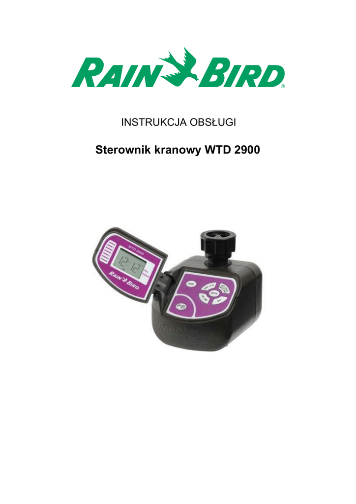 INSTRUKCJA OBSŁUGI Sterownik kranowy WTD 2900 1. WPROWADZENIE Dziękujemy za wybór firmy RAIN BIRD. Zalecamy dokładne przeczytanie niniejszej instrukcji, aby w pełni wykorzystać moŜliwości twojego nowego sterownika. Sterownik moŜe być zaprogramowany przed lub po zamontowaniu. Za pierwszym razem zalecane jest zaprogramowanie sterownika przed montaŜem, a następnie zamontowanie go zgodnie z poniŜszą instrukcją. 2. PANEL STERUJĄCY I WYŚWIETLACZ Rys. 1 Panel sterujący Rys. 2 Wyświetlacz 2 3. PROGRAMOWANIE 3.1 INSTALACJA BATERII Wyjmij pojemnik na baterie (F) i włóŜ 2 baterie alkaliczne 1,5 V typu AA LR6 (nie załączone w opakowaniu). WłóŜ pojemnik z bateriami do sterownika i upewnij się, Ŝe jest prawidłowo zamknięty. Teraz moŜna programować automatyczne nawadnianie. WaŜne: - Stosować baterie alkaliczne 1,5 V typu AA LR6. - Nie uŜywać akumulatorów. - Upewnić się, Ŝe baterie i pojemnik na baterie są czyste i suche. - Upewnić się, Ŝe baterie są podłączone do zacisków „+/-„ zgodnie z opisem na białej naklejce. - Jeśli baterie zostaną wyjęte zegar wewnętrzny straci ustawiony czas. - W przypadku dłuŜszego nieskorzystania ze sterownika naleŜy wyjąć baterie ze sterownika w celu ochrony przed korozją. - Po wyjęciu baterii na czas dłuŜszy niŜ 1 minuta zegar i wprowadzone programy ulegną zresetowaniu. 3.2 USTAWIANIE ZEGARA - Otwórz pokrywę. Uwaga: • Test stanu baterii uruchamiany jest automatycznie. • LO oznacza niski poziom naładowania baterii. • Gdy miga symbol dnia SU (SUNDAY – niedziela) baterie są w dobrym stanie. • Zacznij programowanie. • Zamknij pokrywę po zakończeniu programowania. W celu ustawienia programu automatycznego nawadniania naleŜy zdefiniować: - Czas pierwszego startu nawadniania - Czas trwania nawadniania - Częstotliwość nawadniania Wyświetlacz pokazuje godzinę 12:00 AM i dzień tygodnia SU (SUNDAY – niedziela) migający u góry. - Naciskaj przycisk MODE, aby pojawił się symbol zegara. Przyciski naciskaj zdecydowanie. - Naciskaj przycisk DAY/CYC, aby wyświetlić aktualny dzień tygodnia. - Naciśnij przycisk ENTER. Dzień tygodnia przestał migać, a zaczęła migać godzina. - Naciskaj przycisk HR/MIN, aby ustawić aktualną godzinę. - Zegar pracuje w trybie 12-godzinnym. Indeks AM/PM pokazany jest w prawym górnym rogu. - Naciśnij przycisk ENTER. - Naciskaj przycisk HR/MIN, aby ustawić aktualną minutę. - Naciśnij przycisk ENTER. Jeśli czas został ustawiony na wyświetlaczu miga aktualny dzień tygodnia. 3.3 PROGRAMOWANIE NAWADNIANIA AUTOMATYCZNEGO Tabela 1 (poniŜej) opisuje opcje harmonogramu nawadniania. 3 W danej chwili moŜe być uruchomiony tylko jeden cykl. - Wybierz jeden z 8 zaprogramowanych cykli nawadniania (Tabela 1). - Określ dni tygodnia do nawadniania w cyklu < --- > lub wybierz nawadnianie cykliczne, co określoną liczbę dni. - Określ do 6 czasów startu i końca nawadniania dla aktywnego cyklu. Tabela 1 Cykl --1 2 3 4 5 6 7 Harmonogram Wybrane dni tygodnia Codziennie Co drugi dzień Co trzeci dzień Co czwarty dzień Co piąty dzień Co szósty dzień Jeden dzień w tygodniu Dni aktywne Wybrane dni - powtarzane co tydzień SU, TU, TH, SA SU, WE, SA, TU SU, TH, MO, FR SU, FR, WE, MO SU, SA, FR,TH Wybrany dzień – powtarzany co tydzień SU (SUNDAY) - niedziela MO (MONDAY) - poniedziałek TU (TUESDAY) - wtorek WE (WEDNESDAY) - środa TH (THURSDAY) - czwartek FR (FRIDAY) - piątek SA (SATURDAY) - sobota Przykład: Aby nawadniać nowy trawnik codziennie małymi dawkami naleŜy wybrać Cykl 1 oraz przypisać mu 6 czasów startu i końca nawadniania. KROK 1: ROZPOCZĘCIE PROGRAMOWANIA - Naciskaj przycisk MODE, aby wyświetlić symbol PROG. Wyświetlacz pokaŜe symbol --:-- oznaczający pusty harmonogram. - Naciśnij przycisk DAC/CYC, aby ustawić częstotliwość nawadniania. Liczba po prawej stronie wyświetlacza obok symbolu CYC zmieni się. - Naciskaj przycisk DAC/CYC, aby wybrać Ŝądany numer cyklu. - Naciśnij przycisk ENTER, aby zapisać zawartość cyklu i potwierdzić tryb cyklu. Jeśli wybrano Cykl 1 – 7 naleŜy przejść do punktu 3.4 „Wybór czasów startu i końca nawadniania”. Jeśli wybrano Cykl < --- > naleŜy kontynuować kroki poniŜej. Symbol dnia SU (SUNDAY – niedziela) miga na wyświetlaczu. - Naciskaj przycisk DAC/CYC, aby zmienić dzień do nawadniania. - Następnie naciśnij przycisk AUTO ON-OFF, aby zatwierdzić wybór. - Symbol kranu (ON) lub przekreślonego kranu (OFF) potwierdza wybór. - Powtórz powyŜsze kroki dla kaŜdego wybranego dnia do nawadniania. - Wybrane dni będą pokazane na wyświetlaczu i nie będą migać. - Naciśnij przycisk ENTER, aby zapisać wybór. 3.4 WYBÓR CZASÓW STARTU I KOŃCA NAWADNIANIA MoŜna zaprogramować do 6 okresów nawadniania dziennie. a) Na wyświetlaczu miga numer okresu nawadniania i pokazany jest symbol kranu. - Przed włoŜeniem baterii wszystkie harmonogramy są puste. - Naciśnij przycisk SCH, aby przejść do następnego numeru. - Naciśnij przycisk ENETER, aby wprowadzić czas startu i końca nawadniania dla migającego numeru. b) Naciśnij przycisk HR/MIN, aby wybrać godzinę rozpoczęcia cyklu nawadniania. - Naciśnij przycisk ENTER, aby zapisać wybór. 4 - Naciśnij przycisk HR/MIN ponownie, aby wybrać minutę. Przykład: Aby rozpocząć nawadnianie o 6.15 AM, wybierz 6AM jako godzinę i 15 jako minutę. - Naciśnij przycisk ENTER, aby zapisać wybór. c) Naciśnij przycisk HR/MIN, aby wybrać godzinę zakończenia cyklu nawadniania. - Naciśnij przycisk ENTER, aby zapisać wybór. - Naciśnij przycisk HR/MIN ponownie, aby wybrać minutę. - Naciśnij przycisk ENTER, aby zapisać wybór. - Powtarzaj kroki a – c, aby wybrać kolejne 5 okresów nawadniania, jeśli potrzeba. - Po zakończeniu wyboru naciśnij przycisk MODE, aby wyświetlić tryb AUTO. Sterownik jest zaprogramowany do pracy automatycznej. MoŜna go teraz zamontować na kranie. 3.5 MODYFIKACJA PROGGRAMU - W ce