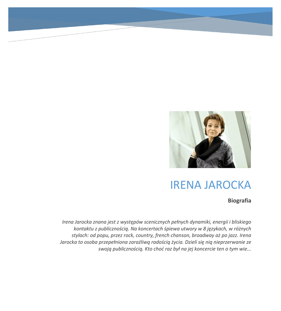 IRENA JAROCKA Biografia Irena Jarocka znana jest z występów scenicznych pełnych dynamiki, energii i bliskiego kontaktu z publicznością. Na koncertach śpiewa utwory w 8 językach, w różnych stylach: od popu, przez rock, country, french chanson, broadway aż po jazz. Irena Jarocka to osoba przepełniona zaraźliwą radością życia. Dzieli się nią nieprzerwanie ze swoją publicznością. Kto choć raz był na jej koncercie ten o tym wie... Praca Konkursowa Uczniów Gimnazjum nr 128 w Warszawie (Zespół POWĄZKI) – Konkurs LILO im Tadeusza Kościuszki 2013/2014 Dla wielu właśnie ona jest ikoną polskiej piosenki. Charyzmatyczna, wrażliwa, przebojowa. Obdarzona głosem o unikalnej, ciepłej barwie, bezbłędnie trafiającym do serc słuchaczy. Wiele płyt wydanych w Polsce i za granicą, dziesiątki przebojów. Ich tytuły każdy wymieni jednym tchem. Kto nie zna „Wymyśliłam Cię”, „Motylem jestem” „Gondolierów znad Wisły”, „Kocha się raz”, „Nie wrócą te lata”, „Odpływają kawiarenki” czy wielu, wielu innych Jej piosenek? Zagraniczne sukcesy fonograficzne to płyty wydawane w USA, we Francji w dawnym RFN, ZSRR i w Czechosłowacji. Irena Jarocka debiutowała w 1968 roku na festiwalu w Sopocie piosenką „Gondolierzy znad Wisły”. Zdobywczyni wielu prestiżowych nagród na światowych festiwalach piosenki, laureatka wielu plebiscytów prasowych i radiowych na najpopularniejszą piosenkarkę roku. Śpiewała u boku takich gwiazd jak Mireille Mathieu, Charles Aznavour, Michael Legrand czy zespół ABBA. Nagrywała płyty dla największych wytwórni na świecie takich jak Phillips, Supraphon, Warner Brothers, Cristal- EMI , Melodia i rodzimych Polskich Nagrań. Irena Jarocka próbowała także swoich sił jako aktorka. U boku serialowego Stefana Karwowskiego zagrała piękną kusicielkę i piosenkarkę u szczytu kariery, Irenę Orską, w kinowym hicie „Motylem jestem czyli romans czterdziestolatka”. Była ucieleśnieniem wszystkich cech postaci stworzonej przez reżysera Jerzego Gruzę. Po latach artystka potwierdziła swe aktorskie umiejętności w Teatrze Polskim w Waszyngtonie, grając z powodzeniem w sztuce Mrożka „Piękny widok”. W 2007 roku ukazała się na rynku, pisana w formie wywiadu-rzeki przeprowadzonego przez Magdalenę Walusiak, autobiografia Ireny Jarockiej pt. „Motylem jestem, czyli piosenka o mnie samej”. Wydana przez wydawnictwo Prószyński i Spółka książka, zawiera moc wzruszeń, wspomnień, nieznanych dotąd faktów z życia gwiazdy i mnóstwo pięknych zdjęć. W kolejnych latach u Ireny Jarockiej dzieje się bardzo dużo. Pod szyldem Universal Music Polska ukazuje się nowa płyta pt. „Małe rzeczy". Zawiera ona zarówno nastrojowe ballady jak i przebojowe, łatwe wpadające w ucho piosenki z rewelacyjnymi tekstami. Wszystkie utwory w świetnych, nowatorskich aranżacjach twórców najmłodszego pokolenia. Irena Jarocka zdobywa także „Laur elegancji” przyznawany najelegantszej Polce przez włoskiego projektanta mody Vinicio Pajaro. W Stanach natomiast Business Media Agency wydawca 2Tygodnika Polonijnego przyznaje Jej tytuł „Człowieka Roku 2008” za promowanie kultury polskiej w USA i rozsławianie Polski w świecie. Ponadto w plebiscycie Polskiego Radia w Muzycznej Jedynce radiosłuchacze wybierają Ją Muzykomaniakiem roku 2008, a czytelnicy magazynu „PANI” przyznają Irenie Jarockiej i Jej mężowi Michałowi Sobolewskiemu „Srebrne Jabłko” dla pary roku. Rok 2010 okazał się dla Ireny Jarockiej bardzo owocnym rokiem pod względem muzycznym i wydawniczym. Na rynku ukazały się dwie części kompilacji ze starszymi przebojami artyski w nowych aranżacjach. Wielkim sukcesem była również płyta świąteczna pt. „Ponieważ znów są Święta. Jednak najbardziej spektakularnym wydarzeniem 2010 roku było nagranie przez Irenę Jarocką duetu z jednym z najbardziej znanych i lubianych piosenkarzy amerykańskich-Michaelem Boltonem!