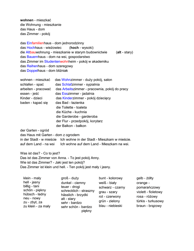 wohnen - mieszkać die Wohnung - mieszkanie das Haus - dom das Zimmer - pokój das Einfamilienhaus - dom jednorodzinny das Hochhaus - wieżowiec (hoch - wysoki) die Altbauwohnung - mieszkanie w starym budownictwie das Bauernhaus - dom na wsi, gospodarstwo das Zimmer im Studentenwohnheim - pokój w akademiku das Reihenhaus - dom szeregowy das Doppelhaus - dom bliźniak wohnen - mieszkać schlafen - spać arbeiten - pracować essen - jeść Kinder - dzieci baden - kąpać się (alt - stary) das Wohnzimmer - duży pokój, salon das Schlafzimmer - sypialnia das Arbeitszimmer - pracownia, pokój do pracy das Esszimmer - jadalnia das Kinderzimmer - pokój dziecięcy das Bad - łazienka die Toilette - toaleta die Küche - kuchnia die Garderobe - garderoba der Flur - przedpokój, korytarz der Balkon - balkon der Garten - ogród das Haus mit Garten - dom z ogrodem in der Stadt - w mieście Ich wohne in der Stadt - Mieszkam w mieście. auf dem Land - na wsi Ich wohne auf dem Land - Mieszkam na wsi. Was ist das? - Co to jest? Das ist das Zimmer von Anna. - To jest pokój Anny. Wie ist das Zimmer? - Jaki jest ten pokój? Das Zimmer ist klein und hell. - Ten pokój jest mały i jasny. klein - mały hell - jasny billig - tani schön - piękny hübsch - ładny neu - nowy zu - zbyt, za zu klein - za mały groß - duży dunkel - ciemny teuer - drogi schrecklich - straszny hässlich - brzydki alt - stary sehr - bardzo sehr schön - bardzo piękny bunt - kolorowy weiß - biały schwarz - czarny grau - szary rot - czerwony grün - zielony blau - niebieski gelb - żółty orange pomarańczowy violett - fioletowy rosa - różowy türkis - turkusowy braun - brązowy die Möbel - meble der die das der Tisch - stół der Schreibtisch - biurko der Stuhl - krzesło der Schrank - szafa der Teppich - dywan der Sessel - fotel die Kommode - komoda die Lampe - lampa das Bett - łóżko das Regal - regał das Sofa - sofa, kanapa Zaimki dzierżawcze czyli mój, twój, jego itd..... der Tisch die Lampe das Bett ich - ja mein Tisch (mój) meine Lampe (moja) mein Bett (moje) du - ty dein Tisch (twój) deine Lampe dein Bett er - on sein Tisch (jego) seine Lampe sein Bett sie - ona ihr Tisch (jej) ihre Lampe ihr Bett wir - my unser Tisch (nasz) unsere Lampe unser Bett ihr - wy euer Tisch (wasz) eure Lampe euer Bett sie - oni ihr Tisch (ich) ihre Lampe ihr Bett Przykłady: der Sessel - Das ist mein Sessel. (To jest mój fotel) Mein Sessel ist sehr gemütlich. (Mój fotel jest bardzo miły i wygodny) die Kommode - Das ist deine Kommode. (To jest twoja komoda) Deine Kommode ist schön! (Twoja komoda jest piękna!) das Bett - Das ist sein Bett. (To jest jego łóżko) Sein Bett ist groß. (Jego łóżko jest duże)