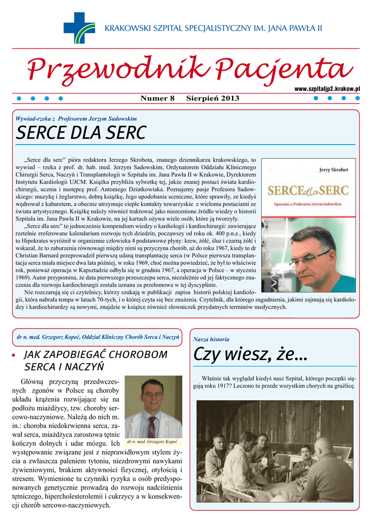 KRAKOWSKI SZPITAL SPECJALISTYCZNY IM. JANA PAWŁA II Przewodnik Pacjenta www.szpitaljp2.krakow.pl Numer 8 O, MAMMO ! SERCE DLA SERC Wywiad-rzeka z Profesorem Jerzym Sadowskim Zadbaj o zdrowie swoich piersi! Sierpień 2013 Zakład Radiologii i Diagnostyki Obrazowej Rejestracja na badania: (012) 614 3333, w godz. 7:30-18:00 Rak piersi jest obecnie najczĊĞciej wystĊpującym nowotworem u dynawskich wynika Īe badania przesiewowe piersi pozwoliáy zredu„Serce dla serc” pióra redaktora Jerzego Skrobota, znanego dziennikarza krakowskiego, to kobiet z krajów rozwiniĊtych. NaleĪy pamiĊtaü Īe nowotwory sutka kowaü umieralnoĞü z powodu raka piersi o ok. 30 proc. Zmiany w wywiad – rzeka z prof. dr. hab. med. Jerzym Sadowskim, Ordynatorem Oddziału Klinicznego mogą wystĊpowaü równieĪ u mĊĪczyzn, są jednak bardzo rzadkie. piersi czĊsto wykrywane są przez same kobiety – jest to jednak na Chirurgii Serca, Naczyńzmian i Transplantologii w Szpitalu im. JanaodpoPawła II w Krakowie, Dyrektorem Wczesne wykrycie nowotworowych i podjĊcie ogóá juĪ zmiana zaawansowana Instytutu Kardiologii UJCM.szanse Książka przybliża raka sylwetkę tej, jakże znanejPierwsza postaci świata kardio-a w Īyciu kobiety powinna byü wykonywiedniego leczenia zwiĊksza wyleczenia piersi! mammogra chirurgii, ucznia i następcę prof. Antoniego Dziatkowiaka. Poznajemy pasje Profesora SadowW diagnostyce schorzeĔ piersi wykorzystuje siĊ róĪne techniki wana w 40-tym roku Īycia, bez wzglĊdu na wielkoĞü i typ utkania skiego: muzykę i żeglarstwo, dobrą książkę, Jego upodobania sceniczne, które sprawiły, ze kiedyś obrazowania: piersi. wędrował z kabaretem,aa-obecnie utrzymuje kontakty towarzyskie zSzpital wieloma ze II w Krakowie bierze udziaá w licznych 1/ Sonomammogra czyli USG piersi –ciepłe badanie z uĪyciem ulim.postaciami Jana Pawáa świata artystycznego. Książkę należy również traktować jako nieocenione źródło wiedzy o historii dedykowanych dla kobiet mieszkanek tradĨwiĊków. programach prolaktycznych Szpitala im.toJana Pawławykonywaü II w Krakowie, jej kartach ożywa które ją tworzyły. Badanie powinna kaĪdanakobieta najlepiej w wiele odstĊ-osób, województwa maáopolskiego nansowanych przez róĪne podmioty, serc” to to jednocześnie kompendium wiedzy o kardiologii i kardiochirurgii: zawierające pach „Serce 1 roku.dlaBadanie jest caákowicie niebolesne i nieszkodliwe, umoĪliwiając wykonanie bezpáatnych badan piersi, bez wymaganego rzetelnie zreferowane kalendarium rozwoju tych dziedzin, począwszy roku ok. 400Stale p.n.e., dedykowane róĪnicowaniu zmian guzkowych, niewydolne w wykry- odskierowania. od kiedy kilku realizowany jest program NFZ - screening to Hipokrates wyróżnił organizmie człowieka 4 podstawowe płyny: krew, żółć, śluzczny i czarną i dla kobiet w wieku 50-69. waniu wczesnych postaciwraka. mammogra rakażółć piersi 2/ Badanie czne - badanie z uĪyciem wskazał, że tomammogra zaburzenia równowagi między nimi sąpromieniowania przyczyna chorób, aż do roku 1967,wykonywane kiedy to dr są równieĪ bezpáatnie badania prolakDodatkowo rentgenowskiego. moĪe byü wykonywane jako badanie przesiepaĔ z transplaninnych grup wiekowych od 40-tego roku Īycia. O Christian BarnardNie przeprowadził pierwszą udaną transplantację serca (wtyczne Polsce dla pierwsza wowe u máodych kobiet. dostĊpnoĞü programów naleĪy pytaü w rejestracji Zakáadu Radiolotacja serca miała miejsce dwa lata później, w roku 1969, choć można powiedzieć, że był to właściwie W badaniu pierĞ Ğciska siĊ miĊdzy dwoma páytkami. StopieĔ odgii i Diagnostyki Obrazowej rok, ponieważ operacja w Kapsztadzie odbyła się w grudniu 1967, a operacja w Polsce – w styczniu w budynku diagnostyki. MoĪna równieĪ czuwania ucisku zaleĪny jest od pierwszego indywidualnej wraĪliwoĞci piersi. skorzystaü z badaĔ samo 1969). Autor przypomina, że data przeszczepu serca, niezależnie od jej faktycznego zna-nansowanych przez pacjentki. Badanie trwa bardzo krótko. Szpital im. Jana Pawáa II pacjentki dysponuje nowoczesnym cyczenia dla rozwoju kardiochirurgii została uznana za przełomowa w tej dyscyplinie. 3/Nie Badanie piersi metoda rezonansu magnetycznego badaniem frowym aparatem mammogra cznym. rozczarują się ci czytelnicy, którzy szukają w publikacji zapisu historii polskiej kardioloz gii, uĪyciem pola elekromagnetycznego i gadolinowego Ğrodka kontraTechnika cyfrowa gwarantuje: która nabrała tempa w latach 70-tych, i o której czyta się bez znużenia. Czytelnik, dla którego zagadnienia, jakimi zajmują się kardiolostowego. Badanie najbardziej czuáeznajdzie i swoiste, jednak ze wzglĊdu na - wysoką rozdzielczoĞü obrazu dzy i kardiochirurdzy są nowymi, w książce również słowniczek przydatnych terminów medycznych. wysoki koszt badania i maáą dostĊpnoĞü (w dyspozycji wyspecjali- bardzo dobry kontrast zowanych poradni chorób sutka) zarezerwowane dla wybranej grupy - moĪliwoĞü powiĊkszenia zdjĊcia na ekranie monitora, co znaczpacjentek. nie uáatwia lekarzowi postawienie diagnozy Mammograa i usg to dwa róĪne, uzupeániające siĊ badania, - duĪo niĪszą niĪ w aparatach analogowych dawkĊ promieniodrnaleĪy n. med.wiĊc Grzegorz Kopeć, Oddział Kliniczny Chorób Serca i Naczyń Nasza historia nie zastanawiaü siĊ, które jest „lepsze”. KaĪde z nich wania ma swoje zalety i wady – na przykáad ultrasonograa nie wykry- moĪliwoĞü rejestrowania badania na noĞniku elektronicznym wa mikrozwapnieĔ, które mogą byü objawem wczesnej postaci - archiwizacjĊ wykonanych badaĔ w bazie danych raka. Badania mammograczne to wciąĪ najskuteczniejsza metoda Konsultacja: dr Maágorzata UrbaĔczyk-Zawadzka wczesnego diagnozowania raka piersi. Z doĞwiadczeĔ krajów skanWłaśnie tak wyglądał kiedyś nasz Szpital, którego początki sięGłówną przyczyną przedwczesgają roku 1917? Leczono tu przede wszyst