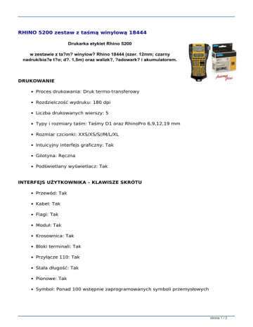 RHINO 5200 zestaw z taśmą winylową 18444 Drukarka etykiet Rhino 5200 w zestawie z ta?m? winylow? Rhino 18444 (szer. 12mm; czarny nadruk/bia?e t?o; d?. 1,5m) oraz walizk?, ?adowark? i akumulatorem. DRUKOWANIE Proces drukowania: Druk termo-transferowy Rozdzielczość wydruku: 180 dpi Liczba drukowanych wierszy: 5 Typy i rozmiary taśm: Taśmy D1 oraz RhinoPro 6,9,12,19 mm Rozmiar czcionki: XXS/XS/S//M/L/XL Intuicyjny interfejs graficzny: Tak Gilotyna: Ręczna Podświetlany wyświetlacz: Tak INTERFEJS UŻYTKOWNIKA – KLAWISZE SKRÓTU Przewód: Tak Kabel: Tak Flagi: Tak Moduł: Tak Krosownica: Tak Bloki terminali: Tak Przyłącze 110: Tak Stała długość: Tak Pionowe: Tak Symbol: Ponad 100 wstępnie zaprogramowanych symboli przemysłowych strona 1 / 2 Kody Kreskowe: Code 39, Code 128, UPC A, UPC E, EAN 8, EAN 13 Drukowanie seryjne: Proste/Zaawansowane MOŻLIWOŚĆ PODŁĄCZENIA DO KOMPUTERA Współpraca z komputerem: Nie PAMIĘĆ Zapisz/Przywołaj: Ponad 100 etykiet WYMIARY Rozmiar (szer./dł./wys./): 127/187/134 mm Waga (bez zasilacza i rolki: 1.200 g ZASILANIE Sieciowe: Zasilacz (dołączony) Bateryjne: Akumulator Li-Ion (dołączony) Cena brutto: 848.70 zł Producent: Dymo stan na: 02-03-2017r. godz. 16:46:51 więcej informacji strona 2 / 2 Powered by TCPDF (www.tcpdf.org)