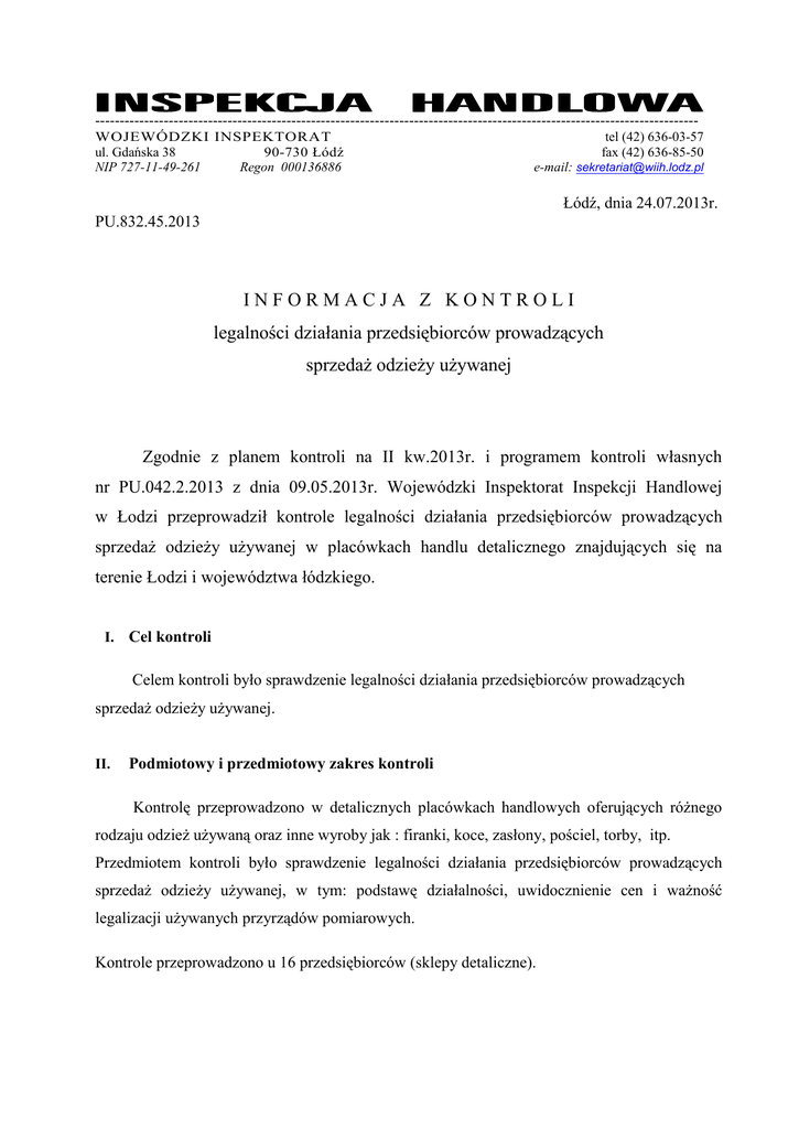 --------------------------------------------------------------------------------------------------------------------------WOJEWÓDZKI INSPEKTORAT ul. Gdańska 38 90-730 Łódź NIP 727-11-49-261 Regon 000136886 tel (42) 636-03-57 fax (42) 636-85-50 e-mail: [email protected] Łódź, dnia 24.07.2013r. PU.832.45.2013 INFORMACJA Z KONTROLI legalności działania przedsiębiorców prowadzących sprzedaż odzieży używanej Zgodnie z planem kontroli na II kw.2013r. i programem kontroli własnych nr PU.042.2.2013 z dnia 09.05.2013r. Wojewódzki Inspektorat Inspekcji Handlowej w Łodzi przeprowadził kontrole legalności działania przedsiębiorców prowadzących sprzedaż odzieży używanej w placówkach handlu detalicznego znajdujących się na terenie Łodzi i województwa łódzkiego. I. Cel kontroli Celem kontroli było sprawdzenie legalności działania przedsiębiorców prowadzących sprzedaż odzieży używanej. II. Podmiotowy i przedmiotowy zakres kontroli Kontrolę przeprowadzono w detalicznych placówkach handlowych oferujących różnego rodzaju odzież używaną oraz inne wyroby jak : firanki, koce, zasłony, pościel, torby, itp. Przedmiotem kontroli było sprawdzenie legalności działania przedsiębiorców prowadzących sprzedaż odzieży używanej, w tym: podstawę działalności, uwidocznienie cen i ważność legalizacji używanych przyrządów pomiarowych. Kontrole przeprowadzono u 16 przedsiębiorców (sklepy detaliczne). 2 1. Legalność prowadzonej działalności Sprawdzono zgodność prowadzonej działalności gospodarczej z zakresem określonym w zaświadczeniu o wpisie do centralnej ewidencji i informacji o działalności gospodarczej (CEIDG) albo wypisie z Krajowego Rejestru Sądowego. W badanym zakresie w 16 jednostkach nie stwierdzono nieprawidłowości. 2. Prawidłowość uwidaczniania cen oferowanej do sprzedaży odzieży używanej. W 14 jednostkach detalicznych (z 16 kontrolowanych) prowadzących sprzedaży odzieży używanej cena towaru określana była „za sztukę” oraz „za kilogram”, tylko 2 przedsiębiorców prowadziło sprzedaży odzieży wycenianej za sztukę. Sprawdzono, czy zgodnie z rozporządzeniem Ministra Finansów z dnia 10 czerwca 2002 r. w sprawie szczegółowych zasad uwidaczniania cen towarów i usług oraz sposobu oznaczania ceną towarów przeznaczonych do sprzedaży (Dz. U. nr 99, poz. 894 ze zm.) ceny jednostkowe zostały uwidocznione przy towarach na wywieszkach lub na wspólnej wywieszce umieszczonej na stojaku z odzieżą w miejscu dostępnym dla kupującego i dotyczyły: - ceny za 1 sztukę - dla towarów sprzedawanych na sztuki, - ceny za 1 kilogram– dla towarów przeznaczonych do sprzedaży według masy. W badanym zakresie nie stwierdzono nieprawidłowości. 3. Legalizacja przyrządu pomiarowego stosowanego do ważenia. W 14 placówkach posiadających w miejscu sprzedaży wagi sprawdzono ważność legalizacji wag i odważników zgodnie z ustawą z dnia 11 maja 2001 r. Prawo o miarach (Dz. U. z 2004 r. Nr 243, poz. 2441 ze zm.). Zgodnie z art. 8a. ust.1 w/w ustawy - przyrządy pomiarowe podlegające prawnej kontroli metrologicznej mogą być wprowadzane do obrotu i użytkowania tylko wówczas, jeżeli posiadają odpowiednio ważną decyzję zatwierdzenia typu lub ważną legalizację. W 1 placówce w Sieradzu, przy odważaniu odzieży używanej przeznaczonej do sprzedaży, posługiwano się wagą uchylną z nieaktualnym dowodem legalizacji, co było niezgodne z § 27 Rozporządzenia Ministra Gospodarki z dnia 7 stycznia 2008r. w sprawie prawnej kontroli metrologicznej przyrządów pomiarowych (Dz. U. Nr 5 poz 29 z późn. zm.). W trakcie kontroli waga została zalegalizowana. 4. Ustalenia kontroli 3 1) Na 1 przedsiębiorcę (z 16 kontrolowanych) w sklepie z odzieżą używaną w Sieradzu, nałożono mandat karny kredytowany w wysokości 150 zł za popełnienie wykroczeń z art. 26 ust.1 pkt 2 ustawy z dnia 11 maja 2001r. Prawo o miarach (Dz. U. z 2004 r. Nr 243, poz. 2441 ze zm.). 2) W związku z posługiwaniem się przyrządami pomiarowymi z nieważnymi dowodami legalizacji wydano decyzję zarządzającą niezwłoczne usunięcie stwierdzonych nieprawidłowości poprzez przekazanie przedmiotowej wagi do prawnej kontroli metrologicznej. 3) Skierowano pismo informacyjne do Obwodowego Urzędów Miar dotyczące stwierdzonej nieprawidłowości w legalizacji przyrządów pomiarowych. Wnioski Tematyka kontroli obejmowała zagadnienia związane ze sprawdzeniem legalności działania przedsiębiorców, uwidocznienie cen i ważność legalizacji używanych przyrządów pomiarowych prowadzących sprzedaż odzieży używanej. Na 16 kontrolowanych placówek nieprawidłowości stwierdzono tylko w 1 jednostce - działania podjęte przez Inspekcję Handlową spowodowały usunięcie nieprawidłowości polegającej na posługiwaniu się w kontrolowanej placówce przyrządem pomiarowym z nieważnym dowodem legalizacji. W pozostałych 15 placówkach nieprawidłowości w wyniku kontroli w tym zakresie nie stwierdzono. Zauważyć jednak należy, że kontrole były przeprowadzane po uprzedzeniu zawiadomieniem przedsiębiorców o zamiarze ich wszczęcia, co dało przedsiębiorcom czas na przygotowanie się. W kilku przypadkach przy osobistym doręczaniu zawiadomień przez inspektora zaobserwowano, iż wagi stosowane przez przedsiębiorców posiadały nieaktualne cechy legalizacji, natomiast kontrole wykazały, iż legalizacja przyrządów była aktualna, z miesiąca doręczenia zawiadomienia. Sytuacja ta dowodzi, iż przedsiębiorcy nie zawsze używają przyrządów terminowo legalizowanych, natomiast organ kontroli, z uwagi na obowiązek doręczenia zawiadomienia o zamiarze wszczęcia kontroli, nie jest w stanie tego dowieść. Sporządzili: insp. Ryszard Chmielecki,