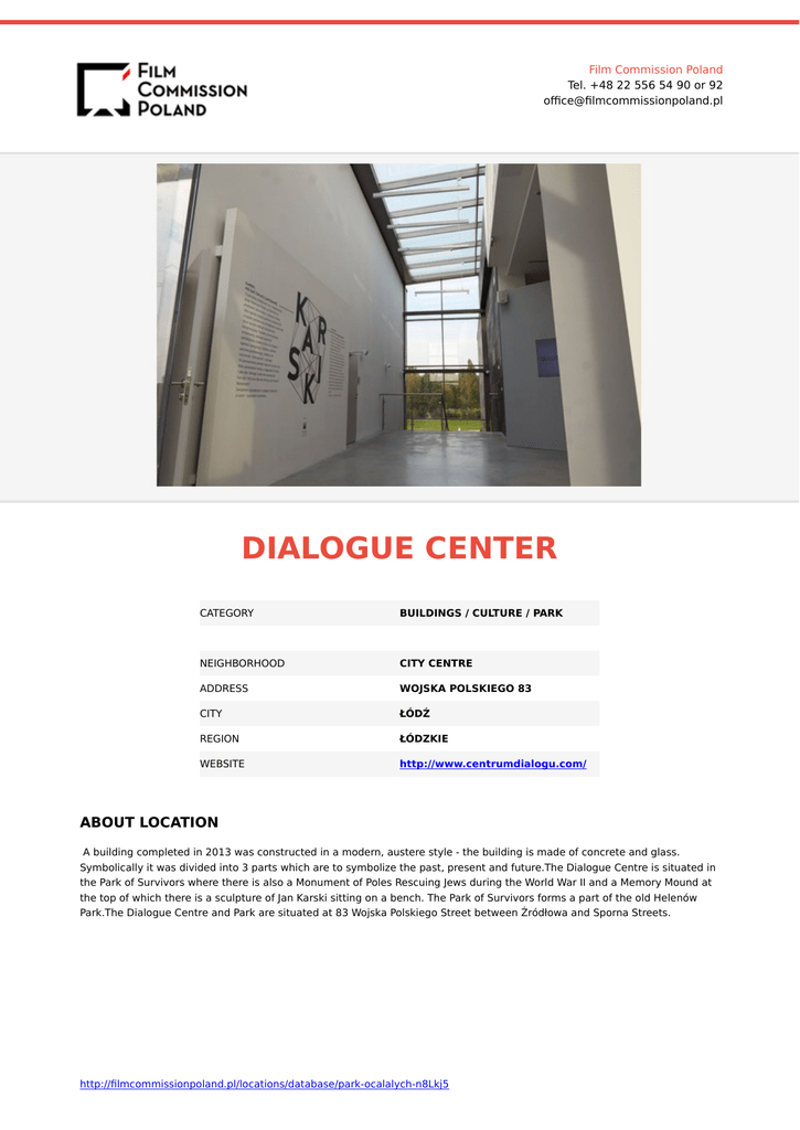 Film Commission Poland Tel. +48 22 556 54 90 or 92 office@filmcommissionpoland.pl DIALOGUE CENTER CATEGORY BUILDINGS / CULTURE / PARK NEIGHBORHOOD CITY CENTRE ADDRESS WOJSKA POLSKIEGO 83 CITY ŁÓDŹ REGION ŁÓDZKIE WEBSITE http://www.centrumdialogu.com/ ABOUT LOCATION A building completed in 2013 was constructed in a modern, austere style - the building is made of concrete and glass. Symbolically it was divided into 3 parts which are to symbolize the past, present and future.The Dialogue Centre is situated in the Park of Survivors where there is also a Monument of Poles Rescuing Jews during the World War II and a Memory Mound at the top of which there is a sculpture of Jan Karski sitting on a bench. The Park of Survivors forms a part of the old Helenów Park.The Dialogue Centre and Park are situated at 83 Wojska Polskiego Street between Źródłowa and Sporna Streets. http://filmcommissionpoland.pl/locations/database/park-ocalalych-n8Lkj5