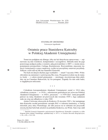 Acta Universitatis Wratislaviensis No 3270 PRAWO CCCXI Wrocław 2010 STANISŁAW GRODZISKI Uniwersytet Jagielloński Ostatnie prace Stanisława Kutrzeby w Polskiej Akademii Umiejętności Temat ten podjąłem nie dlatego, iżby nie był dotychczas opracowany — zajmowano się nim wielokroć, kompetentnie i szczegółowo. Skłoniła mnie do jego ponownego podjęcia jedna z rozmów, jaką prowadziłem w 2007 r. z moim niezapomnianym przyjacielem i kolegą, Kazimierzem. Rozważaliśmy znaczenie tradycji i kontynuacji w pracy naukowej, rychło też poczęliśmy omawiać przykłady. Jednym z nich stał się dla nas Stanisław Kutrzeba. Nie było mi danym słuchać jego wykładów — zmarł 7 stycznia 1946 r. Wsłuchiwałem się natomiast w poświęconą Mu ciszę. Przygotowywałem się do matury, kiedy — z całym niemal gimnazjum — mroźnego, styczniowego dnia udaliśmy się na Cmentarz Rakowicki, by Go pożegnać. Żegnały Go tam setki ludzi, w najgłębszym milczeniu. * * * Członkiem korespondentem Akademii Umiejętności został w 1914 roku, członkiem czynnym — w 1918 r., sekretarzem generalnym już wówczas Polskiej Akademii Umiejętności — w 1926 r., prezesem — w 1939 roku1. Jemu przypadło patrzeć na ruinę Akademii od pierwszych dni września 1939 r. Jego zadaniem stała się więc jej odbudowa w roku 1945. Armia Czerwona wkroczyła do Krakowa 18 stycznia 1945 r. Już następnego dnia Kutrzeba zwołał posiedzenie zarządu PAU w schronie kamienicy, w której mieszkał, przy ulicy Pierackiego, ale nikt jeszcze na to zebranie nie przyszedł; zresztą słychać było huk artylerii na południu Krakowa, zza Wisły. Sam więc udał 1 Spośród licznych biogramów poświęconych Stanisławowi Kutrzebie wymienię tu tylko biogram pióra Adama Vetulaniego, opublikowany w 1971 r. w Polskim Słowniku Biograficznym, t. 16, z. 69, s. 314–318. Prawo 311, 2010 © for this edition by CNS Prawo311-SH-P_Orzech.indb 73 2011-01-10 16:34:52 74 STANISŁAW GRODZISKI się do Akademii przy ulicy Sławkowskiej i stwierdził, że lokal, otwarty i z powybijanymi szybami, był całkowicie ogołocony z mebli i wyposażenia. Pierwsze więc posiedzenie zarządu odbyło się w gmachu Biblioteki Jagiellońskiej, 26 stycznia. Rozpoczęło się liczenie strat, przede wszystkim personalnych. Były one olbrzymie. Nekrologia, zamieszczona w „Roczniku PAU” za lata 1939–1945 zawierała 76 nazwisk; nadto wielu pozostałych przy życiu — łącznie z samym Kutrzebą — znajdowało się w bardzo złym stanie zdrowia na skutek przejść wojennych, inni rozproszeni byli po całym świecie. Akademia utraciła swoje majątki, lokale i pracowników; biblioteka i zbiory muzealne ocalały, ale ze znacznymi stratami na skutek rabunków. A jednak rozpoczęła działalność. Uzupełniono skład władz, rozpoczynając od wydziałów, uruchomiono biuro, zaczęto gromadzić skromne środki materialne. Ruszyła praca naukowa. We wszystkich tych zajęciach uczestniczył Stanisław Kutrzeba, poruszający się wprawdzie z wysiłkiem, ale czynny na linii pomiędzy Uniwersytetem, gdzie rozpoczął wykłady na pierwszym roku prawa, oraz Akademią. Działania zmierzające do odbudowania polskiej oświaty i nauki podejmowane były przez ocalałych i przebywających w Krakowie przedstawicieli przedwojennych władz Uniwersytetu i Akademii, bez oglądania się na władze państwowe i miejskie. Te się dopiero tworzyły. Miastem zarządzał radziecki komendant wojskowy, pułkownik Fiedosienko (rezydujący, jakżeby inaczej, w „Pałacu pod Baranami”), po nim przyszedł dr Alfred Fiderkiewicz, przedwojenny działacz KPP. Uniwersytet i Akademia nie znajdowały się w centrum zainteresowania nowej władzy; pierwszym jej śladem były napisy białą farbą, czynione przez radzieckich saperów na ścianach tych gmachów, iż „min niet”. Minister oświaty Rządu Tymczasowego Stanisław Skrzeszewski pojawił się w Krakowie 23 stycznia. Wizyta miała charakter informacyjny. Na zebraniu, zwołanym przez rektora Uniwersytetu Jagiellońskiego profesora Tadeusza Lehra-Spławińskiego, minister scharakteryzował linię polityczną rządu, starając się uspokajać nastroje zebranych2. Nie pominął też Akademii, organizując spotkanie jej prezesa Stanisława Kutrzeby z Bolesławem Bierutem3. 2 Powiedział wówczas, że Polska nie będzie „ani siedemnastą republiką sowiecką, ani komunistyczną, lecz Polską demokratyczno-burżuazyjną” [sic! — S.G.]. Stwierdził dalej, iż szkolnictwo wyższe będzie odbudowane na podstawie przedwojennej ustawy [tj. ustawy z 2 VII 1937 r., DzU RP 1937, nr 52, poz. 406 — S.G.], ale że nauka będzie bezpłatna. Prosił o jak najszybsze ogłoszenie wpisów na uczelnię w taki sposób, aby szeroko udostępnić wyższe studia młodzieży robotniczo-chłopskiej (Archiwum UJ, sygn. S. III-11, protokoły posiedzeń Senatu UJ, 1944/1945–1946/1947). Bliżej na ten temat: S. Grodziski, Nauka i nauczanie prawa prywatnego w Uniwersytecie Jagiellońskim w 1945 roku, [w:] Rozprawy z polskiego i europejskiego prawa prywatnego, Kraków 1994, s. 73–84. 3 P. Hübner (Siła przeciw rozumowi. Losy Polskiej Akademii Umiejętności w latach 1939– 1989, Kraków 1994, s. 13) jest zdania, iż Bieruta do spotkania i konferencji z Kutrzebą namówił Prawo 311, 2010 © for this edition by CNS Prawo311-SH-P_Orzech.indb 74 2011-01-10 16:34:53 Ostatnie prace Stanisława Kutrzeby w Polskiej Akademii Umiejętności 75 Warunki do tego rodzaju narad nie były łatwe, gdyż w gmachu Akademii nie działało centralne ogrzewanie, pomieszczenia były nieopalone, szyby w oknach zastąpione tekturą. Sekretarz generalny PAU, profesor Tadeusz Kowalski wspominał, iż pracowało się w płaszczach4. Szczególnie ciężkie było to dla Stanisława Kutrzeby, którego stan zdrowia pogarszał się z miesiąca na miesiąc. Do rozmowy Bierutem, w owym czasie przewodniczącym Krajowej Rady Narodowej, doszło 9 lutego 1945 roku, a