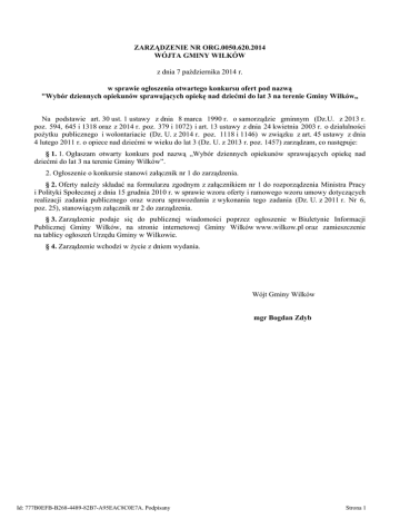 ZARZĄDZENIE NR ORG.0050.620.2014 WÓJTA GMINY WILKÓW z dnia 7 października 2014 r. w sprawie ogłoszenia otwartego konkursu ofert pod nazwą "Wybór dziennych opiekunów sprawujących opiekę nad dziećmi do lat 3 na terenie Gminy Wilków„ Na podstawie art. 30 ust. 1 ustawy z dnia 8 marca 1990 r. o samorządzie gminnym (Dz.U. z 2013 r. poz. 594, 645 i 1318 oraz z 2014 r. poz. 379 i 1072) i art. 13 ustawy z dnia 24 kwietnia 2003 r. o działalności pożytku publicznego i wolontariacie (Dz. U. z 2014 r. poz. 1118 i 1146) w związku z art. 45 ustawy z dnia 4 lutego 2011 r. o opiece nad dziećmi w wieku do lat 3 (Dz. U. z 2013 r. poz. 1457) zarządzam, co następuje: § 1. 1. Ogłaszam otwarty konkurs pod nazwą „Wybór dziennych opiekunów sprawujących opiekę nad dziećmi do lat 3 na terenie Gminy Wilków”. 2. Ogłoszenie o konkursie stanowi załącznik nr 1 do zarządzenia. § 2. Oferty należy składać na formularzu zgodnym z załącznikiem nr 1 do rozporządzenia Ministra Pracy i Polityki Społecznej z dnia 15 grudnia 2010 r. w sprawie wzoru oferty i ramowego wzoru umowy dotyczących realizacji zadania publicznego oraz wzoru sprawozdania z wykonania tego zadania (Dz. U. z 2011 r. Nr 6, poz. 25), stanowiącym załącznik nr 2 do zarządzenia. § 3. Zarządzenie podaje się do publicznej wiadomości poprzez ogłoszenie w Biuletynie Informacji Publicznej Gminy Wilków, na stronie internetowej Gminy Wilków www.wilkow.pl oraz zamieszczenie na tablicy ogłoszeń Urzędu Gminy w Wilkowie. § 4. Zarządzenie wchodzi w życie z dniem wydania. Wójt Gminy Wilków mgr Bogdan Zdyb Id: 777B0EFB-B268-4489-82B7-A95EAC8C0E7A. Podpisany Strona 1 Załącznik Nr 1 do Zarządzenia Nr ORG.0050.620.2014 Wójta Gminy Wilków z dnia 7 października 2014 r. OGŁOSZENIE O KONKURSIE Wójt Gminy Wilków ogłasza otwarty konkurs ofert, pod nazwą „Wybór dziennych opiekunów sprawujących opiekę nad dziećmi do lat 3 na terenie Gminy Wilków” I. Podstawa prawna: Konkurs ogłoszony jest na podstawie: 1) art. 13 ustawy z dnia 24 kwietnia 2003 r. (Dz.U. z 2014 r. poz. 1118 z późn.zm.); o działalności pożytku publicznego i wolontariacie 2) art. 45 ustawy z dnia 4 lutego 2011 r. o opiece nad dziećmi w wieku do lat 3 (Dz.U. z 2013 r. poz. 1457); 3) porozumienia nr 553/P/PO/2013 w sprawie współpracy przy tworzeniu instytucji Opiekuna dziennego w ramach projektu POKL.6.1.1-16-002/13 „Powrót do zatrudnienia” współfinansowanego ze środków PO KL, Priorytet VI Rynek pracy otwarty dla wszystkich, Działanie 6.1.Poprawa dostępu do zatrudnienia oraz wspieranie aktywności zawodowej w regionie, Poddziałanie 6.1.1.Wsparcie osób pozostających bez zatrudnienia na regionalnym rynku pracy zawartej pomiędzy WUP Opole a Gminą Wilków z dnia 30 września 2014 r.; II. Rodzaj zadania i wysokość środków publicznych, które Gmina Wilków ma zamiar przeznaczyć na realizację zadania. 1. Wybór dziennych opiekunów sprawujących opiekę nad dziećmi w wieku do lat 3. 2. Wysokość środków publicznych przeznaczonych na realizację zadania w 2014 roku – 4650,00 zł. III. Cel zadania. Wybór dziennych opiekunów, którzy zapewnią opiekę nad dziećmi w wieku od 20 tygodnia życia do ukończenia roku szkolnego, w którym dziecko ukończy 3 rok życia. IV. Termin realizacji zadania. Zadanie będzie realizowane przez okres średnio 12 miesięcy od daty zawarcia umowy. V. Miejsce realizacji zadania. Gmina Wilków. VI. Wymagania dotyczące kandydatów: 1. Do składania ofert zaprasza się osoby fizyczne, które: 1) posiadają tytuł prawny do lokalu, w którym będzie sprawowana opieka; 2) dają rękojmię należytego sprawowania opieki nad dziećmi; 3) nie są i nie były pozbawione im zawieszona ani ograniczona; władzy rodzicielskiej oraz władza rodzicielska nie została 4) wypełniają obowiązek alimentacyjny, w przypadku gdy taki obowiązek został nałożony na podstawie tytułu wykonawczego pochodzącego lub zatwierdzonego przez sąd; 5) nie są skazane prawomocnym wyrokiem za przestępstwo umyślne; 6) posiadają warunki lokalowe zapewniające bezpieczną opiekę nad dziećmi; 7) odbyły: Id: 777B0EFB-B268-4489-82B7-A95EAC8C0E7A. Podpisany Strona 1 a) 160-godzinne szkolenie, o którym mowa w art. 39 ust.1 pkt 6 lit. a ustawy z dnia 4 lutego 2011 r. o opiece nad dziećmi w wieku do lat 3 poparte zaświadczeniem o ukończeniu kursu opiekuna dziennego wydanym na podstawie § 18 ust.2 rozporządzenia Ministra Edukacji Narodowej z dnia 11 stycznia 2012 r. w sprawie kształcenia ustawicznego w formach pozaszkolnych (Dz.U. z 2014 r. poz. 622), albo b) 40 godzinne szkolenie uzupełniające, o którym mowa w art. 39 ust.1 pkt. 6 lit. a ustawy z dnia 4 lutego 2011 r. o opiece nad dziećmi w wieku do lat 3 w tym z zakresu udzielania dziecku pierwszej pomocy, jeżeli posiada kwalifikacje: pielęgniarki, położnej, opiekunki dziecięcej, nauczyciela wychowania przedszkolnego, nauczyciela edukacji wczesnoszkolnej lub pedagoga opiekuńczowychowawczego. Do odbycia szkolenia o którym mowa w ust. 1 pkt. 7 nie jest zobowiązana osoba, która pracowała z dziećmi do lat 3 przez okres co najmniej 12 miesięcy bezpośrednio przed podjęciem zatrudnienia jako dzienny opiekun. 2. W celu weryfikacji spełnienia warunków lokalowych u kandydata na dziennego opiekuna może być przeprowadzony wywiad środowiskowy przez Kierownika Ośrodka Pomocy Społecznej w Wilkowie. VII. Warunki realizacji zadania: 1. Do zadań dziennego opiekuna należy w szczególności: 1) zapewnienie dzieciom opieki w warunkach bytowych zbliżonych do warunków domowych; 2) zagwarantowanie dzieciom właściwej opieki pielęgnacyjnej oraz edukacyjnej z uwzględnieniem indywidualnych potrzeb dzieci; 3) prowadzenie zajęć opiekuńczo-wychowawczych i edukacyjnych, psychomotoryczny dzieci, właściwych do wieku dziecka; uwzględniających rozwój 4) zagwarantowanie dziecku w porozumieniu z rodzicami, wyżywienia na czas pobytu, zgodnie z uchwałą