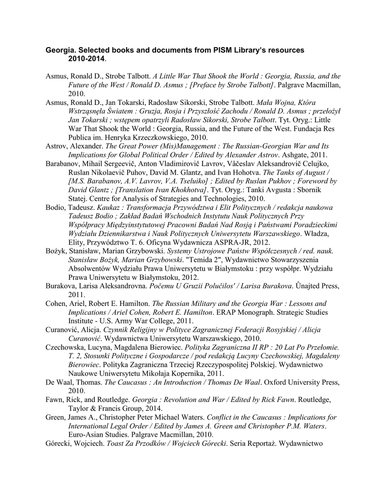 Georgia. Selected books and documents from PISM Library’s resources 2010-2014. Asmus, Ronald D., Strobe Talbott. A Little War That Shook the World : Georgia, Russia, and the Future of the West / Ronald D. Asmus ; [Preface by Strobe Talbott]. Palgrave Macmillan, 2010. Asmus, Ronald D., Jan Tokarski, Radosław Sikorski, Strobe Talbott. Mała Wojna, Która Wstrząsnęła Światem : Gruzja, Rosja i Przyszłość Zachodu / Ronald D. Asmus ; przełożył Jan Tokarski ; wstępem opatrzyli Radosław Sikorski, Strobe Talbott. Tyt. Oryg.: Little War That Shook the World : Georgia, Russia, and the Future of the West. Fundacja Res Publica im. Henryka Krzeczkowskiego, 2010. Astrov, Alexander. The Great Power (Mis)Management : The Russian-Georgian War and Its Implications for Global Political Order / Edited by Alexander Astrov. Ashgate, 2011. Barabanov, Mihail Sergeevič, Anton Vladimirovič Lavrov, Vâčeslav Aleksandrovič Celujko, Ruslan Nikolaevič Puhov, David M. Glantz, and Ivan Hohotva. The Tanks of August / [M.S. Barabanov, A.V. Lavrov, V.A. Tseluiko] ; Edited by Ruslan Pukhov ; Foreword by David Glantz ; [Translation Ivan Khokhotva]. Tyt. Oryg.: Tanki Avgusta : Sbornik Statej. Centre for Analysis of Strategies and Technologies, 2010. Bodio, Tadeusz. Kaukaz : Transformacja Przywództwa i Elit Politycznych / redakcja naukowa Tadeusz Bodio ; Zakład Badań Wschodnich Instytutu Nauk Politycznych Przy Współpracy Międzyinstytutowej Pracowni Badań Nad Rosją i Państwami Poradzieckimi Wydziału Dziennikarstwa i Nauk Politycznych Uniwersytetu Warszawskiego. Władza, Elity, Przywództwo T. 6. Oficyna Wydawnicza ASPRA-JR, 2012. Bożyk, Stanisław, Marian Grzybowski. Systemy Ustrojowe Państw Współczesnych / red. nauk. Stanisław Bożyk, Marian Grzybowski. "Temida 2", Wydawnictwo Stowarzyszenia Absolwentów Wydziału Prawa Uniwersytetu w Białymstoku : przy współpr. Wydziału Prawa Uniwersytetu w Białymstoku, 2012. Burakova, Larisa Aleksandrovna. Počemu U Gruzii Polučilos' / Larisa Burakova. Ûnajted Press, 2011. Cohen, Ariel, Robert E. Hamilton. The Russian Military and the Georgia War : Lessons and Implications / Ariel Cohen, Robert E. Hamilton. ERAP Monograph. Strategic Studies Institute - U.S. Army War College, 2011. Curanović, Alicja. Czynnik Religijny w Polityce Zagranicznej Federacji Rosyjskiej / Alicja Curanović. Wydawnictwa Uniwersytetu Warszawskiego, 2010. Czechowska, Lucyna, Magdalena Bierowiec. Polityka Zagraniczna II RP : 20 Lat Po Przełomie. T. 2, Stosunki Polityczne i Gospodarcze / pod redakcją Lucyny Czechowskiej, Magdaleny Bierowiec. Polityka Zagraniczna Trzeciej Rzeczypospolitej Polskiej. Wydawnictwo Naukowe Uniwersytetu Mikołaja Kopernika, 2011. De Waal, Thomas. The Caucasus : An Introduction / Thomas De Waal. Oxford University Press, 2010. Fawn, Rick, and Routledge. Georgia : Revolution and War / Edited by Rick Fawn. Routledge, Taylor & Francis Group, 2014. Green, James A., Christopher Peter Michael Waters. Conflict in the Caucasus : Implications for International Legal Order / Edited by James A. Green and Christopher P.M. Waters. Euro-Asian Studies. Palgrave Macmillan, 2010. Górecki, Wojciech. Toast Za Przodków / Wojciech Górecki. Seria Reportaż. Wydawnictwo Czarne, 2010. Halbach, Uwe. Ungelöste Regionalkonflikte Im Südkaukasus / Uwe Halbach ; Stiftung Wissenschaft und Politik - Deutsches Institut Für Internationale Politik und Sicherheit. SWP-Studie 1611-6372 S 8. Stiftung Wissenschaft und Politik - Deutsches Institut für Internationale Politik und Sicherheit, 2010. Janusz, Grzegorz. Ochrona Praw Mniejszości Narodowych w Europie / Grzegorz Janusz. Wydawnictwo Uniwersytetu Marii Curie-Skłodowskiej, 2011. Jones, Stephen F. War and Revolution in the Caucasus : Georgia Ablaze / edited by Stephen F. Jones. Thirdworlds. Routledge, 2010. Kałan, Dariusz, Konrad Olgierd Zasztowt. Biznes i Demokracja [Dokument Elektroniczny] : Polityka V4 Wobec Kaukazu Południowego / Dariusz Kałan, Konrad Zasztowt ; Polski Instytut Spraw Międzynarodowych. Biuletyn / Polski Instytut Spraw Międzynarodowych Nr 132 (1108). Polski Instytut Spraw Międzynarodowych, 2013. Kałan, Dariusz, Konrad Olgierd Zasztowt. Business and Democracy [Dokument Elektroniczny] : V4 Policy on South Caucasus / Dariusz Kałan, Konrad Zasztowt ; the Polish Institute of International Affairs. Bulletin / the Polish Institute of International Affairs Nr 136 (589). Polish Institute of International Affairs, 2013. Kościński, Piotr, Jewgen Worobiow. Paving a Rough Road to Vilnius [Dokument Elektroniczny] : Russia's Preventive Punishment of Its "Near Abroad" / Piotr Kościński, Jewgen Worobiow ; the Polish Institute of International Affairs. Bulletin / the Polish Institute of International Affairs No. 124 (577). Polish Institute of International Affairs, 2013. . Kościński, Piotr, Jewgen Worobiow Strategia Rosji Przed Szczytem Partnerstwa Wschodniego [Dokument Elektroniczny] : Groźby I Zachęty / Piotr Kościński, Jewgen Worobiow ; Polski Instytut Spraw Międzynarodowych. Biuletyn / Polski Instytut Spraw Międzynarodowych Nr 120 (1096). Polski Instytut Spraw Międzynarodowych, 2013. Kuca, Grzegorz. Parlament Gruzji / Grzegorz Kuca. Parlamenty. Wydawnictwo Sejmowe, 2010. Lewicki, Zbigniew. Konflikt Gruzińsko-Abchaski w Świetle Działań Pokojowych ONZ (1992-2009) / Zbigniew Lewicki. Akademia Obrony Narodowej, 2012. Longhurst, Kerry Anne, Beata Wojna, Łukasz Adamski. Asserting the EU's Mission in the Neighbourhood : Ten Recommendations for an Effective Eastern Partnership / Kerry Longhurst and Beata Wojna ; Contributors Łukasz Adamski [Et Al.] ; the Polish Institute of International Affairs. Asserting the European Union's Mission in the Neighbourhood : Ten Recommendations for an Effective Eastern Partnership. Polish Institute of International Affairs, 2011. Marat, Erica. Reforming the Police in Post-Soviet States : Georgia and Kyrgyzstan / Erica Marat. The Letort Papers / U.S. Army War College. Strateg