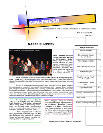 S S E R P M I G NIEREGULARNIK PUBLICZNEGO GIMNAZJUM W TRZYDNIKU DUŻYM Rok 7, numer 2 (29) Maj 2015 NASZE SUKCESY W tym numerze: Fot. z archiwum Gminnego Ośrodka Kultury Jakub Tarkowski z klasy IIB został stypendystą Marszałka Województwa Lubelskiego. Jego nazwisko znalazło się na liście 141 uzdolnionych artystycznie osób, ogłoszonej przez zarząd województwa. Uroczyste wręczenie stypendiów odbyło się 23 marca w Teatrze im. J. Osterwy w Lublinie. Jakub Tarkowski został również laureatem VI Konkursu Matematycznego Origami "Żuraw 2015" organizowanego przez Instytut Matematyczny Uniwersytetu Wrocławskiego i Fundację Matematyków Wrocławskich i w swojej kategorii wiekowej zajął pierwsze miejsce. "Żuraw" to pierwszy konkurs matematycznego origami w Polsce, a jego uczestnikami są uczniowie wszystkich typów szkół, studenci, nauczyciele i rodzice. Celem konkursu jest rozwijanie wyobraźni geometrycznej i wiedzy z geometrii przestrzennej, sprawności manualnej i koncentracji oraz kształtowanie zamiłowania do sztuki origami, jako atrakcyjnej formy spędzania wolnego czasu. Wszystkie prace, które biorą udział w konkursie, są wystawiane na aukcji podczas Dolnośląskiego Festiwalu Nauki oraz prezentowane na stronie konkursu i na łamach Wrocławskiego Portalu Matematycznego. 27 marca 2015 r. r., w Zespole Szkół nr 1 w Kraśniku odbył się uroczysty finał Konkursu Twórczości Literackiej „Pisać każdy może…”. Konkurs był skierowany do uczniów szkół gimnazjalnych z terenu powiatu, a jego organizatorami byli: Starostwo Powiatowe i kraśnicka „Górka”. Wśród nagrodzonych w kategorii proza znalazła się uczennica klasy IIIB, Alicja Stefaniak, która uzyskała III miejsce. Uwagę jury zwróciła ciekawa narracja, błyskotliwy styl oraz oryginalna puenta. Oliwia Nagajek z klasy IIC została laureatką czwartego Ogólnopolskiego Konkursu "Fryderyk Chopin - człowiek XXI wieku", zorganizowanego przez Gimnazjum nr 16 w Lublinie. Oliwia zdobyła pierwszą nagrodę za pracę plastyczną pod hasłem "Świat w ruchu - muzyczne obrazy Chopina". Nasze sukcesy 1 Żyj smacznie, zdrowo i… sportowo 2 Rosswijające wakacje 3 Liga Ochrony Przyrody 3 Wybory Książek 4 Dyskusyjny Klub Książki 5 Przeczytałam… Polecam... 5 Kącik twórczości 6-7 Co dalej, Trzecioklasisto? 7 Uczeń potrafi... 7 Z areny sportowych zmagań 8 Gratulujemy i życzymy dalszych sukcesów! STR. 2 GIM-PRESS Żyj smacznie, zdrowo i… sportowo 30 stycznia w naszej szkole w ramach programu edukacyjnego Żyj smacznie, zdrowo i… sportowo, odbył się Dzień dla zdrowia. Na pierwszych lekcjach dziewczyny z Klubu 4H rozdały wszystkim uczniom i nauczycielom marchewki i jabłka, czyli zdrowe drugie śniadanie. Fot. z archiwum szkoły Fot. z archiwum szkoły Fot. z archiwum szkoły Następnie wszyscy udali się na halę, gdzie obejrzeli przygotowane przez panią Agnieszkę Nowosad przedstawienie profilaktyczne Sąd nad alkoholem. Po obejrzeniu pouczającego przedstawienia odbyły się zajęcia aerobiku przeprowadzone przez uczennice gimnazjum. Dla tych, którzy w zajęcia zaangażowali się najbardziej, Samorząd Uczniowski przygotował nagrody. Gdy większość uczniów udała się do domu, członkowie Samorządu Uczniowskiego, Klubu 4H oraz uczniowie przygotowujący projekty edukacyjne o tematyce zdrowotnej zostali w szkole, aby spędzić tam całą noc pod okiem opiekunów: pani Izabeli Karwat, pani Małgorzaty Nowak oraz pana Łukasza Matyzbona. Najpierw trzeba było wszystko przygotować. Jedni pomagali w gotowaniu obiadu, inni w przygotowaniu sali nr 18 do „nocowania”. O godzinie 16.00 wszyscy zebraliśmy się w stołówce, gdzie zjedliśmy pyszną i zdrową zapiekankę warzywną, którą zaserwowała nam pani pedagog. Po obiedzie obejrzeliśmy mecz półfinałowy Mistrzostw Świata w piłce ręcznej Polska-Katar. Złość po przegranym meczu rozładowaliśmy, grając w gry ruchowe na X-boxie. Wieczorem udaliśmy się na krótki spacer, a zaraz po nim rozpoczęliśmy przygotowania do kolacji. Naleśniki z dżemem, bitą śmietaną i owocami były nie tylko bardzo zdrowe, ale i bardzo smaczne. Najedzeni udaliśmy się na halę sportową, gdzie odbyły się rozgrywki w siatkówkę. Po zakończeniu gry oglądaliśmy filmy profilaktyczne m.in. Galerianki. Potem przyszła kolej na horrory. Ci, którzy nie mieli ochoty uczestniczyć w seansie filmowym, grali razem z opiekunami w gry integracyjne. Zabawa w państwamiasta (nauczyciele kontra uczniowie) nie obyła się bez kilku sprzeczek (bo w końcu Edyta Górniak jest wykonawcą na literę E czy G? ), ale i tak było bardzo sympatycznie. Po wygranej nauczycieli do późna oglądaliśmy filmy. Fot. z archiwum szkoły Rano, po śniadaniu i posprzątaniu w klasach, udaliśmy się do domu. Noc w szkole była bardzo udana i z pewnością, jeśli tylko będzie to możliwe, powtórzymy ją za rok. Kinga Szymańska ROK 7, NUMER 2 (29) STR. 3 Rosswijające wakacje Rossądnie Rosstrzepani… to 13 (żeby zaprzeczyć zabobonom) pomysłowych kobiet oraz 7 (bo to szczęśliwa cyfra) kreatywnych mężczyzn. Jesteśmy najaktywniejszymi żakami najlepszego (nic to, że jedynego) gimnazjum w 3dnickiej gminie. Znamy się nie od dziś. Łączy nas podobne poczucie humoru, szkoła, ten konkurs, niepohamowany apetyt na zwycięstwo i… niektórzy twierdzą, że nic poza tym. Ale chcemy zaprzeczyć wszystkim obiegowym opiniom, dlatego też wzięliśmy udział w konkursie ph. „Rosswijające wakacje Rossmana”. Idealna recepta na zwycięską grupę to połączenie Kingi, która ma najwyższą średnią w szkole, Marceli, która jest idealną ozdobą grupy, Emilii, która jest odważna, Magdaleny, która rządzi w szkole, Justyny, która jest dobrym sportowcem, Martyny, która wymyśliła nazwę grupy, Pawła, który jest kreatywny, Kuby, który jest mistrzem origami, Kamila, który rozkręca każdą imprezę, Wiktorii, która ma duże, śliczne oczy, Ilony,
