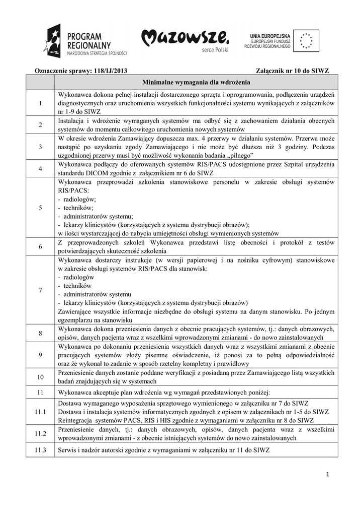 Oznaczenie sprawy: 118/IJ/2013 Załącznik nr 10 do SIWZ Minimalne wymagania dla wdrożenia 1 2 3 4 5 6 7 8 9 10 11 11.1 11.2 11.3 Wykonawca dokona pełnej instalacji dostarczonego sprzętu i oprogramowania, podłączenia urządzeń diagnostycznych oraz uruchomienia wszystkich funkcjonalności systemu wynikających z załączników nr 1-9 do SIWZ Instalacja i wdrożenie wymaganych systemów ma odbyć się z zachowaniem działania obecnych systemów do momentu całkowitego uruchomienia nowych systemów W okresie wdrożenia Zamawiający dopuszcza max. 4 przerwy w działaniu systemów. Przerwa może nastąpić po uzyskaniu zgody Zamawiającego i nie może być dłuższa niż 3 godziny. Podczas uzgodnionej przerwy musi być możliwość wykonania badania „pilnego” Wykonawca podłączy do oferowanych systemów RIS/PACS udostępnione przez Szpital urządzenia standardu DICOM zgodnie z załącznikiem nr 6 do SIWZ Wykonawca przeprowadzi szkolenia stanowiskowe personelu w zakresie obsługi systemów RIS/PACS: - radiologów; - techników; - administratorów systemu; - lekarzy klinicystów (korzystających z systemu dystrybucji obrazów); w ilości wystarczającej do nabycia umiejętności obsługi wymienionych systemów Z przeprowadzonych szkoleń Wykonawca przedstawi listę obecności i protokół z testów potwierdzających skuteczność szkolenia Wykonawca dostarczy instrukcje (w wersji papierowej i na nośniku cyfrowym) stanowiskowe w zakresie obsługi systemów RIS/PACS dla stanowisk: - radiologów - techników - administratorów systemu - lekarzy klinicystów (korzystających z systemu dystrybucji obrazów) Zawierające wszystkie informacje niezbędne do obsługi systemu na danym stanowisku. Po jednym egzemplarzu na stanowisku Wykonawca dokona przeniesienia danych z obecnie pracujących systemów, tj.: danych obrazowych, opisów, danych pacjenta wraz z wszelkimi wprowadzonymi zmianami - do nowo zainstalowanych Wykonawca po dokonaniu przeniesienia wszystkich danych wraz z wszystkimi zmianami z obecnie pracujących systemów złoży pisemne oświadczenie, iż ponosi za to pełną odpowiedzialność oraz że wykonał to zadanie w sposób rzetelny kompletny i prawidłowy Przeniesienie danych zostanie poddane weryfikacji z posiadaną przez Zamawiającego listą wszystkich badań znajdujących się w systemach Wykonawca akceptuje plan wdrożenia wg wymagań przedstawionych poniżej: Dostawa wymaganego wyposażenia sprzętowego wymienionego w załączniku nr 7 do SIWZ Dostawa i instalacja systemów informatycznych zgodnych z opisem w załącznikach nr 1-5 do SIWZ Reintegracja systemów PACS, RIS i HIS zgodnie z wymaganiami w załączniku nr 8 do SIWZ Przeniesienie danych, tj.: danych obrazowych, opisów, danych pacjenta wraz z wszelkimi wprowadzonymi zmianami - z obecnie istniejących systemów do nowo zainstalowanych Serwis i nadzór autorski zgodnie z wymaganiami w załączniku nr 11 do SIWZ 1