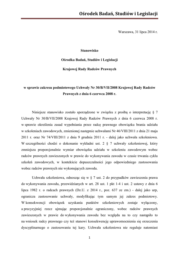 Ośrodek Badań, Studiów i Legislacji Warszawa, 31 lipca 2014 r. Stanowisko Ośrodka Badań, Studiów i Legislacji Krajowej Rady Radców Prawnych w sprawie zakresu podmiotowego Uchwały Nr 30/B/VII/2008 Krajowej Rady Radców Prawnych z dnia 6 czerwca 2008 r. Niniejsze stanowisko zostało sporządzone w związku z prośbą o interpretację § 7 Uchwały Nr 30/B/VII/2008 Krajowej Rady Radców Prawnych z dnia 6 czerwca 2008 r. w sprawie określenia zasad wypełniania przez radcę prawnego obowiązku brania udziału w szkoleniach zawodowych, zmienionej następnie uchwałami Nr 46/VIII/2011 z dnia 21 maja 2011 r. oraz Nr 74/VIII/2011 z dnia 9 grudnia 2011 r. - dalej jako uchwała szkoleniowa. W szczególności chodzi o dokonanie wykładni ust. 2 § 7 uchwały szkoleniowej, który zmniejsza proporcjonalnie wymiar obowiązku udziału w szkoleniu zawodowym wobec radców prawnych zawieszonych w prawie do wykonywania zawodu w czasie trwania cyklu szkoleń zawodowych, w kontekście dopuszczalności jego odpowiedniego zastosowania wobec radców prawnych nie wykonujących zawodu. Uchwała szkoleniowa, odnosząc się w § 7 ust. 2 do przypadków zawieszenia prawa do wykonywania zawodu, przewidzianych w art. 28 ust. 1 pkt 1-4 i ust. 2 ustawy z dnia 6 lipca 1982 r. o radcach prawnych (Dz.U. z 2014 r., poz. 637 ze zm.) - dalej jako urp, ogranicza zastosowanie uchwały, modyfikując tym samym jej zakres podmiotowy. W konsekwencji obowiązek uzyskania punktów szkoleniowych zostaje wyłączony, a precyzyjniej rzecz ujmując proporcjonalnie ograniczony, wobec radców prawnych zawieszonych w prawie do wykonywania zawodu bez względu na to czy nastąpiło to na wniosek radcy prawnego czy też stanowi konsekwencję uprawomocnienia się orzeczenia dyscyplinarnego o zastosowaniu tej kary. Uchwała szkoleniowa nie reguluje natomiast 1 Ośrodek Badań, Studiów i Legislacji sytuacji, w której radca prawny nie podjął wykonywania zawodu albo zaprzestał jego wykonywania, zawiadamiając o tym właściwą okręgową izbę radców prawnych, w trybie art. 8 ust. 3 urp, przy czym nie zachodzą wobec niego przesłanki do zawieszenia prawa do wykonywania zawodu określone w art. 28 urp. Wątpliwości budzi zatem odpowiednie zastosowanie w tej sytuacji regulacji przewidzianej w § 7 ust. 2 uchwały szkoleniowej, umożliwiającej zmniejszenie wymiaru obowiązku udziału w szkoleniu zawodowym, proporcjonalnie do okresu, w czasie którego radca prawny nie wykonywał zawodu radcy prawnego w cyklu szkoleń zawodowych. Dokonując określenia zakresu podmiotowego uchwały szkoleniowej przede wszystkim należy mieć na uwadze podstawy prawne, na mocy których została ustanowiona oraz cele, które powinna realizować i urzeczywistniać. Została ona wydana w oparciu o art. 60 pkt 7 urp oraz w celu wykonania art. 23 ust. 2 Kodeksu Etyki Radcy Prawnego - dalej KERP. Wskazane przepisy w żaden sposób nie ograniczają oraz nie różnicują kręgu podmiotów, do których odnosi się obowiązek doskonalenia zawodowego radców prawnych (art. 60 pkt 7 urp) oraz dbałości o rozwój zawodowy poprzez kształcenie ustawiczne polegające na braniu udziału w szkoleniach zawodowych (art. 23 ust. 2 KERP). Na marginesie stwierdzić należy, iż już chociażby z tych względów wprowadzony w § 7 ust. 2 uchwały szkoleniowej wyjątek od zasady, wyłączający (proporcjonalnie ograniczający) wskazane powyżej obowiązki wobec radców prawnych zawieszonych w prawie do wykonywania zawodu, należy uznać za zbyt daleko idący, a nawet pozostający w sprzeczności z regulacjami zawartymi w urp i KERP. Regulacje zawarte zarówno w urp jak i KERP nie przewidują bowiem żadnych odstępstw od obowiązku brania udziału przez radców prawnych – rozumianych jako osoby wpisane na listę radców prawnych, bez rozróżnienia czy wykonują zawód czy też nie – w szkoleniach zawodowych. Nie sposób również znaleźć racjonalnego i przekonywującego uzasadnienia dla zwolnienia z tego obowiązku radców prawnych, wobec których w każdej chwili (ust. 1 art. 28 urp) bądź po zakończeniu okresu na jaki została orzeczona kara dyscyplinarna (ust. 2 art. 28 urp) następuje przywrócenie prawa do wykonywania zawodu, co pozwala na rozpoczęcie świadczenia pomocy prawnej w pełnym zakresie. Niewątpliwie bowiem okres zawieszenia prawa do wykonywania zawodu nie powinien sprzyjać utracie czy pogorszeniu przygotowania 2 Ośrodek Badań, Studiów i Legislacji zawodowego radcy prawnego. W tym zakresie regulacja wymaga niewątpliwie interwencji uchwałodawczej. Brak uregulowania w uchwale szkoleniowej oraz wyraźnego odesłania do jej § 7 ust. 2 przypadku radców prawnych nie wykonujących zawodu, a jednocześnie nie zawieszonych w prawie do jego wykonywania (chociażby ze względu na brak wystąpienia przesłanek to umożliwiających), rodzi pytanie o dopuszczalność zastosowania w tej sytuacji powyższej regulacji chociażby poprzez wnioskowanie per analogiam. Reguła ta pozwala na zastosowanie do sytuacji nieregulowanych przez przepisy innych przepisów regulujących podobne sytuacje. W analizowanym przypadku należy mieć jednak na względzie istniejące odrębności w zakresie trybu oraz możliwości przywrócenia prawa do wykonywania zawodu w przypadku jego wcześniejszego zawieszenia a podjęciem wykonywania zawodu przez wpisanego na listę radcę prawnego. W sprawie przywrócenia (wcześniej zawieszonego) prawa do wykonywania zawodu radcy prawnego podejmowana jest uchwała przez radę okręgowej izby radców prawnych, do której podjęcia, po spełnieniu określonych warunków formalnych, w zasadzie nie ma przeszkód. Niemniej jednak rozstrzygnięcie w tym zakresie uzależnione jest od decyzji rady. Nie dotyczy to sytuacji zawieszenia prawa wskutek orzeczenia dyscyplinarnego, którego przywrócenie następuje dopiero po upływie okresu na jaki kara została orzeczona. Natomiast podjęcie wykonywania zawodu wiąże się ściśle z nabyciem prawa do j