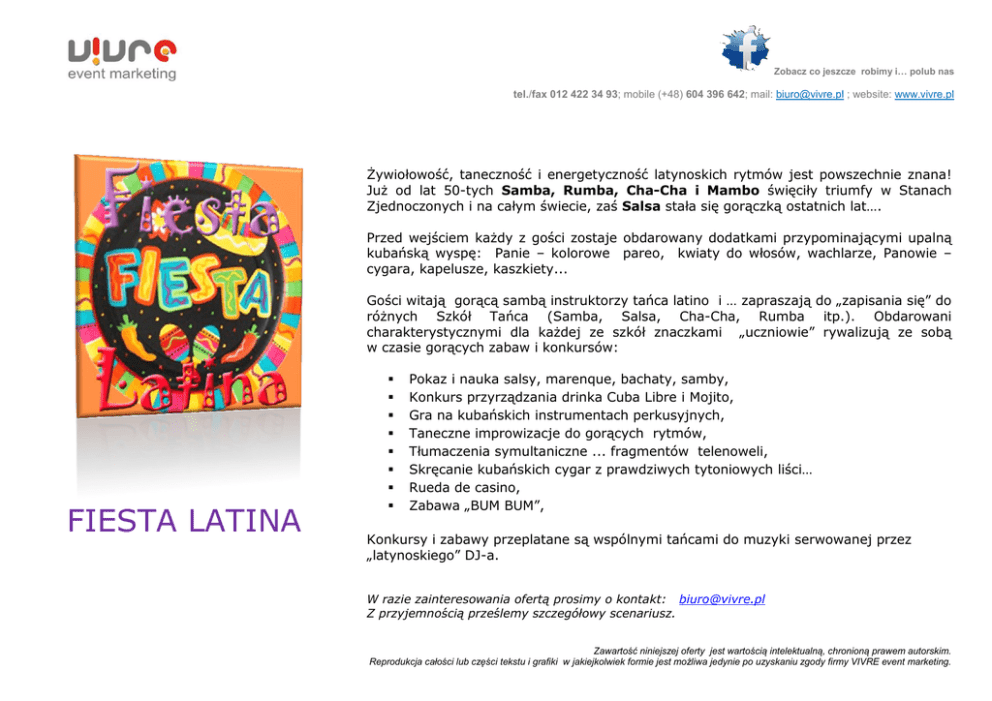 Zobacz co jeszcze robimy i… polub nas tel./fax 012 422 34 93; mobile (+48) 604 396 642; mail: [email protected] ; website: www.vivre.pl Żywiołowość, taneczność i energetyczność latynoskich rytmów jest powszechnie znana! Już od lat 50-tych Samba, Rumba, Cha-Cha i Mambo święciły triumfy w Stanach Zjednoczonych i na całym świecie, zaś Salsa stała się gorączką ostatnich lat…. Przed wejściem każdy z gości zostaje obdarowany dodatkami przypominającymi upalną kubańską wyspę: Panie – kolorowe pareo, kwiaty do włosów, wachlarze, Panowie – cygara, kapelusze, kaszkiety... Gości witają gorącą sambą instruktorzy tańca latino i … zapraszają do „zapisania się” do różnych Szkół Tańca (Samba, Salsa, Cha-Cha, Rumba itp.). Obdarowani charakterystycznymi dla każdej ze szkół znaczkami „uczniowie” rywalizują ze sobą w czasie gorących zabaw i konkursów: FIESTA LATINA Pokaz i nauka salsy, marenque, bachaty, samby, Konkurs przyrządzania drinka Cuba Libre i Mojito, Gra na kubańskich instrumentach perkusyjnych, Taneczne improwizacje do gorących rytmów, Tłumaczenia symultaniczne ... fragmentów telenoweli, Skręcanie kubańskich cygar z prawdziwych tytoniowych liści… Rueda de casino, Zabawa „BUM BUM”, Konkursy i zabawy przeplatane są wspólnymi tańcami do muzyki serwowanej przez „latynoskiego” DJ-a. W razie zainteresowania ofertą prosimy o kontakt: [email protected] Z przyjemnością prześlemy szczegółowy scenariusz. Zawartość niniejszej oferty jest wartością intelektualną, chronioną prawem autorskim. Reprodukcja całości lub części tekstu i grafiki w jakiejkolwiek formie jest możliwa jedynie po uzyskaniu zgody firmy VIVRE event marketing.