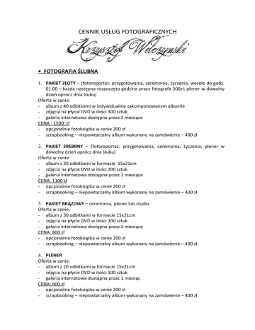 CENNIK USŁUG FOTOGRAFICZNYCH • FOTOGRAFIA ŚLUBNA 1. PAKIET ZŁOTY – (fotoreportaż: przygotowania, ceremonia, życzenia, wesele do godz. 01.00 – każda następna rozpoczęta godzina pracy fotografa 300zł; plener w dowolny dzień oprócz dnia ślubu) Oferta w cenie: - album z 40 odbitkami w indywidualnie zakomponowanym albumie - zdjęcia na płycie DVD w ilości 300 sztuk - galeria internetowa dostępna przez 2 miesiące CENA : 1500 zł - opcjonalnie fotoksiążka w cenie 200 zł - scrapbooking – niepowtarzalny album wykonany na zamówienie – 400 zł 2. PAKIET SREBRNY – (fotoreportaż: przygotowania, ceremonia, życzenia, plener w dowolny dzień oprócz dnia ślubu) Oferta w cenie: - album z 30 odbitkami w formacie 15x21cm - zdjęcia na płycie DVD w ilości 200 sztuk - galeria internetowa dostępna przez 2 miesiące CENA: 1100 zł - opcjonalnie fotoksiążka w cenie 200 zł - scrapbooking – niepowtarzalny album wykonany na zamówienie – 400 zł 3. PAKIET BRĄZOWY – ceremonia, plener lub studio Oferta w cenie: - album z 30 odbitkami w formacie 15x21cm - zdjęcia na płycie DVD w ilości 200 sztuk - galeria internetowa dostępna przez 2 miesiące CENA: 800 zł - opcjonalnie fotoksiążka w cenie 200 zł - scrapbooking – niepowtarzalny album wykonany na zamówienie – 400 zł 4. PLENER Oferta w cenie: - album z 20 odbitkami w formacie 15x21cm - zdjęcia na płycie DVD w ilości 100 sztuk - galeria internetowa dostępna przez 1 miesiąc CENA: 600 zł - opcjonalnie fotoksiążka w cenie 200 zł - scrapbooking – niepowtarzalny album wykonany na zamówienie – 400 zł • CHRZEST i KOMUNIA – ceremonia, sesja w studio lub plenerze Oferta w cenie: - album z 20 odbitkami w formacie 15x21cm - zdjęcia na płycie DVD w ilości 50 sztuk CENA: 600 zł - opcjonalnie fotoksiążka w cenie 200 zł - scrapbooking – niepowtarzalny album wykonany na zamówienie – 400 zł • SESJA STUDYJNA – pamiątkowe aranżowane zdjęcia rodzinne, Oferta w cenie: - 20 odbitek w formacie 15x21cm - zdjęcia na płycie DVD w ilości 40 sztuk CENA: 500 zł - opcjonalnie fotoksiążka w cenie 200 zł - scrapbooking – niepowtarzalny album wykonany na zamówienie – 400 zł • SESJA MODELINGOWA – aranżowane zdjęcia do portfolio (plener lub studio) Oferta w cenie: - 20 odbitek w formacie 15x21cm - zdjęcia na płycie DVD w ilości 40 sztuk CENA: 500 zł • ZDJĘCIA REKLAMOWE : - packshot – od 15zł aranżacje – od 100 zł • EVENTY – spotkania firmowe, wydarzenia kulturalne, koncerty – do uzgodnienia