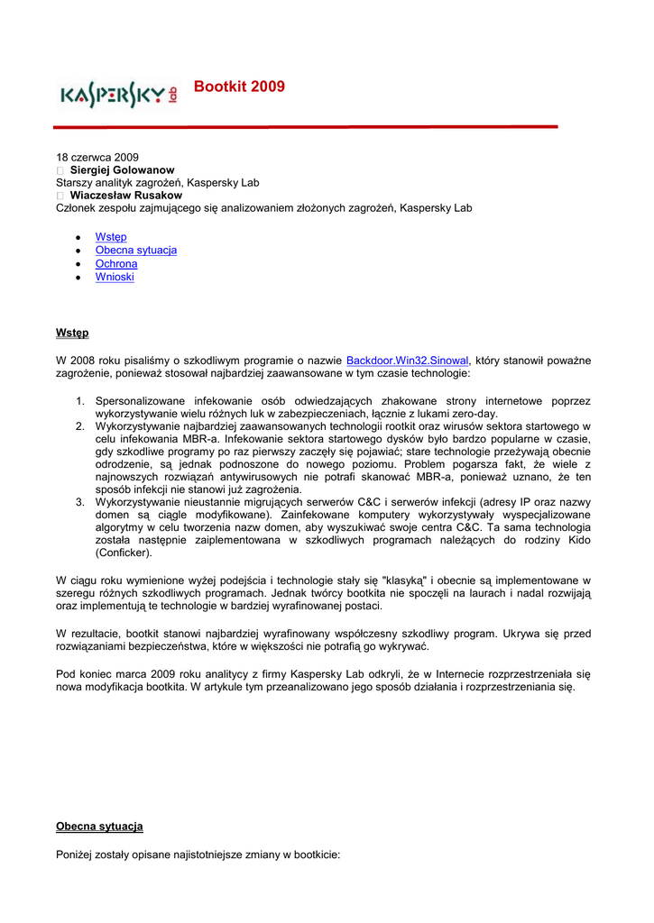Bootkit 2009 18 czerwca 2009 Siergiej Golowanow Starszy analityk zagrożeń, Kaspersky Lab Wiaczesław Rusakow Członek zespołu zajmującego się analizowaniem złożonych zagrożeń, Kaspersky Lab Wstęp Obecna sytuacja Ochrona Wnioski Wstęp W 2008 roku pisaliśmy o szkodliwym programie o nazwie Backdoor.Win32.Sinowal, który stanowił poważne zagrożenie, ponieważ stosował najbardziej zaawansowane w tym czasie technologie: 1. Spersonalizowane infekowanie osób odwiedzających zhakowane strony internetowe poprzez wykorzystywanie wielu różnych luk w zabezpieczeniach, łącznie z lukami zero-day. 2. Wykorzystywanie najbardziej zaawansowanych technologii rootkit oraz wirusów sektora startowego w celu infekowania MBR-a. Infekowanie sektora startowego dysków było bardzo popularne w czasie, gdy szkodliwe programy po raz pierwszy zaczęły się pojawiać; stare technologie przeżywają obecnie odrodzenie, są jednak podnoszone do nowego poziomu. Problem pogarsza fakt, że wiele z najnowszych rozwiązań antywirusowych nie potrafi skanować MBR-a, ponieważ uznano, że ten sposób infekcji nie stanowi już zagrożenia. 3. Wykorzystywanie nieustannie migrujących serwerów C&C i serwerów infekcji (adresy IP oraz nazwy domen są ciągle modyfikowane). Zainfekowane komputery wykorzystywały wyspecjalizowane algorytmy w celu tworzenia nazw domen, aby wyszukiwać swoje centra C&C. Ta sama technologia została następnie zaiplementowana w szkodliwych programach należących do rodziny Kido (Conficker). W ciągu roku wymienione wyżej podejścia i technologie stały się "klasyką" i obecnie są implementowane w szeregu różnych szkodliwych programach. Jednak twórcy bootkita nie spoczęli na laurach i nadal rozwijają oraz implementują te technologie w bardziej wyrafinowanej postaci. W rezultacie, bootkit stanowi najbardziej wyrafinowany współczesny szkodliwy program. Ukrywa się przed rozwiązaniami bezpieczeństwa, które w większości nie potrafią go wykrywać. Pod koniec marca 2009 roku analitycy z firmy Kaspersky Lab odkryli, że w Internecie rozprzestrzeniała się nowa modyfikacja bootkita. W artykule tym przeanalizowano jego sposób działania i rozprzestrzeniania się. Obecna sytuacja Poniżej zostały opisane najistotniejsze zmiany w bootkicie: 1. Rozprzestrzenianie Obecnie bootkit rozprzestrzenia się za pośrednictwem zhakowanych stron internetowych, zasobów pornograficznych oraz stron z pirackim oprogramowaniem. Prawie wszystkie serwery biorące udział w procesie infekcji posiadają wyraźny rosyjski ślad: stanowią część tak zwanych programów partnerskich, w których właściciele stron internetowych współpracują z autorami szkodliwych programów. Takie "programy partnerskie" są niezwykle popularne w rosyjskich i ukraińskich światkach cyberprzestępczych. Mechanizm stosowany do tworzenia nazw domen dla strony zawierającej exploity również stanowi stosunkowo nową technologię. Gdy użytkownik odwiedzi zainfekowaną stronę internetową, na jego komputerze zacznie uruchamiać się specjalnie stworzony skrypt. Skrypt ten wykorzystuje aktualną datę na komputerze w celu wygenerowania nazwy strony, do której użytkownik zostanie przekierowany w celu pobrania stworzonego dla niej exploita. Fragment skryptu (odszyfrowany) wykorzystywanego do generowania nazwy domeny dla strony zawierającej exploity Technologia ta niemal całkowicie uniemożliwia wykorzystywanie klasycznych metod opartych na czarnych listach w celu zablokowania dostępu do stron zawierających exploity. Jednak analiza algorytmu wykorzystywanego do generowania nazw domen pozwala określić, które z nazw domen zostaną wykorzystane, a następnie zablokować je. Oprócz tworzenia nazw domen poprzez wykorzystywanie aktualnej daty umieszczony w zainfekowanych stronach internetowych skrypt tworzy ciasteczka ważne przez 7 dni. Uniemożliwia to ponowne otwarcie w przeglądarce strony z pakietem narzędzi hakerskich Neosploit w przypadku wielokrotnego odwiedzenia przez użytkownika zainfekowanej strony internetowej. Skrypt szuka ciasteczek, a gdy je znajdzie i nadal będą ważne, nie stworzy nazwy domeny i użytkownik nie zostanie przekierowywany do Neosploita. 2. Technologie rootkit Bootkit nadal stosuje metodę polegającą na infekowaniu MBR-a w celu załadowania swojego sterownika przed uruchomieniem się systemu operacyjnego. Sterownik jest wykorzystywany do uniemożliwienia wykrywania i leczenia zainfekowanego rekordu startowego. Pierwsze wersje przechwytywały procedurę IRP Driver/ Disk; jednak ze względu na ewolucję technologii zwalczania szkodliwych programów twórcy wirusów musieli znacznie zmodyfikować tę technikę. W porównaniu z poprzednimi wariantami najnowsza wersja rootkita wykorzystuje bardziej zaawansowaną technologię w celu ukrycia swojej obecności w systemie. Żaden z innych znanych obecnie rootkitów nie wykorzystuje opisanych niżej metod. Podczas startu zainfekowany sterownik sprawdza, czy istnieje aktywny debugger. Jeżeli tak, rootkit nie ukryje zainfekowanego MBR-a i nie ujawni jego obecności w systemie w żaden sposób. Aby stać się niewidocznym, rootkit zastępuje wskaźnik urządzenia jednym ze swoich własnych; w tym przypadku mamy do czynienia z określoną strukturą, w której zainfekowany sterownik zamienia wskaźnik na funkcję (ParseProcedure). Przechwytywanie funkcji w celu zastąpienia MBR-a Jeżeli dysk fizyczny jest otwarty na dostęp programu antywirusowego w trybie niskopoziomowym, przechwycona funkcja zostanie wywołana. Procedura IRP sterownika zostanie przechwycona na niższym poziomie niż \Driver\Disk oraz funkcje, które są wywoływane, gdy uprzednio otwarty dysk jest zamknięty. Jak tylko dysk zostanie zamknięty, wszystkie funkcje przechwytujące powracają do stanu pierwotnego. Sterownik ATAPI niskiego poziomu w zainfekowanym systemie Na osobną uwagę zasługuje kod sterownika, który również przeszedł znaczące modyfikacje. Wi