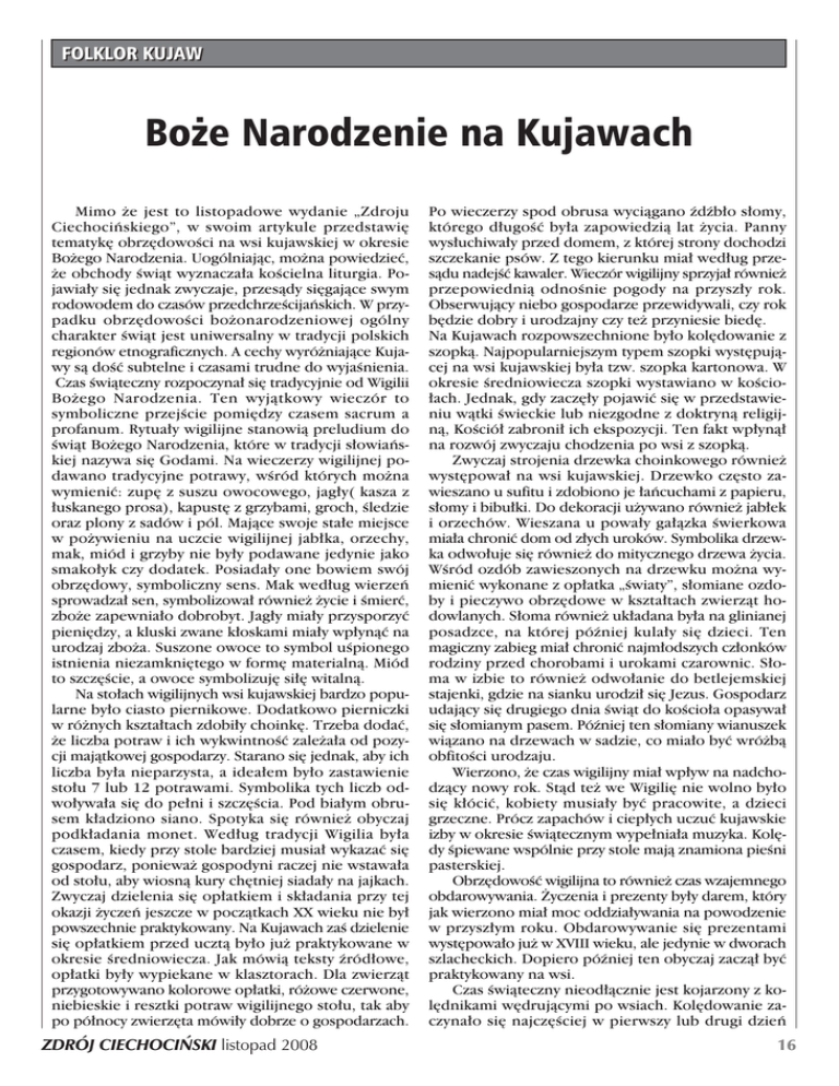 FOLKLOR KUJAW Bo˝e Narodzenie na Kujawach Mimo ˝e jest to listopadowe wydanie „Zdroju Ciechociƒskiego”, w swoim artykule przedstawi´ tematyk´ obrz´dowoÊci na wsi kujawskiej w okresie Bo˝ego Narodzenia. Uogólniajàc, mo˝na powiedzieç, ˝e obchody Êwiàt wyznacza∏a koÊcielna liturgia. Pojawia∏y si´ jednak zwyczaje, przesàdy si´gajàce swym rodowodem do czasów przedchrzeÊcijaƒskich. W przypadku obrz´dowoÊci bo˝onarodzeniowej ogólny charakter Êwiàt jest uniwersalny w tradycji polskich regionów etnograficznych. A cechy wyró˝niajàce Kujawy sà doÊç subtelne i czasami trudne do wyjaÊnienia. Czas Êwiàteczny rozpoczyna∏ si´ tradycyjnie od Wigilii Bo˝ego Narodzenia. Ten wyjàtkowy wieczór to symboliczne przejÊcie pomi´dzy czasem sacrum a profanum. Rytua∏y wigilijne stanowià preludium do Êwiàt Bo˝ego Narodzenia, które w tradycji s∏owiaƒskiej nazywa si´ Godami. Na wieczerzy wigilijnej podawano tradycyjne potrawy, wÊród których mo˝na wymieniç: zup´ z suszu owocowego, jag∏y( kasza z ∏uskanego prosa), kapust´ z grzybami, groch, Êledzie oraz plony z sadów i pól. Majàce swoje sta∏e miejsce w po˝ywieniu na uczcie wigilijnej jab∏ka, orzechy, mak, miód i grzyby nie by∏y podawane jedynie jako smako∏yk czy dodatek. Posiada∏y one bowiem swój obrz´dowy, symboliczny sens. Mak wed∏ug wierzeƒ sprowadza∏ sen, symbolizowa∏ równie˝ ˝ycie i Êmierç, zbo˝e zapewnia∏o dobrobyt. Jag∏y mia∏y przysporzyç pieni´dzy, a kluski zwane k∏oskami mia∏y wp∏ynàç na urodzaj zbo˝a. Suszone owoce to symbol uÊpionego istnienia niezamkni´tego w form´ materialnà. Miód to szcz´Êcie, a owoce symbolizuj´ si∏´ witalnà. Na sto∏ach wigilijnych wsi kujawskiej bardzo popularne by∏o ciasto piernikowe. Dodatkowo pierniczki w ró˝nych kszta∏tach zdobi∏y choink´. Trzeba dodaç, ˝e liczba potraw i ich wykwintnoÊç zale˝a∏a od pozycji majàtkowej gospodarzy. Starano si´ jednak, aby ich liczba by∏a nieparzysta, a idea∏em by∏o zastawienie sto∏u 7 lub 12 potrawami. Symbolika tych liczb odwo∏ywa∏a si´ do pe∏ni i szcz´Êcia. Pod bia∏ym obrusem k∏adziono siano. Spotyka si´ równie˝ obyczaj podk∏adania monet. Wed∏ug tradycji Wigilia by∏a czasem, kiedy przy stole bardziej musia∏ wykazaç si´ gospodarz, poniewa˝ gospodyni raczej nie wstawa∏a od sto∏u, aby wiosnà kury ch´tniej siada∏y na jajkach. Zwyczaj dzielenia si´ op∏atkiem i sk∏adania przy tej okazji ˝yczeƒ jeszcze w poczàtkach XX wieku nie by∏ powszechnie praktykowany. Na Kujawach zaÊ dzielenie si´ op∏atkiem przed ucztà by∏o ju˝ praktykowane w okresie Êredniowiecza. Jak mówià teksty êród∏owe, op∏atki by∏y wypiekane w klasztorach. Dla zwierzàt przygotowywano kolorowe op∏atki, ró˝owe czerwone, niebieskie i resztki potraw wigilijnego sto∏u, tak aby po pó∏nocy zwierz´ta mówi∏y dobrze o gospodarzach. ZDRÓJ CIECHOCI¡SKI listopad 2008 Po wieczerzy spod obrusa wyciàgano êdêb∏o s∏omy, którego d∏ugoÊç by∏a zapowiedzià lat ˝ycia. Panny wys∏uchiwa∏y przed domem, z której strony dochodzi szczekanie psów. Z tego kierunku mia∏ wed∏ug przesàdu nadejÊç kawaler. Wieczór wigilijny sprzyja∏ równie˝ przepowiednià odnoÊnie pogody na przysz∏y rok. Obserwujàcy niebo gospodarze przewidywali, czy rok b´dzie dobry i urodzajny czy te˝ przyniesie bied´. Na Kujawach rozpowszechnione by∏o kol´dowanie z szopkà. Najpopularniejszym typem szopki wyst´pujàcej na wsi kujawskiej by∏a tzw. szopka kartonowa. W okresie Êredniowiecza szopki wystawiano w koÊcio∏ach. Jednak, gdy zacz´∏y pojawiç si´ w przedstawieniu wàtki Êwieckie lub niezgodne z doktrynà religijnà, KoÊció∏ zabroni∏ ich ekspozycji. Ten fakt wp∏ynà∏ na rozwój zwyczaju chodzenia po wsi z szopkà. Zwyczaj strojenia drzewka choinkowego równie˝ wyst´powa∏ na wsi kujawskiej. Drzewko cz´sto zawieszano u sufitu i zdobiono je ∏aƒcuchami z papieru, s∏omy i bibu∏ki. Do dekoracji u˝ywano równie˝ jab∏ek i orzechów. Wieszana u powa∏y ga∏àzka Êwierkowa mia∏a chroniç dom od z∏ych uroków. Symbolika drzewka odwo∏uje si´ równie˝ do mitycznego drzewa ˝ycia. WÊród ozdób zawieszonych na drzewku mo˝na wymieniç wykonane z op∏atka „Êwiaty”, s∏omiane ozdoby i pieczywo obrz´dowe w kszta∏tach zwierzàt hodowlanych. S∏oma równie˝ uk∏adana by∏a na glinianej posadzce, na której póêniej kula∏y si´ dzieci. Ten magiczny zabieg mia∏ chroniç najm∏odszych cz∏onków rodziny przed chorobami i urokami czarownic. S∏oma w izbie to równie˝ odwo∏anie do betlejemskiej stajenki, gdzie na sianku urodzi∏ si´ Jezus. Gospodarz udajàcy si´ drugiego dnia Êwiàt do koÊcio∏a opasywa∏ si´ s∏omianym pasem. Póêniej ten s∏omiany wianuszek wiàzano na drzewach w sadzie, co mia∏o byç wró˝bà obfitoÊci urodzaju. Wierzono, ˝e czas wigilijny mia∏ wp∏yw na nadchodzàcy nowy rok. Stàd te˝ we Wigili´ nie wolno by∏o si´ k∏óciç, kobiety musia∏y byç pracowite, a dzieci grzeczne. Prócz zapachów i ciep∏ych uczuç kujawskie izby w okresie Êwiàtecznym wype∏nia∏a muzyka. Kol´dy Êpiewane wspólnie przy stole majà znamiona pieÊni pasterskiej. Obrz´dowoÊç wigilijna to równie˝ czas wzajemnego obdarowywania. ˚yczenia i prezenty by∏y darem, który jak wierzono mia∏ moc oddzia∏ywania na powodzenie w przysz∏ym roku. Obdarowywanie si´ prezentami wyst´powa∏o ju˝ w XVIII wieku, ale jedynie w dworach szlacheckich. Dopiero póêniej ten obyczaj zaczà∏ byç praktykowany na wsi. Czas Êwiàteczny nieod∏àcznie jest kojarzony z kol´dnikami w´drujàcymi po wsiach. Kol´dowanie zaczyna∏o si´ najcz´Êciej w pierwszy lub drugi dzieƒ 16 Êwiàt Bo˝ego Narodzenia. W grupie kol´dników - przebieraƒców mo˝na wyró˝niç takie postaci jak koza, bocian, niedêwiedê, ˚yd, Cygan i grup´ muzykantów. Symbolika t