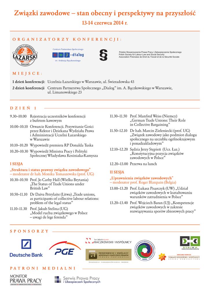Związki zawodowe – stan obecny i perspektywy na przyszłość 13-14 czerwca 2014 r. O R G A N I Z A T O R Z Y K O N F E R E N C J I : Polskie Stowarzyszenia Prawa Pracy i Zabezpieczenia Społecznego Polish Society for Labour Law and Social Security Association Polonaise de Droit du Travail et de la Sécurité Sociale Proszę wypełnić pismem drukowanym lub maszynowy DEKLARACJA WSTĄPIENIA DO STOWARZYSZENIA M I E J S C E : 1 dzień konferencji: Uczelnia Łazarskiego w Warszawie, ul. Świeradowska 43 Ja, niżej podpisany (a)..................................................................................................................... (nazwisko) 2 dzień konferencji Centrum Partnerstwa Społecznego „Dialog” im. A.(imię) Bączkowskiego w Warszawie, ul. Limanowskiego 23 Tytuł......................................................................................................... Instytucja................................................................................................................................................................................ Stanowisko............................................................................................................................................................................. D Z I E Ń 1 Adres...................................................................................................................................................................................... Kod pocztowy i miasto ........................................................................................................................................................... 11.30–11.50 Prof. Manfred Weiss (Niemcy) 9.30–10.00 Rejestracja uczestników konferencji Telefon.............................................. Fax. ...................................... „German Trade Unions: Their Role z bufetem kawowym e-mail: ....................................................................... in Collective Bargaining” 10.00–10.10 Otwarcie Konferencji. Przywitanie Gości proszę Zarząd Stowarzyszenia Polska Sekcja Międzynarodowego Stowarzyszenia Prawa Pracy i Zabezpieczen 11.50–12.10 Dr hab. Marcin Zieleniecki (prof. UG) przez Rektor i Dziekana Wydziału Prawa Społecznego o przyjęcie mnie jako członka rzeczywistego Stowarzyszenia i zobowiązuję się do przestrzegan „Związek zawodowy jako podmiot dialogu i Administracji Uczelni Łazarskiego Statutu Stowarzyszenia. społecznego na szczeblu ogólnokrajowym w Warszawie i ponadzakładowym” 10.10–10.20 Wypowiedź premiera RP Donalda Tuska ............................................................................. ............................................................ (miejscowość i data) (podpis) 12.10–12.20 Sędzia Jerzy Stępień (Ucz. Łaz.) 10.20–10.30 Wypowiedź Ministra Pracy i Polityki „Konstytucyjna pozycja związków Społecznej Władysława Kosiniaka-Kamysza zawodowych w Polsce” Członkowie wprowadzający: 12.20–13.00 Przerwa na lunch I SESJA 1).............................................................................. zawodowego” (imię i nazwisko) II SESJA „Struktura i status prawny związku – moderator dr hab. Monika Tomaszewska (prof. UG) .............................................. (podpis) „Uprawnienia związków zawodowych” 2).............................................................................. .............................................. 10.30–10.50 Prof. Jo Carby Hall (Wielka Brytania) – moderator prof. Roger Blanpain (Belgia) (imię i nazwisko) (podpis) „The Status of Trade Unions under British Law” 13.00–13.20 Prof. Łukasz Pisarczyk (UW) „Udział związków zawodowych w kształtowaniu 10.50–11.10 Dr Daiva Petrylaite (Litwa) „Trade unions, warunków zatrudnienia w Polsce” as participants of collective labour relations: problem of the legal status” 11.10–11.30 Prof. Jakub Stelina (UG) „Model ruchu związkowego w Polsce – uwagi de lege ferenda” 13.20–13.40 Prof. Wojciech Baran (UJ) „Kompetencje związków zawodowych w zakresie rozwiązywania sporów zbiorowych pracy” Adres: ul. Krakowskie Przedmieście 26/28, PL. - 00-927 Warszawa c/o Katedra Prawa Pracy, Wydział Prawa i Administracji, Uniwersytet Warszawski Konto: Polska Sekcja Międzynarodowego Stowarzyszenia Prawa Pracy i Zabezpieczenia Społecznego Bank Gospodarstwa Krajowego, I Oddział w Warszawie, Al. Jerozolimskie 7, 00-955 Warszawa, nr: 37 1130 1017 0200 0000 0005 5613 S P O N S O R Z Y PA T R O N I M E D I A L N I 13.40–14.00 Dr Artur Rycak, sędzia „Ochrona trwałości stosunku pracy działaczy związkowych w prawie procesowym” 16.30–16.50 Dr Steffen Lehndorff (Niemcy) „Living in different worlds? Trade unions and the European crisis” 14.00–14.20 Dr Monika Gładoch (UKSW)”Współpraca związków zawodowych z pracodawcami na szczeblu zakładu pracy”, doradca Prezydenta Pracodawców RP 16.50–17.10 Prof. Zbigniew Hajn (SN, UŁ) „Zakres podmiotowy prawa koalicji” 14.20–15.00 Dyskusja 15.00–15.30 Przerwa na kawę III SESJA „Przyszłość związków zawodowych” – moderator prof. Grzegorz Goździewicz (UMK) 15.30–15.50 Prof. Roger Blanpain (Belgia) „The future of trade-unions in a globalised world” 15.50–16.10 Prof. Patricia Conlan (Irlandia) „Ireland: the meaning of the right to trade union membership” 17.10–17.30 Dr Magdalena Rycak (Ucz.Łaz.) „Związki zawodowe a inne reprezentacje pracowników w polskim systemie zbiorowej reprezentacji pracowników” wnioski de lege lata i de lege ferenda 17.30–17.50 Prof. Juliusz Gardawski (SGH) „Kondycja związków zawodowych w Polsce” 17.50–18.30 Dyskusja 18.30–18.40 Podsumowanie pierwszego dnia konferencji 21.00–24.00 Bankiet* w restauracji Academia z udziałem muzyków jazzowych (m.in. sędzia Jerzy Stępień, były prezes Trybunału Konstytucyjnego) 16.10–16.30 Prof. Fiorella Lunardon (Włochy) „Italian recent deve