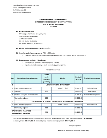 Chrześcijańska Służba Charytatywna Filia w Suchej Beskidzkiej Ul. Mickiewicza 58 34-200 Sucha Beskidzka SPRAWOZDANIE Z DZIAŁALNOŚCI CHRZEŚCIJAŃSKIEJ SŁUŻBY CHARYTATYWNEJ Filia w Suchej Beskidzkiej rok 2008 1) Nazwa i adres filii: Chrześcijańska Służba Charytatywna Filia w Suchej Beskidzkiej ul. Mickiewicza 58 34-200 Sucha Beskidzka Tel. (033) 4966021, 604210324 2) Liczba osób działających w filii: 3 osób. 3) Godziny poświęcone pracy w filii: 1.000 godz. o wartość godzin pracy nie wymagającej kwalifikacji: 1000 godz. × 6 zł = 6000,00 zł 4) Prowadzone projekty i działania: o Dystrybucja żywności przy współpracy z MOPS, o Spotkania i odwiedziny u osób potrzebujących wsparcia. Część finansowa Liczba Lp. Rodzaj udzielonej pomocy osób objętych Wartość Liczba w PLN Źródła finansowania pomocą I „DYSTRYBUCJA ŻYWNOŚCI” 1 Praca woluntarystyczna 1000 h * 6 zł 600 2 Żywność 6.000 zł Wolontariusze 20.000 zł Darczyńcy 1.200 zł Kościół Adwentystów 3 Wartość wynajmu pomieszczenia Wartość projektu II 600 27.200 zł „SPOTKANIA I POMOC OSOBOM POTRZEBUJĄCYM WSPARCIA” 1 Praca woluntarystyczna Wartość projektu CAŁKOWITA WARTOŚĆ UDZIELONEJ POMOCY 800 h x 35 zł 28.000 zł 130 28.000 zł 730 55.200 zł Wolontariusze Filia Chrześcijańskiej Służby Charytatywnej w Suchej Beskidzkiej w roku 2008 udzieliła pomocy 730 osobom na łączną kwotę 55.200,00 zł. Wartość pracy wolontariackiej wyniosła 34.000,00 zł Henryk Sapiołka Kierownik filii ChSCh w Suchej Beskidzkiej