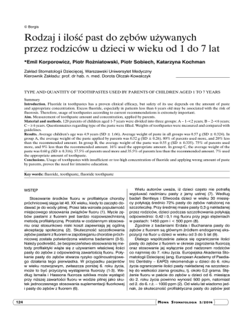 © Borgis Rodzaj i ilość past do zębów używanych przez rodziców u dzieci w wieku od 1 do 7 lat *Emil Korporowicz, Piotr Rożniatowski, Piotr Sobiech, Katarzyna Kochman Zakład Stomatologii Dziecięcej, Warszawski Uniwersytet Medyczny Kierownik Zakładu: prof. dr hab. n. med. Dorota Olczak-Kowalczyk Type and quantity of toothpastes used by parents of children aged 1 to 7 years Summary Introduction. Fluoride in toothpastes has a proven clinical efficacy, but safety of its use depends on the amount of paste and appropriate concentration. Excess fluoride, especially in patients less than 6 years old may be associated with the risk of fluorosis. Therefore, usage of toothpastes according to current recommendations is extremely important. Aim. Measurement of toothpaste amount and concentration, applied by parents. Material and methods. 120 parents of children aged 1-7 years were divided into three groups: A – 1-<2 years; B – 2-<6 years; C – ≥ 6 years. Questionnaires regarding type of the paste were filled. Weights of toothpastes were measured and compared with guidelines. Results. Average children’s age was 4.9 years (SD ± 1.66). Average weight of paste in all groups was 0.57 g (SD ± 0.324). In group A, the average weight of the paste applied by parents was 0.52 g (SD ± 0.26). 80% of parents used more, and 20% less than the recommended amount. In group B, the average weight of the paste was 0.55 g (SD ± 0.335). 75% of parents used more, and 9% less than the recommended amount. 16% used the appropriate amount. In group C, the average weight of the paste was 0.60 g (SD ± 0.316). 57.5% of parents used more and 35.5% of parents less than the recommended amount. 7% used the appropriate amount of toothpaste. Conclusions. Usage of toothpastes with insufficient or too high concentration of fluoride and applying wrong amount of paste by parents, proves the need for intensive education. Key words: fluoride, toothpaste, fluoride toothpaste Wstęp Stosowanie środków fluoru w profilaktyce choroby próchnicowej sięga lat 40. XX wieku, kiedy to zaczęto dodawać je do wody pitnej. Przez lata wzrosła popularność miejscowego stosowania związków fluoru (1). Mycie zębów pastami z fluorem jest bardzo rozpowszechnioną metodą profilaktyczną. Prostota w codziennym stosowaniu oraz stosunkowo niski koszt zapewniają jej ogólną akceptację społeczną (2). Skuteczność szczotkowania zębów pastami z fluorem w zapobieganiu chorobie próchnicowej została potwierdzona wieloma badaniami (3-5). Należy podkreślić, że bezpieczeństwo stosowania tej metody profilaktyki wiąże się z używaniem właściwej ilości pasty do zębów z odpowiednią zawartością fluoru. Połykanie pasty do zębów stwarza ryzyko ogólnoustrojowego działania tego pierwiastka. W przypadku pacjentów w wieku rozwojowym, zwłaszcza poniżej 6. roku życia, może to być przyczyną wystąpienia fluorozy (1-3). Według Ismaila i Hassona fluoroza szkliwa może wystąpić przy niższej zawartości fluoru w wodzie pitnej jako skutek jednoczesnego stosowania suplementacji fluorkowej i pasty do zębów z fluorem (6). 124 Wielu autorów uważa, iż dzieci często nie potrafią wypluwać nadmiaru pasty z jamy ustnej (7). Według badań Bentleya i Ellwooda dzieci w wieku 30 miesięcy połykają średnio 72% pasty do zębów nałożonej na szczoteczkę. Przy średniej masie pasty 0,3 g nakładanej przez rodziców, dzieci podczas szczotkowania połykają odpowiednio: 0,42 i 0,1 mg fluoru przy jego stężeniach w pastach: 1450 ppm i < 500 ppm (8). Zgodnie z badaniami Erdala i Buchanana pasty do zębów z fluorem są głównym źródłem endogennej ekspozycji na fluor u dzieci w wieku od 3 do 5 lat (9). Dlatego współcześnie zaleca się ograniczenie ilości pasty do zębów z fluorem w okresie zagrożenia fluorozą oraz stosowanie jej wyłącznie pod nadzorem rodziców co najmniej do 7. roku życia. Europejska Akademia Stomatologii Dziecięcej (ang. European Academy of Paediatric Dentistry – EAPD) rekomenduje u dzieci do 6. roku życia ograniczenie ilości pasty nakładanej na szczoteczkę do wielkości ziarna groszku, tj. około 0,2 grama. Stężenie fluoru w paście do zębów u dzieci od 6. miesiąca do 2. roku życia powinno wynosić 500 ppm, natomiast od 2. do 6. r.ż. – 1000 ppm (2). Od wielu lat wiadomo jednak, że skuteczność profilaktyczna pasty do zębów jest N OWA S TOMATOLOGIA 3/2014 Rodzaj i ilość past do zębów używanych przez rodziców u dzieci w wieku od 1 do 7 lat związana ze stężeniem fluoru. Redukcja próchnicy dla past zawierających 1000-1250 ppm F wynosi od 19 do 27%, zawierających 2400-2800 ppm F – od 27 do 44%. Niestety pasty, w których stężenie fluoru jest niższe niż 0,1% (440/500/550 ppm F), nie wykazują działania profilaktycznego (10). Dlatego uważa się, że u dzieci należy bardziej ograniczyć ilość pasty do zębów na rzecz stosowania wyższych stężeń fluoru. Zgodnie z zaleceniami Amerykańskiej Akademii Stomatologii Dziecięcej (ang. American Academy of Pediatric Dentistry – AAPD) oraz stanowiskiem polskich ekspertów, u dzieci w wieku 6-24 miesięcy, których rodzice przestrzegają zaleceń lekarskich, należy stosować śladową ilość pasty zawierającej 1000 ppm F, u dzieci w wieku 2-6 lat – ilość pasty wielkości ziarenka grochu. Przy podejrzeniu nieprzestrzegania zaleceń dotyczących ilości pasty w najmłodszej grupie wiekowej lub na terenach, gdzie stężenie fluoru w wodzie pitnej przekracza 1 mg F/litr, wskazane jest stosowanie pasty zawierającej 500 ppm F (11, 12). Cel pracy Praca ma na celu ocenę ilości pasty aplikowanej przez rodziców na szczoteczki do zębów dla dzieci w wieku od 1 do 7 lat oraz określenie, jakie stężenie fluoru w paście stosują. Materiał i metody Do badania zgłosiło się 120 rodziców dzieci w wieku 1-7 lat. Wyodrębniono trzy grupy wiekowe: A – 1-<2 lata, B – 2-<6 lat; C – ≥ 6 lat. Każdy rodzic wy