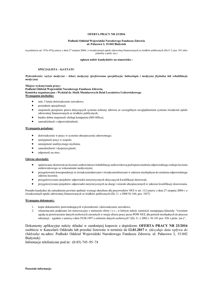 OFERTA PRACY NR 23/2016 Podlaski Oddział Wojewódzki Narodowego Funduszu Zdrowia ul. Pałacowa 3, 15-042 Białystok na podstawie art. 107a-107g ustawy z dnia 27 sierpnia 2004r. o świadczeniach opieki zdrowotnej finansowanych ze środków publicznych (Dz.U 5, poz. 581 tekst jednolity z późń, zm.) ogłasza nabór kandydatów na stanowisko : SPECJALISTA – 0,4 ETATU Wykształcenie: wyższe medyczne - lekarz medycyny (preferowana specjalizacja: balneologia i medycyna fizykalna lub rehabilitacja medyczna) Miejsce wykonywania pracy: Podlaski Oddział Wojewódzki Narodowego Funduszu Zdrowia, Komórka organizacyjna : Wydział ds. Służb Mundurowych Dział Lecznictwa Uzdrowiskowego Wymagania niezbędne: min. 3 letnie doświadczenie zawodowe; posiadanie specjalizacji; znajomość przepisów prawa dotyczących systemu ochrony zdrowia ze szczególnym uwzględnieniem systemu świadczeń opieki zdrowotnej finansowanych ze środków publicznych; bardzo dobra znajomość obsługi komputera (MS Office); samodzielność i odpowiedzialność. Wymagania pożądane: doświadczenie w pracy w systemie ubezpieczenia zdrowotnego; umiejętność pracy w zespole; umiejętność analitycznego myślenia; samodzielność i dyspozycyjność; odporność na stres. Główne obowiązki: opiniowanie skierowań na leczenie uzdrowiskowe/rehabilitację uzdrowiskową pod kątem ustalenia odpowiedniego rodzaju leczenia uzdrowiskowego ze wskazaniami medycznymi; przygotowanie korespondencji ze świadczeniodawcami i świadczeniobiorcami w zakresie niezbędnym do ustalenia odpowiedniego zakresu leczenia; przygotowywanie projektów odpowiedzi merytorycznych dotyczących kwalifikacji skierowań; przygotowywanie projektów odpowiedzi merytorycznych na skargi i wnioski ubezpieczonych w zakresie kwalifikacji skierowania. Ponadto kandydaci do zatrudnienia powinni spełniać wymogi określone dla pracowników NFZ w art. 112 ustawy z dnia 27 sierpnia 2004 r. o świadczeniach opieki zdrowotnej finansowanych ze środków publicznych (Dz. U. z 2008 Nr 164, poz. 1027) Wymagane dokumenty: 1. 2. kopie dokumentów potwierdzających wykształcenie i doświadczenie zawodowe, własnoręcznie podpisane list motywacyjny z numerem oferty i c.v., w którym należy zamieścić następującą klauzulę: "wyrażam zgodę na przetwarzanie danych osobowych zawartych w mojej ofercie pracy przez POW NFZ, dla potrzeb niezbędnych do procesu rekrutacji – zgodnie z ustawą z dnia 29.08.1997 o ochronie danych osobowych" (Dz. U. z 2002 r. Nr 101 poz. 926 z późn. zm.)”, Dokumenty aplikacyjne należy składać w zamkniętej kopercie z dopiskiem: OFERTA PRACY NR 23/2016 osobiście w Kancelarii Oddziału lub przesłać listownie w terminie do 12.01.2017 r. (decyduje data wpływu do Oddziału) na adres: Podlaski Oddział Wojewódzki Narodowego Funduszu Zdrowia, ul. Pałacowa 3, 15-042 Białystok) Informacje telefoniczne pod nr: (0-85) 745–95–74 Pozostałe informacje: Oferty z niepełnymi bądź niepodpisanymi dokumentami, niezgodne z wymogami zawartymi w ogłoszeniu oraz otrzymane po terminie nie będą rozpatrywane (liczy się data wpływu do Podlaskiego Oddziału Wojewódzkiego NFZ), Kandydaci zakwalifikowani zostaną powiadomieni o terminie rozmowy wstępnej, Zgodnie z art. 107d oraz 107f ustawy z dnia 27 sierpnia 2004 r. o świadczeniach opieki zdrowotnej finansowanych ze środków publicznych listę kandydatów spełniających wymogi formalne określone w ogłoszeniu o naborze oraz wynik naboru ogłasza się w Biuletynie Informacji Publicznej na stronie: www.nfz-bialystok.pl oraz na tablicy ogłoszeń Podlaskiego Oddziału Wojewódzkiego Narodowego Funduszu Zdrowia, Oferty osób, które nie zostały wybrane na dane stanowisko w procesie rekrutacji, zostaną komisyjnie zniszczone, Dyrektor Oddziału zastrzega sobie prawo do odwołania postępowania rekrutacyjnego w każdym czasie, bez podania przyczyny.