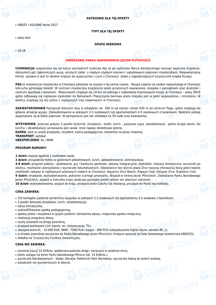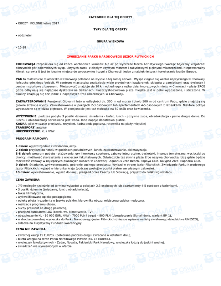 KATEGORIE DLA TEJ OFERTY ● OBOZY i KOLONIE letnie 2017 TYPY DLA TEJ OFERTY ● obóz letni GRUPA WIEKOWA ● 10-18 ZWIEDZANIE PARKU NARODOWEGO JEZIOR PLITVICKICH CHORWACJA rozpościera się od końca wschodnich krańców Alp aż po wybrzeże Morza Adriatyckiego tworząc bajeczny krajobraz: olbrzymich gór, tajemniczych wysp, ukrytych zatok z ciepłym czystym morzem i zabytkowymi pięknymi miasteczkami. Niepowtarzalny klimat sprawia iż jest to idealne miejsce do wypoczynku i czyni z Chorwacji jeden z najpiękniejszych turystycznie krajów Europy. PAG to malownicze miasteczko w Chorwacji położone na wyspie o tej samej nazwie. Wyspa ciagnie się wzdłuż najwyższego w Chorwacji łańcucha górskiego Velebit. W centrum miasteczka znajdziecie wiele przytulnych kawiarenek, sklepów z pamiątkami oraz dyskotek i centrum sportowe z basenem. Miejscowość znajduje się 10 km od jednego z najbardziej imprezowych miejsc w Chorwacji – plaży ZRCE gdzie odbywają się najlepsze dyskoteki na Bałkanach. Piaszczysto-żwirowa plaża miejska jest w pełni wyposażona, i strzeżona. W okolicy znajdują się też jedne z najlepszych tras rowerowych w Chorwacji. ZAKWATEROWANIE Pensjonat Giovanni leży w odległości ok. 300 m od morza i około 500 m od centrum Pagu, gdzie znajdują się główne atrakcje wyspy. Zakwaterowanie w pokojach 2-3 osobowych lub apartamentach 4-5 osobowych z łazienkami. Niektóre pokoje wyposażone są w łóżka piętrowe. W pensjonacie jest też stołówka na 50 osób oraz kawiarenka. WYŻYWIENIE: podczas pobytu 3 posiłki dziennie: śniadania - bufet, lunch - pożywna zupa, obiadokolacja - pełne drugie danie. Do lunchu i obiadokolacji serwowana jest woda. Inne napoje dodatkowo płatne. KADRA: pilot w czasie przejazdu, rezydent, kadra pedagogiczna, ratownika na plaży miejskiej TRANSPORT: autokar UBEZPIECZENIE: KL i NNW PROGRAM RAMOWY: 1 dzień: wyjazd zgodnie z rozkładem jazdy. 2 dzień: przyjazd do hotelu w godzinach południowych, lunch, zakwaterowanie, aklimatyzacja. 3-8 dzień: program pobytu - plażowanie, gry i konkursy sportowe, zabawy integracyjne, dyskoteki, imprezy tematyczne, wycieczki po okolicy, możliwość skorzystania z wycieczek fakultatywnych. Odwiedzicie też słynna plażę Zrce nazywą chorwacką Ibizą gdzie będzie możliwość zabawy w najlepszych plażowych kubach w Chorwacji: Aquarius Zrce Beach, Papaya Club, Kalypso Zrce, Euphoria Club. 9 dzień: śniadanie, wykwaterowanie, pobranie suchego prowiantu. Wyjazd w stronę Jezior Plitvickich. Zwiedzanie Parku Narodowego Jezior Plitvickich, wyjazd w kierunku kraju (podczas postojów posiłki płatne we własnym zakresie). 10 dzień: wykwaterowanie, wyjazd do kraju, przejazd przez Czechy lub Słowację, przyjazd do Polski wg rozkładu. CENA ZAWIERA: ● ● ● ● ● ● ● ● ● ● ● 7/9 noclegów (zależnie od terminu wyjazdu) w pokojach 2,3 osobowych lub apartamenty 4-5 osobowe z łazienkami, 3 posiłki dziennie (śniadanie, lunch, obiadokolacja), taksa klimatyczna, wykwalifikowaną opiekę pedagogiczną, opiekę pilota i rezydenta w języku polskim, kierownika obozu, miejscowa opieka medyczna, realizacja programu obozu, suchy prowiant na drogę powrotną, przejazd autokarem LUX (barek, wc, klimatyzacja, TV), ubezpieczenie KL - 10 000 EUR, NNW - 7000 PLN i bagaż – 800 PLN (ubezpieczenie Signal Iduna, wariant BP_1), w drodze powrotnej wycieczka do Parku Narodowego Jezior Plitvickich (miejsce wpisane na listę światowego dziedzictwa UNESCO), składka na Turystyczny Fundusz Gwarancyjny. CENA NIE ZAWIERA: ● ● ● ● zwrotnej kaucji 15 EUR/os. (pobierana podczas drogi i zwracana w ostatnim dniu), biletu wstępu na teren Parku Narodowego Plitvice (ok. 15 EUR/os.), wycieczek fakultatywnych - Zadar, Novalja, Paklenicki Park Narodowy, wycieczka łodzią do jaskini wodnej, świadczeń nie wymienionych w ofercie. Zapytaj o rabat przy łączeniu turnusów WAŻNE INFORMACJE: ● ● ● ● ● ● ● ● ● prosimy o zabranie karty kolonijno - obozowej z nr PESEL, ważnego dowodu osobistego lub paszportu, ponadto odpowiedniej odzieży i obuwia (obuwie sportowe i obuwie do wędrówek górskich), kostiumu kąpielowego, klapek, nakrycia głowy, kremu z filtrem do opalania, okularów przeciwsłonecznych, przyborów higienicznych, dwóch ręczników, małego plecaka, ochrony przeciwdeszczowej bagaż prosimy zapakować do miękkich toreb - wykluczone twarde walizy. Ilość bagażu ograniczona! (bagaż podręczny i jedna torba). Duże, twarde walizy zajmują przestrzeń w pokojach. prosimy o zaopatrzenie uczestników w podstawowe leki (przeziębienie, ból gardła, uczulenia, środki na oparzenia słoneczne) oraz leki które dziecko zażywa podane miejsca zbiórek i wyjazdów zależeć będą od ilości chętnych oraz sprzedaży na poszczególnych turnusach, podane zostaną na stronie www.turystyka.edu.pl na 72h przed wyjazdem. Prosimy o kontakt z biurem, celem potwierdzenia dokładnego miejsca i godziny na 2 dni przed wyjazdem na trasach krajowych dojazdowych (tzw. antenkach) istnieje możliwość przejazdu mikrobusem lub samochodem osobowym oraz możliwość związanych z tym ewentualnych przesiadek. Biuro zastrzega sobie możliwość odwołania bez żadnych konsekwencji transportu z danej miejscowości w przypadku zbyt małej ilości uczestników (min. 6 osób) zbiórka uczestników 15 minut wcześniej przed godziną odjazdu. Godziny odjazdów i powrotów są uzależnione od warunków drogowych wycieczki fakultatywne odbywają się przy zebraniu wymaganej ilości uczestników obowiązują warunki uczestnictwa organizatora imprezy najczęściej zadawane pytania FAQ Możliwe terminy wyjazdu Lp. Data początku Data końca Cena Wolne miejsca 1. 01-07-2017 12-07-2017 1700 zł powyżej 5 miejsc 2. 10-07-2017 21-07-2017 1700 zł powyżej 5 miejsc 3. 19-07-2017 30-07-2017 1700 zł powyżej 5 miejsc 4. 28-07-2017 06-08-2017 1460 zł powyżej 5 miejsc 5. 04-08-2017 13-08-2017 1460 zł powyżej 5 miejsc