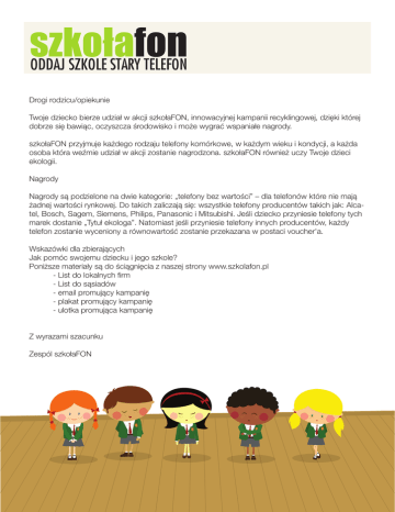 ODDAJ SZKOLE STARY TELEFON Drogi rodzicu/opiekunie Twoje dziecko bierze udział w akcji szkołaFON, innowacyjnej kampanii recyklingowej, dzięki której dobrze się bawiąc, oczyszcza środowisko i może wygrać wspaniałe nagrody. szkołaFON przyjmuje każdego rodzaju telefony komórkowe, w każdym wieku i kondycji, a każda osoba która weźmie udział w akcji zostanie nagrodzona. szkołaFON również uczy Twoje dzieci ekologii. Nagrody Nagrody są podzielone na dwie kategorie: „telefony bez wartości” – dla telefonów które nie mają żadnej wartości rynkowej. Do takich zaliczają się: wszystkie telefony producentów takich jak: Alcatel, Bosch, Sagem, Siemens, Philips, Panasonic i Mitsubishi. Jeśli dziecko przyniesie telefony tych marek dostanie „Tytuł ekologa”. Natomiast jeśli przyniesie telefony innych producentów, każdy telefon zostanie wyceniony a równowartość zostanie przekazana w postaci voucher'a. Wskazówki dla zbierających Jak pomóc swojemu dziecku i jego szkole? Poniższe materiały są do ściągnięcia z naszej strony www.szkolafon.pl - List do lokalnych firm - List do sąsiadów - email promujący kampanię - plakat promujący kampanię - ulotka promująca kampanię Z wyrazami szacunku Zespól szkołaFON