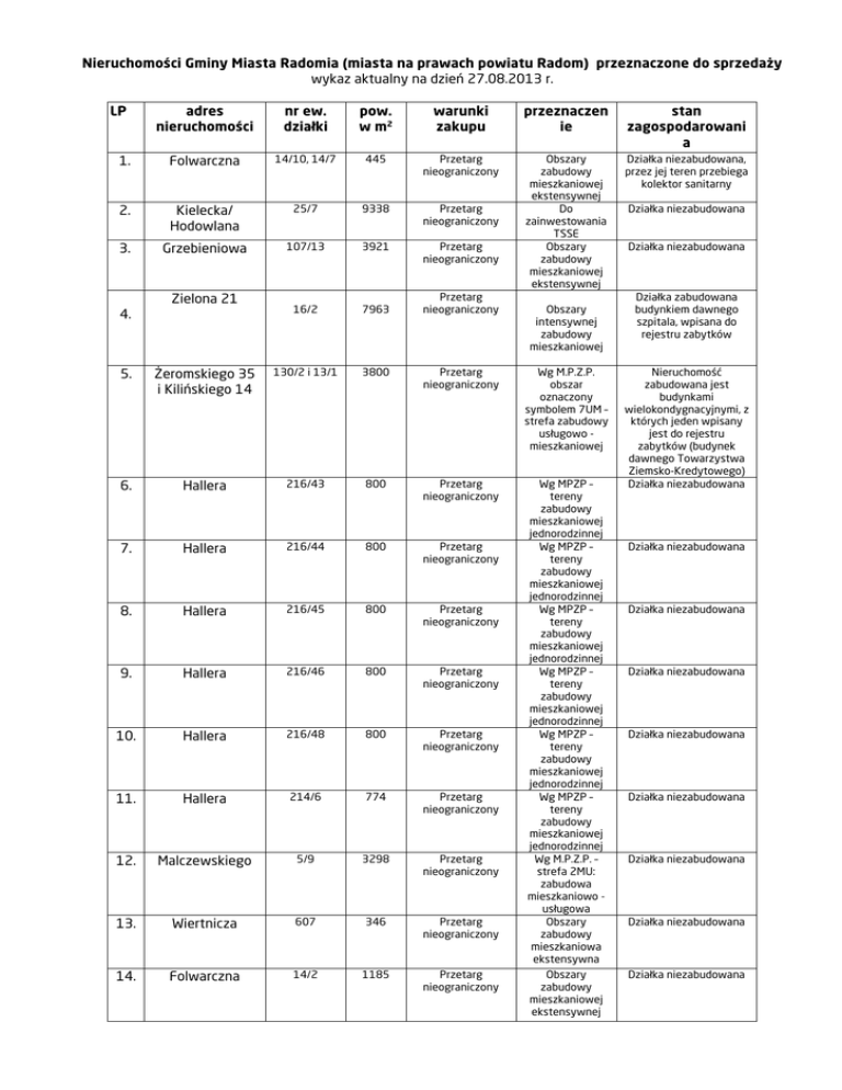 Nieruchomości Gminy Miasta Radomia (miasta na prawach powiatu Radom) przeznaczone do sprzedaży wykaz aktualny na dzień 27.08.2013 r. adres nieruchomości nr ew. działki pow. w m2 warunki zakupu przeznaczen ie stan zagospodarowani a 1. Folwarczna 14/10, 14/7 445 Przetarg nieograniczony Działka niezabudowana, przez jej teren przebiega kolektor sanitarny 2. Kielecka/ Hodowlana 25/7 9338 Przetarg nieograniczony 3. Grzebieniowa 107/13 3921 Przetarg nieograniczony Obszary zabudowy mieszkaniowej ekstensywnej Do zainwestowania TSSE Obszary zabudowy mieszkaniowej ekstensywnej 16/2 7963 LP Zielona 21 4. Przetarg nieograniczony Obszary intensywnej zabudowy mieszkaniowej 5. Żeromskiego 35 i Kilińskiego 14 130/2 i 13/1 3800 Przetarg nieograniczony Wg M.P.Z.P. obszar oznaczony symbolem 7UM – strefa zabudowy usługowo mieszkaniowej 6. Hallera 216/43 800 Przetarg nieograniczony 7. Hallera 216/44 800 Przetarg nieograniczony 8. Hallera 216/45 800 Przetarg nieograniczony 9. Hallera 216/46 800 Przetarg nieograniczony 10. Hallera 216/48 800 Przetarg nieograniczony 11. Hallera 214/6 774 Przetarg nieograniczony 12. Malczewskiego 5/9 3298 Przetarg nieograniczony 13. Wiertnicza 607 346 Przetarg nieograniczony Wg MPZP – tereny zabudowy mieszkaniowej jednorodzinnej Wg MPZP – tereny zabudowy mieszkaniowej jednorodzinnej Wg MPZP – tereny zabudowy mieszkaniowej jednorodzinnej Wg MPZP – tereny zabudowy mieszkaniowej jednorodzinnej Wg MPZP – tereny zabudowy mieszkaniowej jednorodzinnej Wg MPZP – tereny zabudowy mieszkaniowej jednorodzinnej Wg M.P.Z.P. – strefa 2MU: zabudowa mieszkaniowo usługowa Obszary zabudowy mieszkaniowa ekstensywna 14. Folwarczna 14/2 1185 Przetarg nieograniczony Obszary zabudowy mieszkaniowej ekstensywnej Działka niezabudowana Działka niezabudowana Działka zabudowana budynkiem dawnego szpitala, wpisana do rejestru zabytków Nieruchomość zabudowana jest budynkami wielokondygnacyjnymi, z których jeden wpisany jest do rejestru zabytków (budynek dawnego Towarzystwa Ziemsko-Kredytowego) Działka niezabudowana Działka niezabudowana Działka niezabudowana Działka niezabudowana Działka niezabudowana Działka niezabudowana Działka niezabudowana Działka niezabudowana Działka niezabudowana 15. 25 Czerwca 18 34 1854 Przetarg nieograniczony 16. Niedziałkowskiego 26 104/1 4112 Przetarg nieograniczony 17. Kilińskiego 9 49/4 1896 Przetarg nieograniczony 18. Otwarta 259/23 738 Przetarg nieograniczony 19. Kilińskiego 20 /Żeromskiego 17/2,17/3 2561 Przetarg nieograniczony 20. 25 Czerwca 50 57 524 Przetarg nieograniczony 21. Hallera 214/19 i 214/21 1526 Przetarg nieograniczony 22. Miła 13 12 596 Przetarg nieograniczony 23. Wapienna 5/8 1845 Przetarg nieograniczony 24. Wapienna 5/10 390 Przetarg nieograniczony 25. Wapienna 5/21 1651 Przetarg nieograniczony 26. Wapienna 5/12 1134 Przetarg nieograniczony 27. Wapienna 5/15 873 Przetarg nieograniczony Strefa o symbolu MS – zabudowa śródmiejska, strefa ochrony konserwatorskie j, obiektów zabytkowych Zabudowa śródmiejska z ciągami usługowymi Wg M.P.Z.P. – strefa 2UM (zabudowa usługowo – mieszkaniowa) Wg MPZP – strefa zabudowy mieszkaniowej o niskiej intensywności Wg MPZP – strefa zabudowy usługowo mieszkaniowej, strefa ochrony konserwatorskie j Wg MPZP – strefa o symbolu 1.4 UM – strefa terenów usługowo – mieszkaniowych WG MPZP – tereny zabudowy mieszkaniowej jednorodzinnej Strefa oznaczona symbolem MS – zabudowa śródmiejska Wg Studium uwarunkowań i kierunków zagospodarowan ia Gminy: tereny urządzeń obsługi miasta, w tym komunikacji i infrastruktury Wg Studium uwarunkowań i kierunków zagospodarowan ia Gminy: tereny urządzeń obsługi miasta, w tym komunikacji i infrastruktury Wg Studium uwarunkowań i kierunków zagospodarowan ia Gminy: tereny urządzeń obsługi miasta, w tym komunikacji i infrastruktury Zabudowa mieszkaniowa ekstensywna Zabudowa mieszkaniowa ekstensywna Udział w nieruchomości zabudowanej wpisanej do rejestru zabytków (2896/13950 części w nieruchomości) Udział w nieruchomości zabudowanej (5653/13752 części w nieruchomości) Udział w nieruchomości zabudowanej (229/1562 części w nieruchomości) Nieruchomość niezabudowana Nieruchomość zabudowana budynkami wielokondygnacyjnymi, oficyny wpisane do rejestru zabytków Udział w nieruchomości zabudowanej (1/2 części w nieruchomości) Nieruchomość niezabudowana Udział w nieruchomości zabudowanej (1/2 w części nieruchomości) Działka niezabudowana Działka niezabudowana Działka niezabudowana Działka niezabudowana Działka niezabudowana 28. Wapienna 5/19 1061 Przetarg nieograniczony Zabudowa mieszkaniowa ekstensywna Działka niezabudowana 29. Opoczyńska 611/18 661 Przetarg nieograniczony Zabudowa mieszkaniowa ekstensywna MN Działka niezabudowana 30. Górnicza 114/10, 126/32 3057 Przetarg nieograniczony Pod garaże Teren po parkingu strzeżonym – ogrodzony 31. Rwańska 2/4 76, 77 1895 Przetarg nieograniczony Nieruchomość zabudowana budynkami wpisanymi do rejestru zabytków 32. Czachowskiego 13 120 1119 Przetarg nieograniczony Wg MPZP strefa 5UM –usługi i mieszkalnictwo o dużej intensywności zabudowy Wg MPZP – tereny mieszkaniowo usługowe 33. Koszarowa 9 56, 57 854 Przetarg nieograniczony 34. Sadkowska 225/1 3942 Przetarg nieograniczony 35. Struga/ Grzybowska 180/2 2296 Przetarg nieograniczony 36. Jana III Sobieskiego 109/62 5790 Przetarg nieograniczony 37. Kielecka/ Wośnicka 275/1 275/2 275/3 275/4 275/5 275/6 275/7 275/8 275/9 275/10 275/11 275/12 275/13 275/14 275/15 275/16 275/17 275/18 275/20 16551 14151 11372 10278 10970 11014 13608 13773 3010 3010 3010 3010 3010 3010 3010 3010 3010 26725 17589 Przetarg nieograniczony 38. Goszczewicka 399/2, 399/3, 399/4 1881 Przetarg nieograniczony Wróblewskiego 10 113 595 39. Przetarg nieograniczony Czarnoleska 214/23 3881 Przetarg nieograniczony 40. Strefa oznaczona symbolem MS – zabudowa śródmiejska Teren do zainwestowania Udział (1/2) w nier