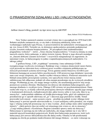 O PRAWDZIWYM DZIAèANIU LSD i HALUCYNOGENÓW Arthur Janov's blog, posted: 19 Apr 2012 04:19 AM PDT tøum. Robert TULO Wa kiewicz New Yorker zamie ciø ostatnio wywiad z kim , kto w pocz tkach lat 1970 braø LSD. Bohater artykuøu zastanawia si , co si staøo z dzisiejsz møodzie , która woli wytøumiaj ce narkotyki typu Prozac, w przeciwie stwie do narkotyków otwieraj cych, jak np. tzw. kwas (LSD). Twierdzi on, e dzisiejsze spoøecze stwo przestaøo podejmowa ryzyko, kosztem szukania bezpiecze stwa. „W pocz tkach (lata siedemdziesi te) pragn li my wolno ci” – mówi. „Teraz chcemy bezpiecze stwa.” Uwa a t zmian za znak naszych czasów, który pokazuje, w jakim wiecie yjemy. Brzmi w jego søowach nostalgia za „starymi dobrymi czasami na kwasie” i oczywi cie marginalizuje on zagro enia. Ja natomiast wiem, e halucynogeny to jedne z najniebezpieczniejszych narkotyków. Co takiego robi ? Z grubsza bior c, LSD „wypøukuje” serotonin i inne substancje GABA (synaptycznego wychwytu zwrotnego). Redukuje wi c z miejsca skuteczno neuro-barier, czyli pozwala na zalewanie kory czoøowej przez wszelkie cierpienia poblokowane na ni szych poziomach systemu nerwowego. Kwas gamma-amino-butyrowy (GABA) jest blokerem hamuj cym uczucia bólów psychicznych. LSD przerywa jego dziaøanie i pozwala nam czu swoje cierpienia, ale... bardzo szybko wkracza odsiecz. Poniewa zniesienie tych blokad oznaczaøoby przeci enie systemu, owe specyficzne tre ci musz zosta zablokowane lub odø czone; jednak ich silna energia przedostaje si do wy szych o rodków mózgu. Wchøaniaj j one, nie maj c innego wyboru, ale uruchamiaj przeciw niej swoje poznawcze systemy obronne. Mechanizm ten dotyczy tak dziaøania halucynogenów, jak i naszego dziaøania w zwykøym yciu. Dlatego LSD zwiemy te psychotomimetykiem. Dana osoba robi wi c to, co ka dy czøowiek przeci ony dawnym wdrukiem: upycha jego energi w kontenerach dziwnych, rozbudowanych idei, jakie tworzy sobie w tym celu. Idee te s – musz by – maksymalnie oddalone od ródøa pierwotnego bólu, gdy ich zadaniem jest przedstawia go w sposób oderwany od „ja” i ukrywa jego prawdziwe ródøa. Temat przewodni tych emocji – samo uczucie czucia – przebija si jednak wy ej i dlatego tre halucynacji w pewien sposób odzwierciedla to, z czym usiøujemy sobie poradzi , nie wi c tego z wøasn osob lub przenosz c si w inny wymiar. „Kto usiøuje mnie zabi (nadchodzi mier ).” „Jaki potwór chce jej zrobi co strasznego (nie wiem co, ale to straszne).” „Czuj totaln jedno z Kosmosem, Bogiem (ziemskie sprawy mnie nie dotycz .)” Halucynacje te zjawiaj si nie tylko po narkotyku, ale mog wplata si w sny lub w materiaø naszych konstrukcji poj ciowych. Kiedy kto halucynuje poznawczo, tre tych halucynacji jest zawsze idiosynkratyczna dla danej osoby. Omamy te lub przekonania ust puj na chwil po podaniu trankwilizatora lub innego blokera – co znów wskazuje na zwi zek mi dzy nimi, a cierpieniem pierwotnym. Kora czoøowa to nasza ostatnia linia obrony: je li dawny ból grozi jej zalaniem, stajemy si psychotyczni aby nie zwariowa . Wchøoni cie w system przekona pot nej energii bólu pierwotnego nim dopadn nas te uczucia, mo e doprowadzi serce do zawaøu. To nie sam narkotyk wywoøuje halucynacje; to ból, któremu nie mo emy lub nie chcemy przypisa osobistego kontekstu, popycha nasze wy sze struktury mózgu do tej egzotycznej twórczo ci. Jest jaki kontekst, owszem, ale zwykle chodzi o bardzo wczesny wdruk, z którym nie wi e si konkretna scena traumatyczna. Jego prewerbalna siøa zagra a yciu, cho kora nie natrafia na adne wydarzenie, jakiego mogøaby si uchwyci . Je li za pierwszym razem miaøe po LSD dobry „lot”, to dlatego, e twój system barier byø do szczelny – le c jak pokrywa na garnku, przepu ciø tylko ladowe porcje bólu. Ale gdy kolejne dawki narkotyku zdj øy t pokryw , przyszøy zøe, koszmarne „loty”. Wizje te ksztaøtowaø terror i w ciekøo , wydostaj ce si z poziomu pnia mózgu. Mary dzienne (na jawie) to tylko mary nocne (koszmary senne) w wietle søo ca. Czy na odwrót, wszystko jedno. Koszmar jest koszmarem – tak w dzie , jak i w nocy. Fizjologia nie zmienia si z zachodem søo ca. Je li ból wdziera si w nieopanowany sposób, to dlatego, e przekonania, które mocuj si z emocjonalnymi wdrukami na zasadzie hu tawki, staj si zbyt søabe, by je dalej tøumi . Wtedy nie wiesz, co si z tob dzieje. Wrota neuronalne to nie „Wrota Percepcji” Huxsley'a. Wr cz przeciwnie. Blokuj one specyficzne percepcje, dopuszczaj c tylko te o charakterze globalnym, wtedy mamy „objawienia” bycia jednym z Kosmosem. Jednak w adnym momencie ycia nie jeste my jedno ci – ani samemu ze sob , ani ze Wszech wiatem. Nasz umysø rozpadø si na kawaøki i mo emy odzyska na nowo tylko kawaøki siebie. Mamy poczucie wyzwolenia z ciaøa czy zjednoczenia z Kosmosem dlatego, e na chwil zostaøa zdj ta tøumi ca ból pokrywa. To tak jakby terapia pierwotna w wielkim przyspieszeniu. Zamiast przebijania si do jednego uczucia za ka dym razem i integrowania go, masz wszystko naraz, wywalone na wierzch, a to dla systemu o wiele za wiele. Na dodatek brak ci wystarczaj cych do wiadcze z terapii, by zrozumie , co si z tob dzieje. Badania sprzed kilkudziesi ciu lat pokazuj , e mózg pod wpøywem LSD pracuje na znacznie wi kszej pr dko ci i zarazem znacznie mniejszej amplitudzie, co jest charakterystyczne dla zaøamania si systemu neuronalnych obron. W naszym o rodku monitorujemy pacjentów znajduj cych si na progu gø bokich, pozawerbalnych uczu i widzimy jak ich obrony rosn wraz z neuronaln amplitud ; a kiedy zaøamuj si one z chwil przekroczenia progu, zaøamuje si i amplituda. Skutki okoøo dziesi ciokrotnego za ycia LSD ci gn si latami: trudno ci ze snem, z koncentracj , potrzeba trankwilizatorów, zmienno nastrojów, psychozy – by wymieni tylko kilka. Niebezpiecze stwo kuracji za pomoc narkotyków czy rebirthingu le y w tym, e przedwcze nie, bez przygotowania i wi
