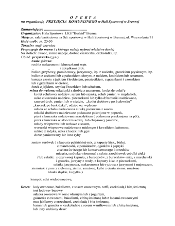 O F E RT A na organizację PRZYJĘCIA KOMUNIJNEGO w Hali Sportowej w Brennej Zamawiający: ............................................. Organizator: Hala Sportowa LKS ”Beskid” Brenna Miejsce: sala bankietowa na Sali sportowej w Hali Sportowej w Brennej, ul. Wyzwolenia 71 Ilość osób: ok. 25-30 Termin: maj/ czerwiec Propozycje do menu ( z którego należy wybrać właściwe danie) Na stołach: owoce, zimne napoje, drobne ciasteczka, czekoladki, itp. Obiad: przystawka ( j.n.) danie główne: rosół z makaronem i kluseczkami wątr. „ „ i żołądkami drob. bulion grzybowy, pomidorowy, jarzynowy, itp. z zacierką, groszkiem ptysiowym, itp. bulion z uszkami lub z paluszkiem słonym, z makiem, kminkiem lub sezamem, barszcz czysty z jajkiem i krokietem, pasztecikiem, z grzankami i czosnkiem lub z grzankami w cieście, żurek z jajkiem, szynką i boczkiem lub schabem, mięsa do wyboru: eskalopki z drobiu z ananasem, kotlet de volai’e kotlet schabowy nadziew. serem lub szynką, schab panier. w migdałach, udko z kurczaka nadziew. pieczarkami lub tylko d5ramstiki nadziewane, sznycel drob. panier. lub w cieście, „kotlet drobiowy po żydowsku” „karczek po beskidzku”, udziec wp wędzony rolada ze schabu nadziewana śliwką podawana z sosem roladki drobiowe nadziewane podawane pokrojone w poprzek, pierś z kurczaka nadziewana szaszłykiem ( podawana przekrojona na pół), pierś z kurczaka w słonecznikowej lub chipsowej panierce, rolady wieprzowe lub wołowe z sosem, woreczki wieprzowe nadziewane mielonym i kawałkiem kabanosa, udziec z indyka, udka z kaczki lub gęsi dorsz panierowany lub inne ryby zestaw surówek ( z kapusty pekińskiej-mix, z kapusty kisz., białej, z marchewki, z pomidorów, ogórków i papryki z selera świeżego lub konserwowanego i orzechów mizeria, surówka wiosenna( z sałaty, rzodkiewek cebulki ziel.) i/lub sałatki: z czerwonej kapusty, z buraczków, z buraczków- mix, z marchewki i groszku, jarzyny z wody, z kapusty kisz. z pieczarkami, sałatka jarzynowa, makaronowa lub ryżowa z jarzynami i majonezem, ziemniaki ( pure z zieleniną, ziemn. smażone, kulki z ciasta ziemn. smażone kluski śląskie, kopytka ) kompot, soki wieloowocowe, Deser: lody owocowe, bakaliowe, z sosem owocowym, toffi, czekoladą i bitą śmietaną tort lodowo- bezowy sałatka owocowa w sosie własnym lub z jogurtem, galaretka z owocami, bakaliami, z bitą śmietaną lub z lodami owocowymi mus jabłkowy z orzechami, czekoladą i bitą śmietaną, banan lub gruszka w czekoladzie z sosem waniliowym lub z bitą śmietaną, lub inny ulubiony deser - 2 kawa/ herbata tor, ciasta, ciasteczka różne (wg upodobań) Zimna płyta: szynki lux, szynka z chrzanem, nec, sery żółte mix, sery pleśniowe, jajka nadziew. tymbaliki, koreczki, warzywa, pomidory lub ogórki nadziewane, sałatki mix z majonezem lub sosem różnym ( gdzie podstawą może być: kalafior, brokuł, sałata lodowa, fasolka szparag. pieczarki, kurczak pieczony lub wędzony, ryż, makaron, itp. wg upodobań ) rolada z sera żółtego, rolada ze szpinaku, koreczki śledziowe, śledzie w śmietanie lub sałatka śledziowa, Kolacja ( II gorący posiłek): można wybrać mięsa w/w z dodatkami ( sałatką) lub danie „jednogarnkowe”: lub np. paprykarz, suropieki wp. gulasz z pieczarkami, danie meksykańskie, danie sycylijskie, danie beskidzkie lub wg zamówienia W/w dania są daniami przykładowymi z możliwością przyjęcia innych propozycji. Można również zaplanować: -przystawkę: „małe co nieco”: szaszłyk owocowy lub sałatka owocowa mini sałatki różne ( wielowarzywna, z tuńczykiem, serem żółtym,wędliną, itp.) koreczki śledziowe, mini kanapki na pieczywie ( chleb tostowy, razowy, pumpernikiel, krakersy lub bez pieczywa, np. na liściu ), z łososiem, mozarellą, pastami mix, jarzynami, pieczarkami, jajkami nadziew. itp. wg uzgodnień lub inne „pomysły” żywieniowe. Wysokość cen uzależniona jest od zamówionego menu Po zdecydowaniu się na skorzystanie z w/w oferty należy wpłacić zadatek w wysokości ok. 300,-zł na rezerwację terminu organizacji przyjęcia- gotówką lub przelewem na konto bankowe i adres Hali Sportowej w Brennej. Wszelkie uzgodnienia spisujemy w umowie w terminie jednego miesiąca przed przyjęciem. Organizator zobowiązuje się do dołożenia wszelkich starań, aby Przyjęcie Komunijne w Hali Sportowej w Brennej spełniło oczekiwania i uświetniło cały dzień i aby był on niezapomnianym przeżyciem dla wszystkich uczestników tego święta a zwłaszcza dla dziecka przyjmującego Pierwszą Komunię Świętą. ZAPRASZAMY ! ________________________________________________________________ Dla informacji podajemy, że nie przyjmujemy organizacji imprez z własnymi ciastami, napojami, itp. ze względu na przepisy SANEPID-u i HACCAP-u.