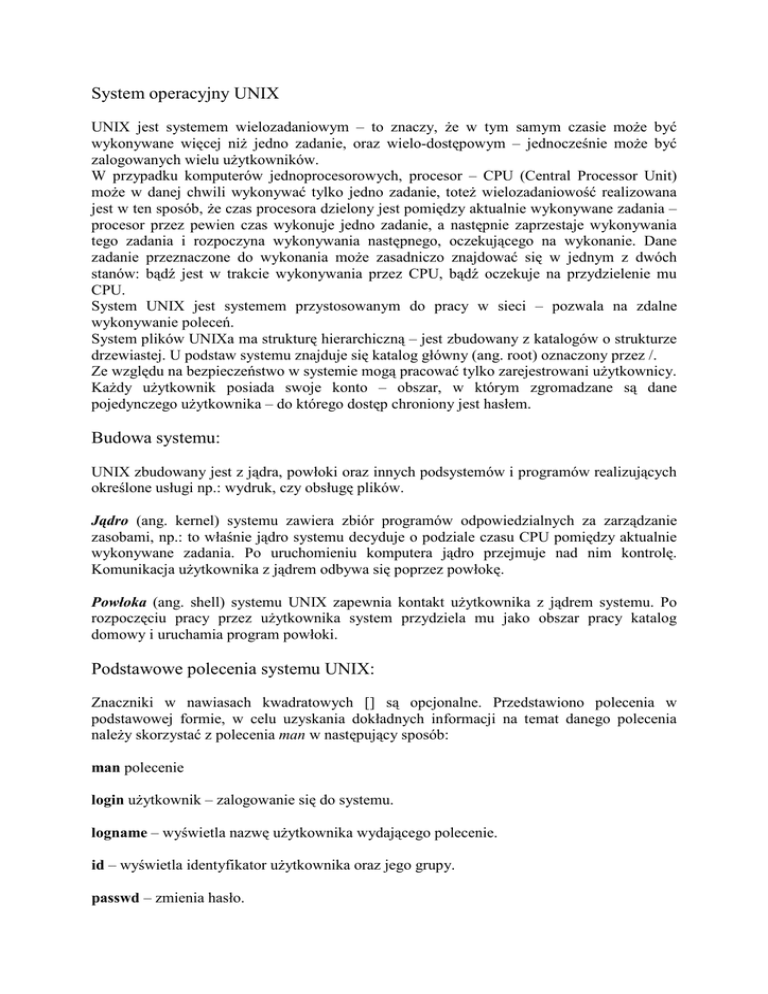 System operacyjny UNIX UNIX jest systemem wielozadaniowym – to znaczy, Ŝe w tym samym czasie moŜe być wykonywane więcej niŜ jedno zadanie, oraz wielo-dostępowym – jednocześnie moŜe być zalogowanych wielu uŜytkowników. W przypadku komputerów jednoprocesorowych, procesor – CPU (Central Processor Unit) moŜe w danej chwili wykonywać tylko jedno zadanie, toteŜ wielozadaniowość realizowana jest w ten sposób, Ŝe czas procesora dzielony jest pomiędzy aktualnie wykonywane zadania – procesor przez pewien czas wykonuje jedno zadanie, a następnie zaprzestaje wykonywania tego zadania i rozpoczyna wykonywania następnego, oczekującego na wykonanie. Dane zadanie przeznaczone do wykonania moŜe zasadniczo znajdować się w jednym z dwóch stanów: bądź jest w trakcie wykonywania przez CPU, bądź oczekuje na przydzielenie mu CPU. System UNIX jest systemem przystosowanym do pracy w sieci – pozwala na zdalne wykonywanie poleceń. System plików UNIXa ma strukturę hierarchiczną – jest zbudowany z katalogów o strukturze drzewiastej. U podstaw systemu znajduje się katalog główny (ang. root) oznaczony przez /. Ze względu na bezpieczeństwo w systemie mogą pracować tylko zarejestrowani uŜytkownicy. KaŜdy uŜytkownik posiada swoje konto – obszar, w którym zgromadzane są dane pojedynczego uŜytkownika – do którego dostęp chroniony jest hasłem. Budowa systemu: UNIX zbudowany jest z jądra, powłoki oraz innych podsystemów i programów realizujących określone usługi np.: wydruk, czy obsługę plików. Jądro (ang. kernel) systemu zawiera zbiór programów odpowiedzialnych za zarządzanie zasobami, np.: to właśnie jądro systemu decyduje o podziale czasu CPU pomiędzy aktualnie wykonywane zadania. Po uruchomieniu komputera jądro przejmuje nad nim kontrolę. Komunikacja uŜytkownika z jądrem odbywa się poprzez powłokę. Powłoka (ang. shell) systemu UNIX zapewnia kontakt uŜytkownika z jądrem systemu. Po rozpoczęciu pracy przez uŜytkownika system przydziela mu jako obszar pracy katalog domowy i uruchamia program powłoki. Podstawowe polecenia systemu UNIX: Znaczniki w nawiasach kwadratowych [] są opcjonalne. Przedstawiono polecenia w podstawowej formie, w celu uzyskania dokładnych informacji na temat danego polecenia naleŜy skorzystać z polecenia man w następujący sposób: man polecenie login uŜytkownik – zalogowanie się do systemu. logname – wyświetla nazwę uŜytkownika wydającego polecenie. id – wyświetla identyfikator uŜytkownika oraz jego grupy. passwd – zmienia hasło. echo [tekst] – wyświetla podany tekst. uname – wyświetla informacje o systemie pwd – wyświetla nazwę aktualnego katalogu roboczego. cd [katalog] – przejście do danego katalogu, polecenie to wywołane bez nazwy katalogu spowoduje przejście do katalogu domowego uŜytkownika, natomiast wywołanie polecenia cd .. spowoduje przejście do katalogu wyŜej. ls [-al] [plik/katalog] – wyświetla zawartość danego katalogu. -a – wyświetlane są wszystkie pliki i katalogi (równieŜ pliki ukryte). -l – wyświetlane są szczegółowe informacje na temat plików i katalogów. whoami – wyświetla informacje o bieŜącym uŜytkowniku. who – wyświetla informacje o wszystkich zalogowanych uŜytkownikach. grep [wzorzec] plik – wyświetla linie z pliku zawierające dany wzorzec. find [ścieŜka...][opcje] – szuka określonych plików na danej ścieŜce. Polecenia dotyczące pracy z plikami: chmod [opcje] prawa plik – zmiana praw dostępu do pliku. Istnieją trzy rodzaje praw oraz trzy klasy uŜytkowników. Stosowane są następujące oznaczenia: a lub brak u g o r w x + = wszyscy uŜytkownicy. właściciel grupa pliku inni prawo do czytania prawo do zapisu prawo do wykonywania dodanie prawa odebranie prawa odebranie wszystkich praw prócz podanego Przykład uŜycia: chmod go+rx moj_plik nadaje grupie i innym prawa czytania i wykonywania pliku moj_plik. chown [opcje] uŜytkownik plik – zmiana właściciela pliku. Tworzenie plików: touch moj_plik – tworzy pusty plik. vi moj_plik – edytuje moj_plik przy wykorzystaniu edytora tekstowego vi. JeŜeli plik moj_plik istnieje jest edytowany w edytorze vi, jeŜeli nie istnieje jest tworzony i edytowany. Inne polecenia do pracy z plikami: more [plik] – wyświetla jeden lub więcej plików ekran po ekranie. less plik – wyświetla plik tekstowy pozwalając na jego przewijanie wstecz. ln [opcje] nazwa_obecna nazwa_nadawana – utworzenie łącznika do pliku. Niektóre opcje: -f tworzy łączniki bez pytania uŜytkownika -n jeŜeli nowa nazwa juŜ istnieje to nie tworzy łącznika -s tworzenia symbolicznego łączenia cp [opcje] źródła przeznaczenie – kopiuje pliki i katalogi. Niektóre opcje: -r kopiuje rekurencyjnie -p zachowuje uprawnienia kopiowanego pliku mv [opcje] źródło przeznaczenie – przenosi pliki do katalogu. mv [opcje] plik1 plik2 – zmienia nazwę pliku. rm [opcje] plik/katalog – usuwa jeden lub więcej plików lub katalogów Niektóre opcje: -i -f -r przed usunięciem kaŜdego pliku naleŜy odpowiedzieć na pytanie potwierdzające wykonanie polecenia usuwanie pliku bez Ŝadnego uprzedzenia najpierw usuwa całą zawartość katalogu a na koniec usuwa równieŜ sam katalog mkdir [opcje] katalog – tworzy katalog rmdir [opcje] katalog – usuwa katalog mvdir źródło przeznaczenie – przenosi katalog wraz z podkatalogami. cat [pliki] – wyświetla zawartość pliku lub plików. Polecenia związane z procesami: ps [opcje] – wyświetla listę działających procesów. Niektóre opcje: brak -a wyświetla listę procesów bieŜącego uŜytkownika wyświetla listę procesów wszystkich uŜytkowników kill [opcje] identyfikator_procesu – wysyła sygnał zakończenia do procesu o podanym identyfikatorze killall [opcje] procesy - wysyła sygnał zakończenia do wszystkich procesów o wspólnej nazwie Obsługa poczty: pine – program do obsługi poczty.